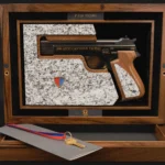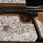 The pistol’s blued finish catches the eye, and the wooden grips are adorned with an inlaid medallion or emblem celebrating the 200th anniversary. The same commemoration is elegantly etched onto the slide, showcasing the meticulous attention to detail and craftsmanship synonymous with the P210 model. Renowned for its exceptional accuracy, the P210 “200 Year Canton Ticino” edition holds additional allure for collectors due to its limited production range and profound historical significance.