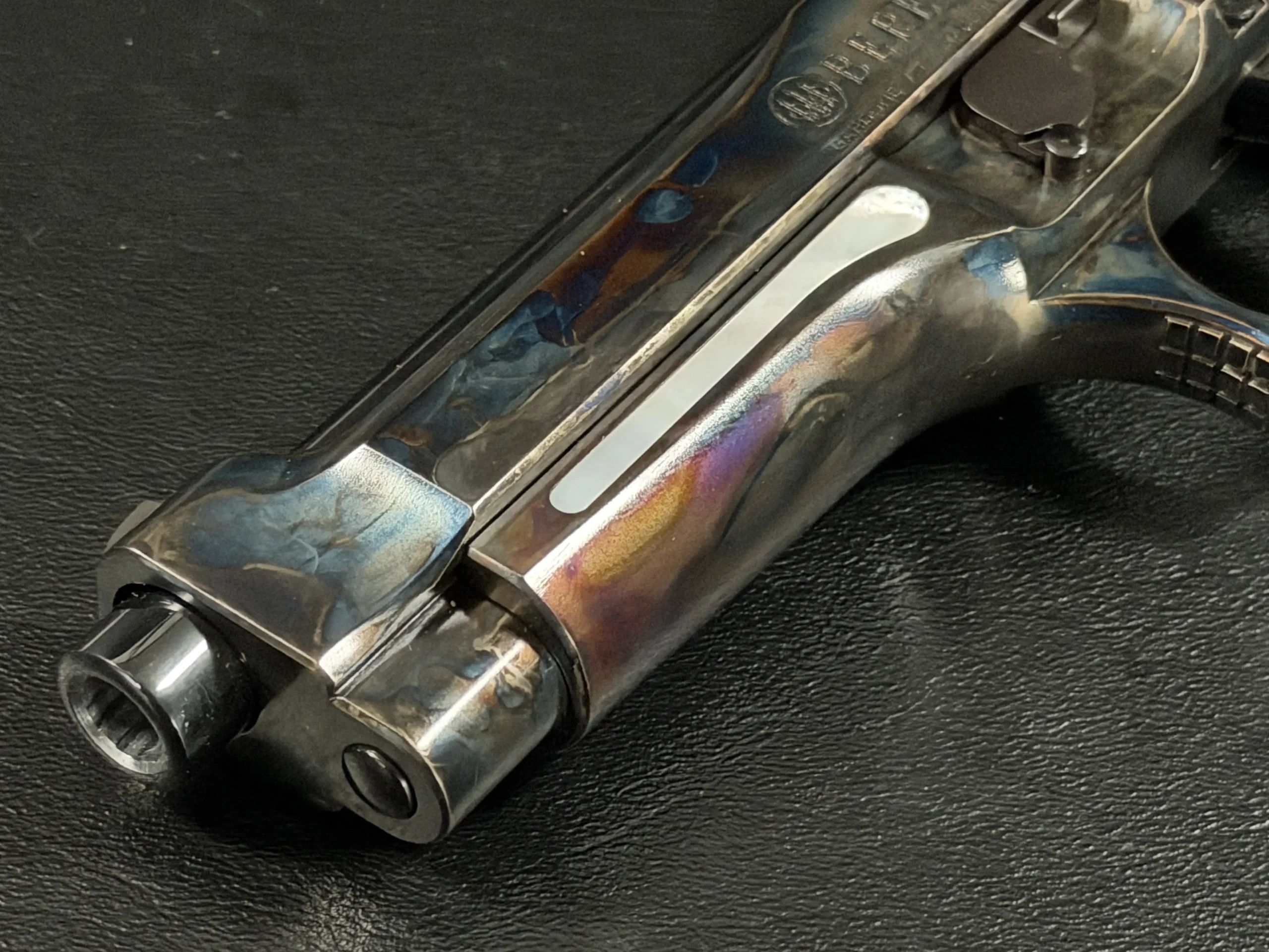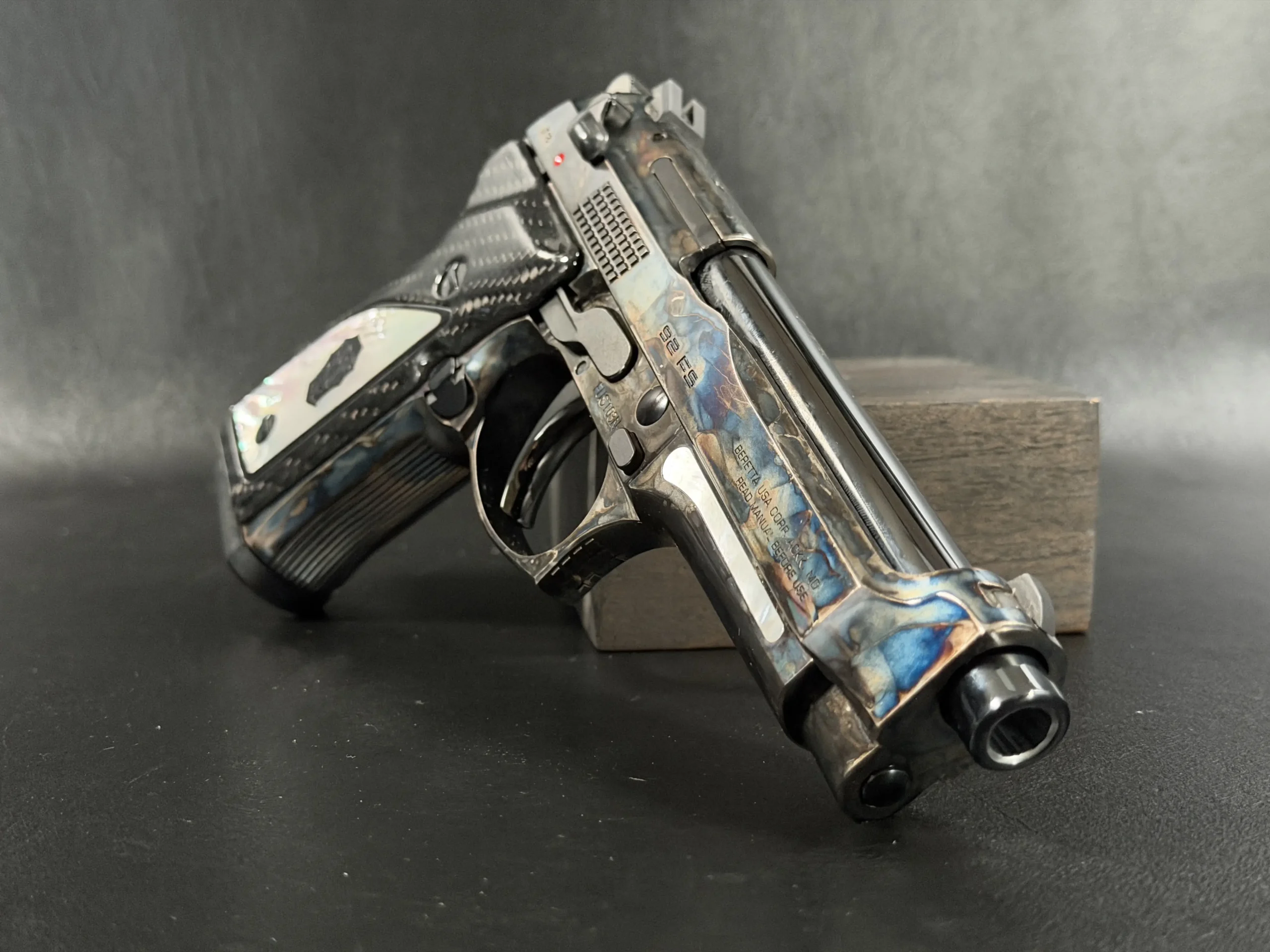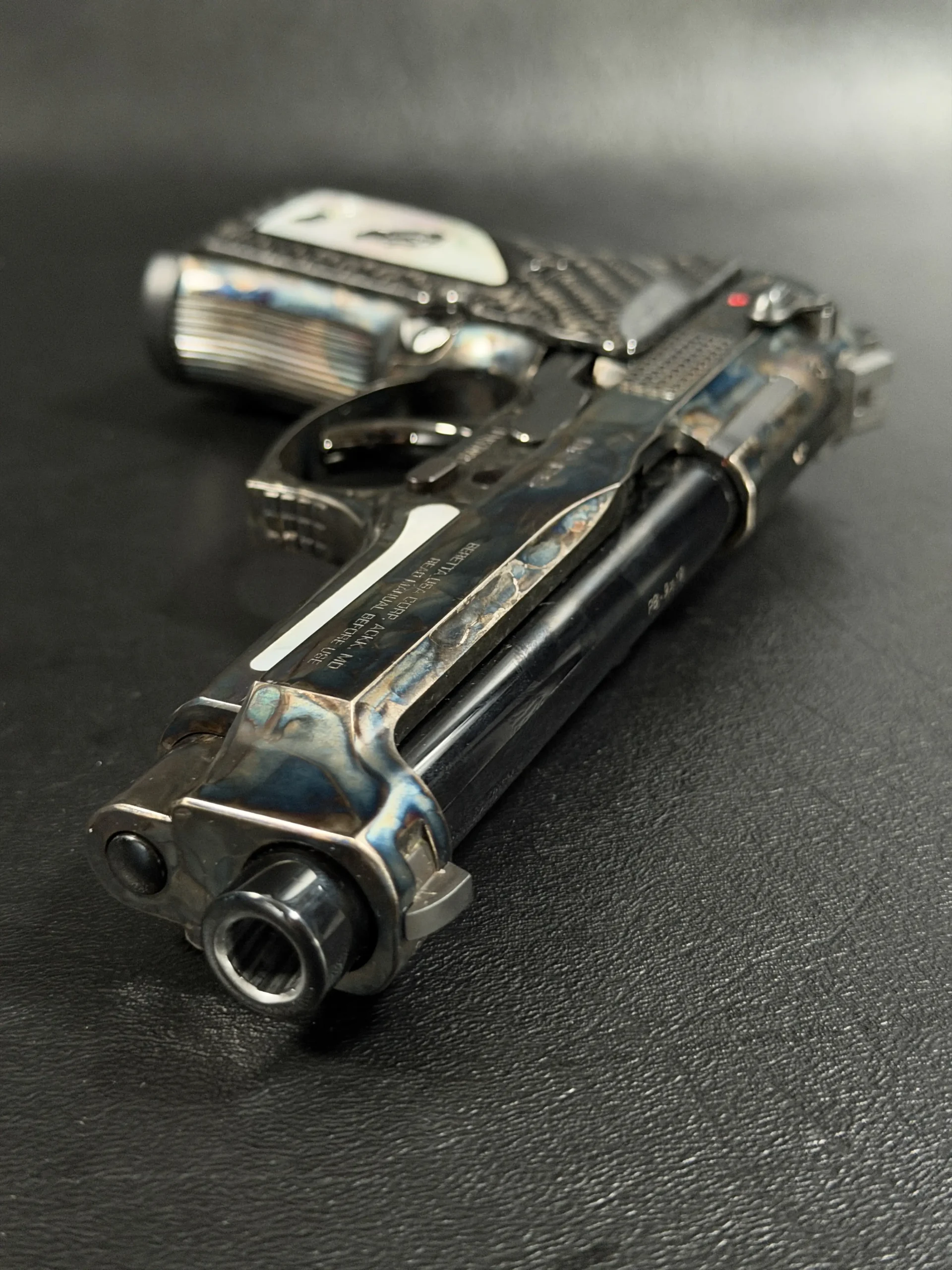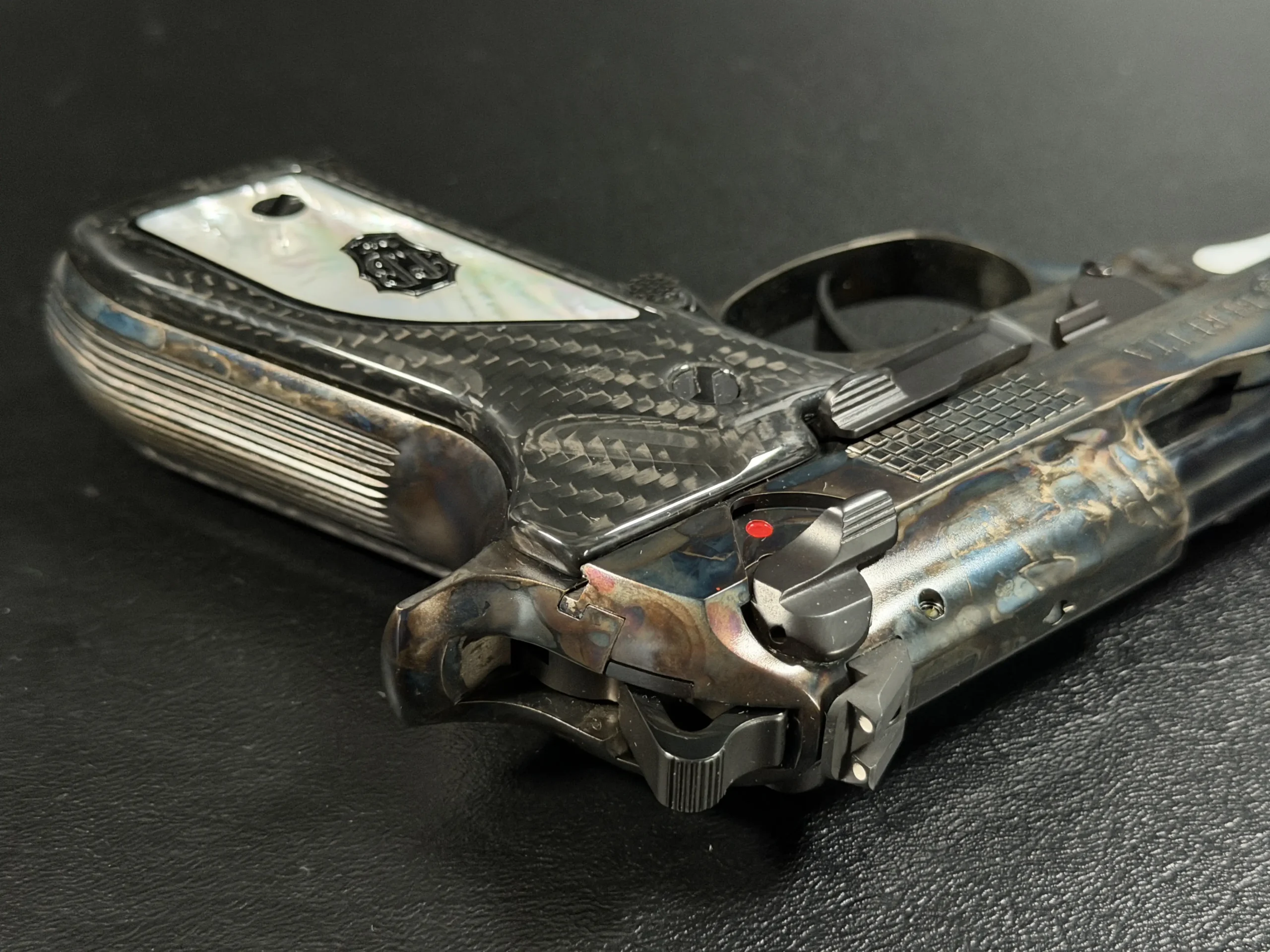 The first thing that meets the eye is the rich, swirling case-hardened finish, deep blues, charcoals, amber tones, and iridescent transitions that feel almost organic. Every surface has been meticulously polished before hardening, giving the frame and slide a depth and luster rarely seen on a modern semi-automatic pistol.