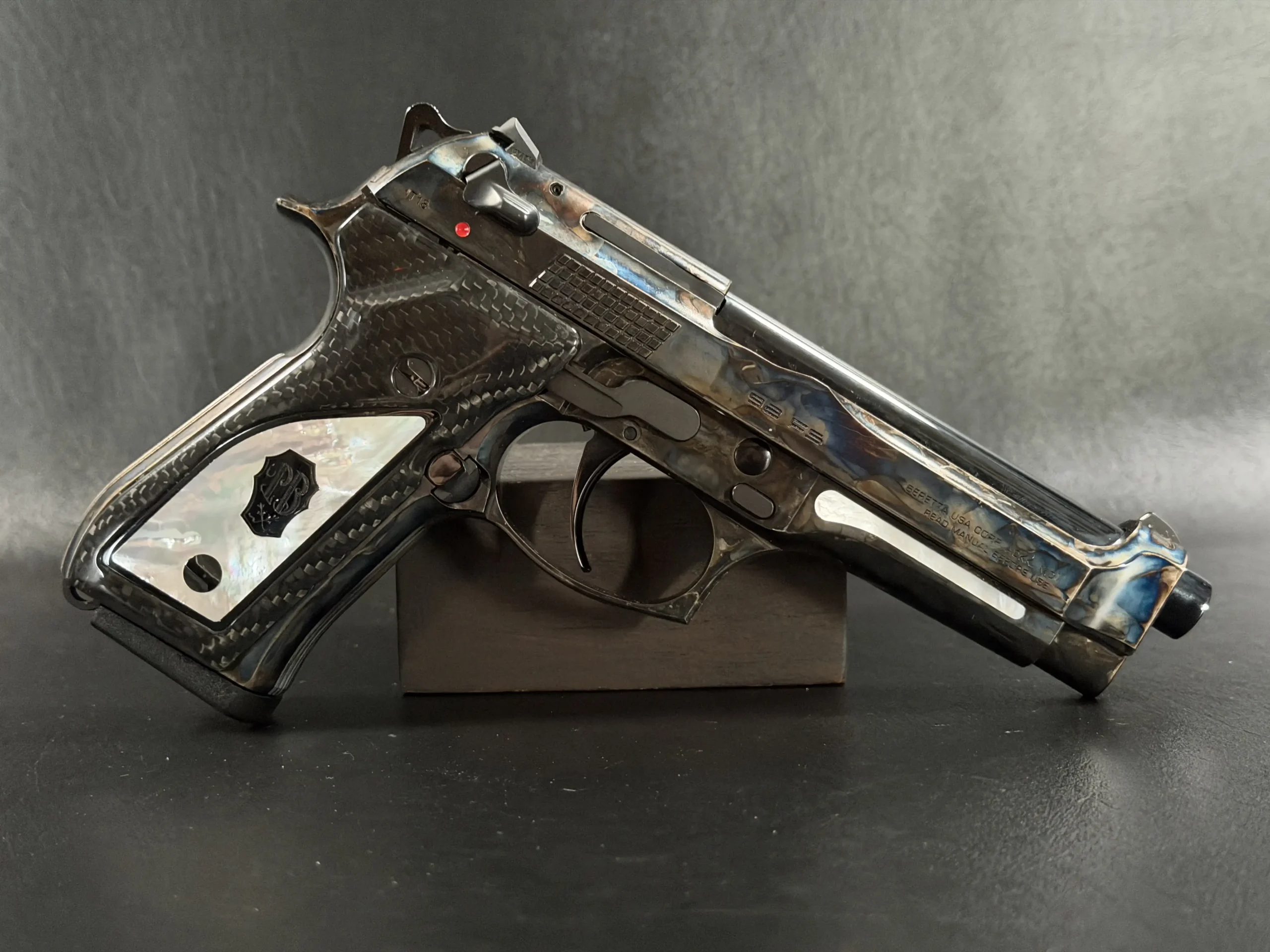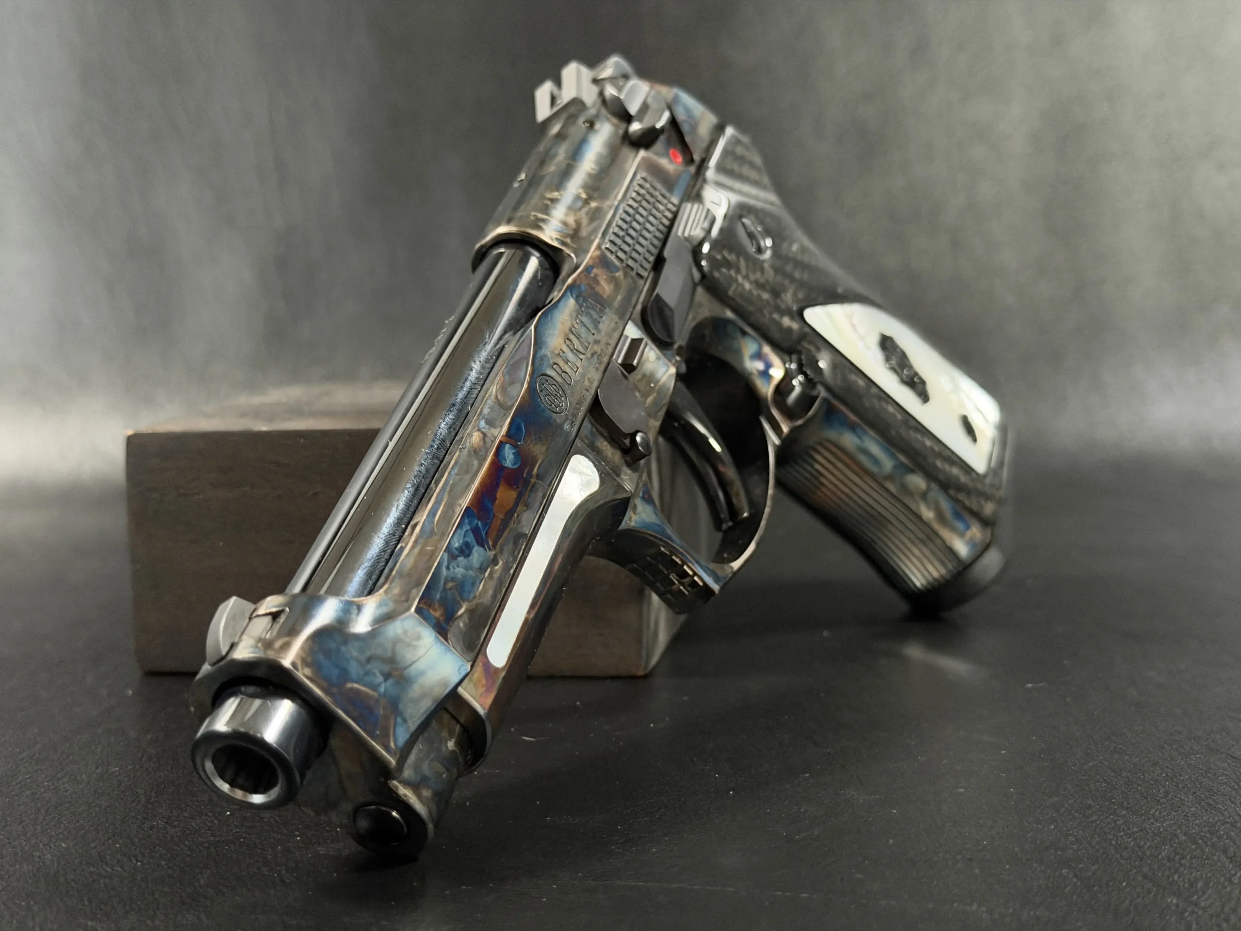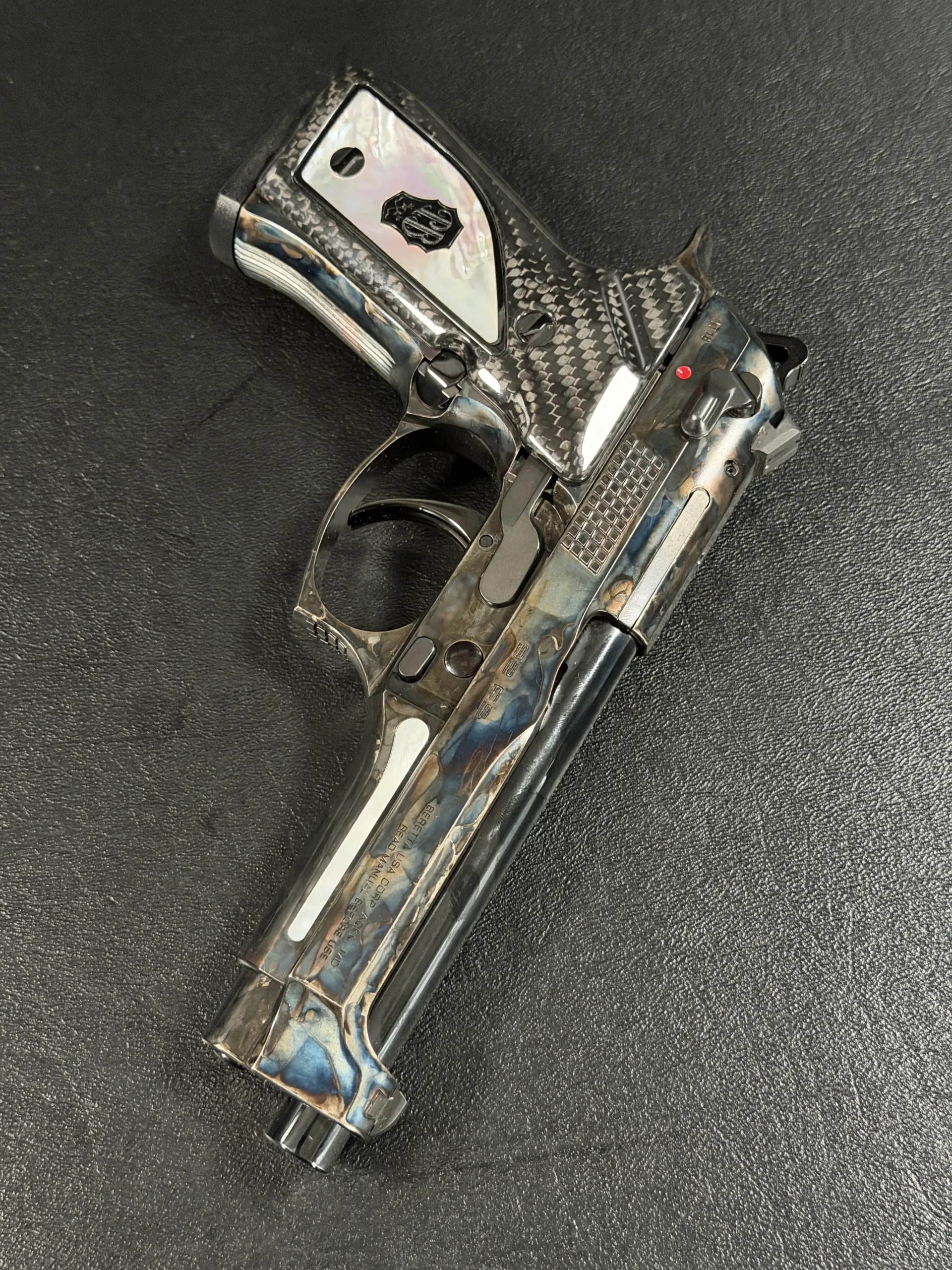 The first thing that meets the eye is the rich, swirling case-hardened finish, deep blues, charcoals, amber tones, and iridescent transitions that feel almost organic. Every surface has been meticulously polished before hardening, giving the frame and slide a depth and luster rarely seen on a modern semi-automatic pistol.