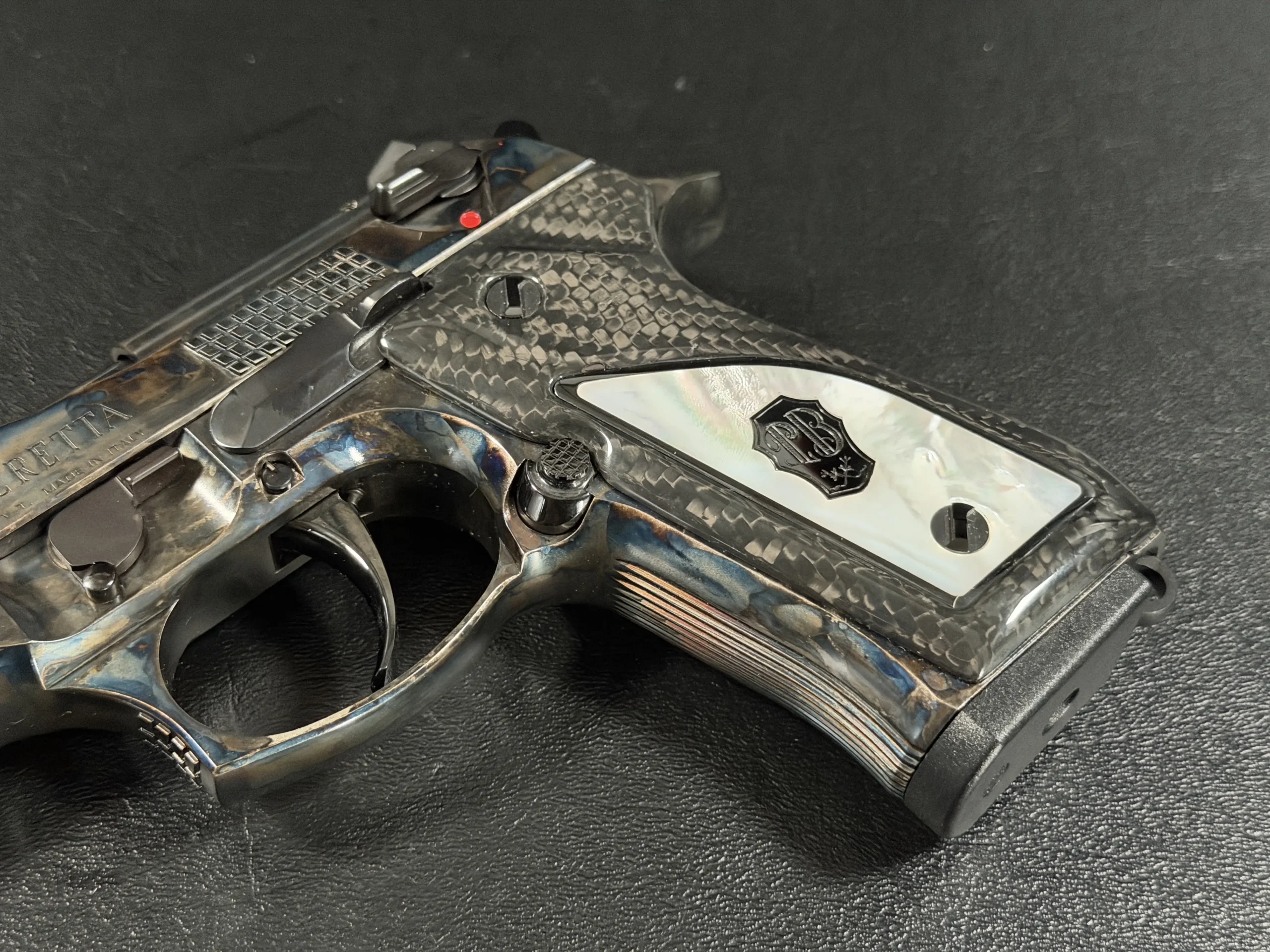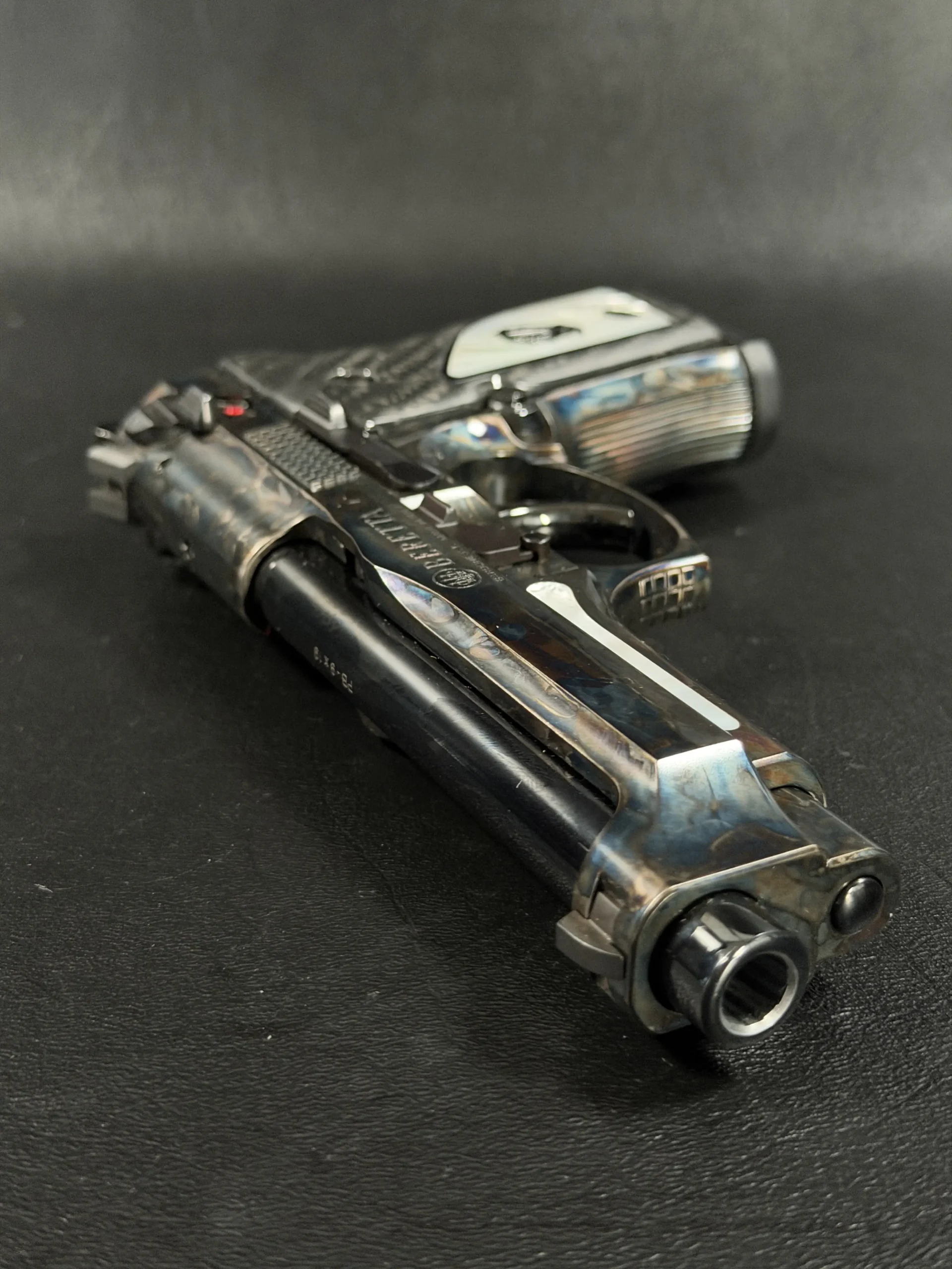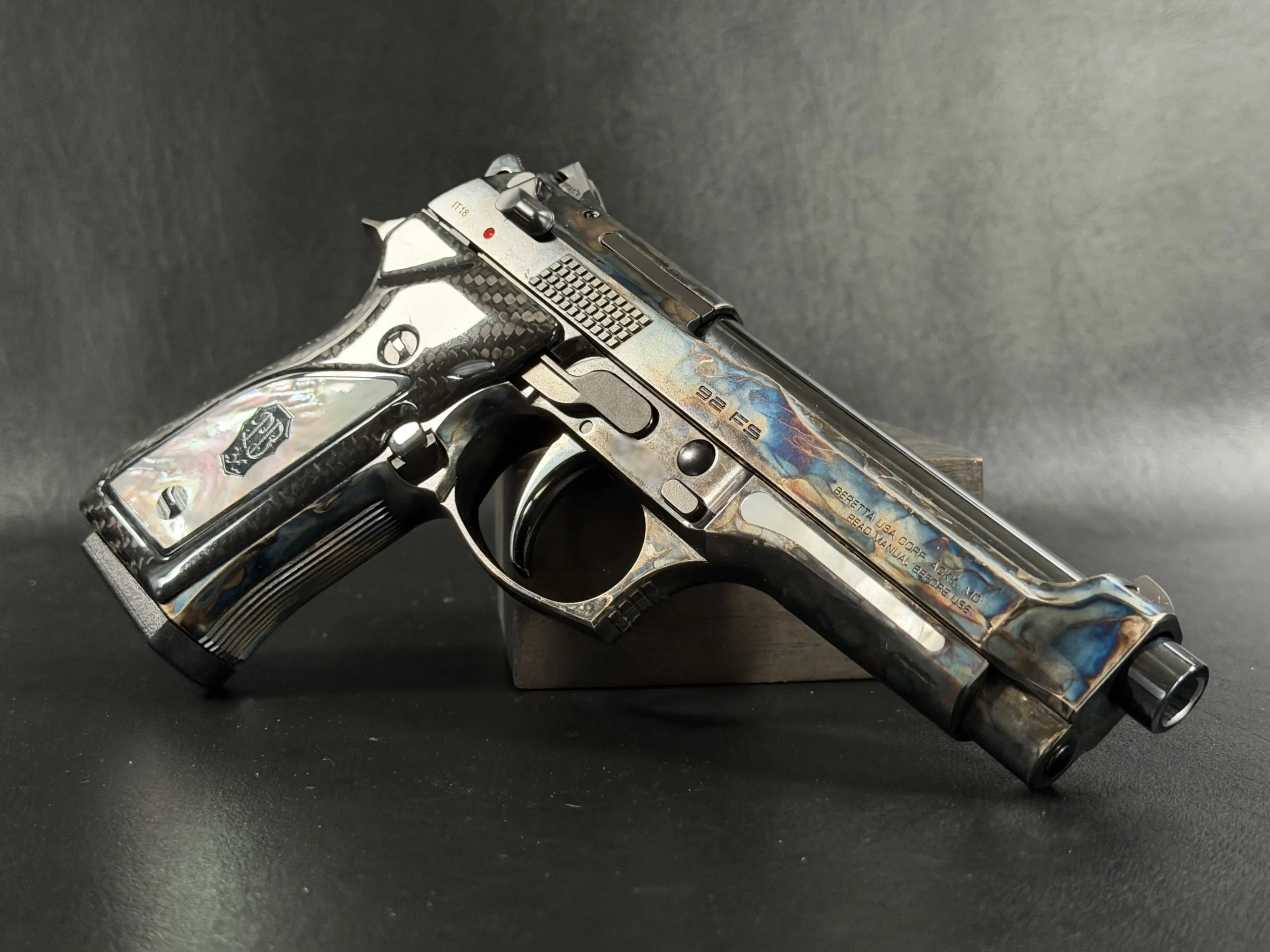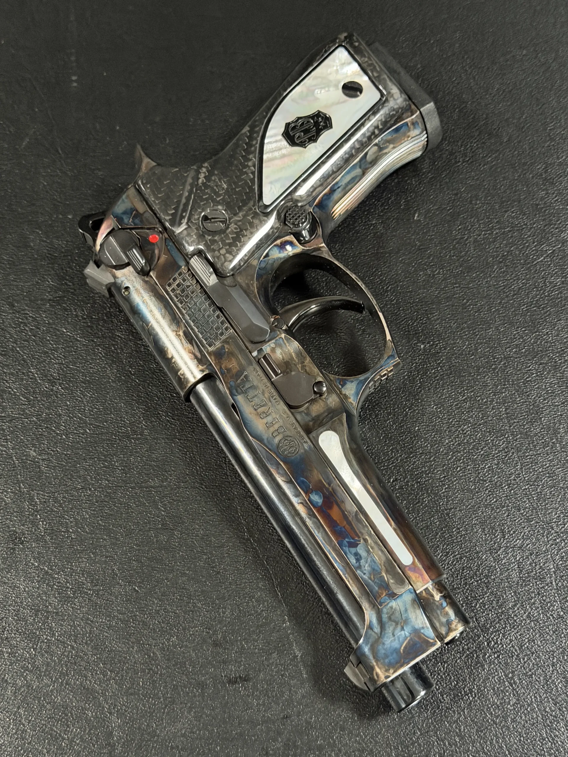 The first thing that meets the eye is the rich, swirling case-hardened finish, deep blues, charcoals, amber tones, and iridescent transitions that feel almost organic. Every surface has been meticulously polished before hardening, giving the frame and slide a depth and luster rarely seen on a modern semi-automatic pistol.