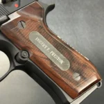 Let’s talk features. This piece comes with a matte finish and matching drawing numbers stamped on the barrel, slide (marked “PM”), frame, and hammer. Its fixed sights—a squared-off front post and a notched rear—are each capped with a white dot for quick target acquisition. The walnut grips are beautifully checkered and richly grained, with an Air Force medallion on the right side and, on the left, a polished stainless oval engraved with “ROBERT E. PRESTON.” It’s the kind of personal touch that gives you pause.