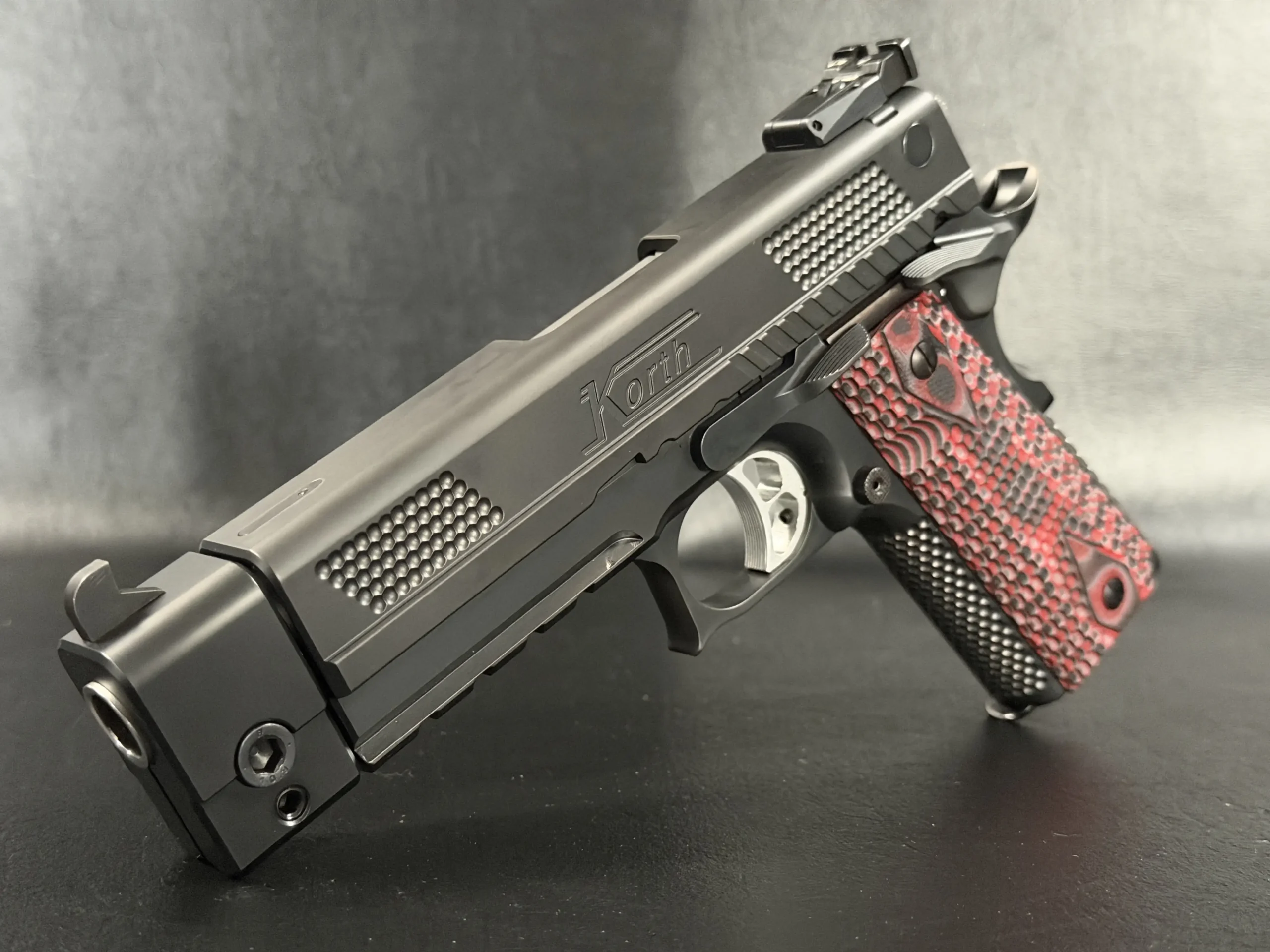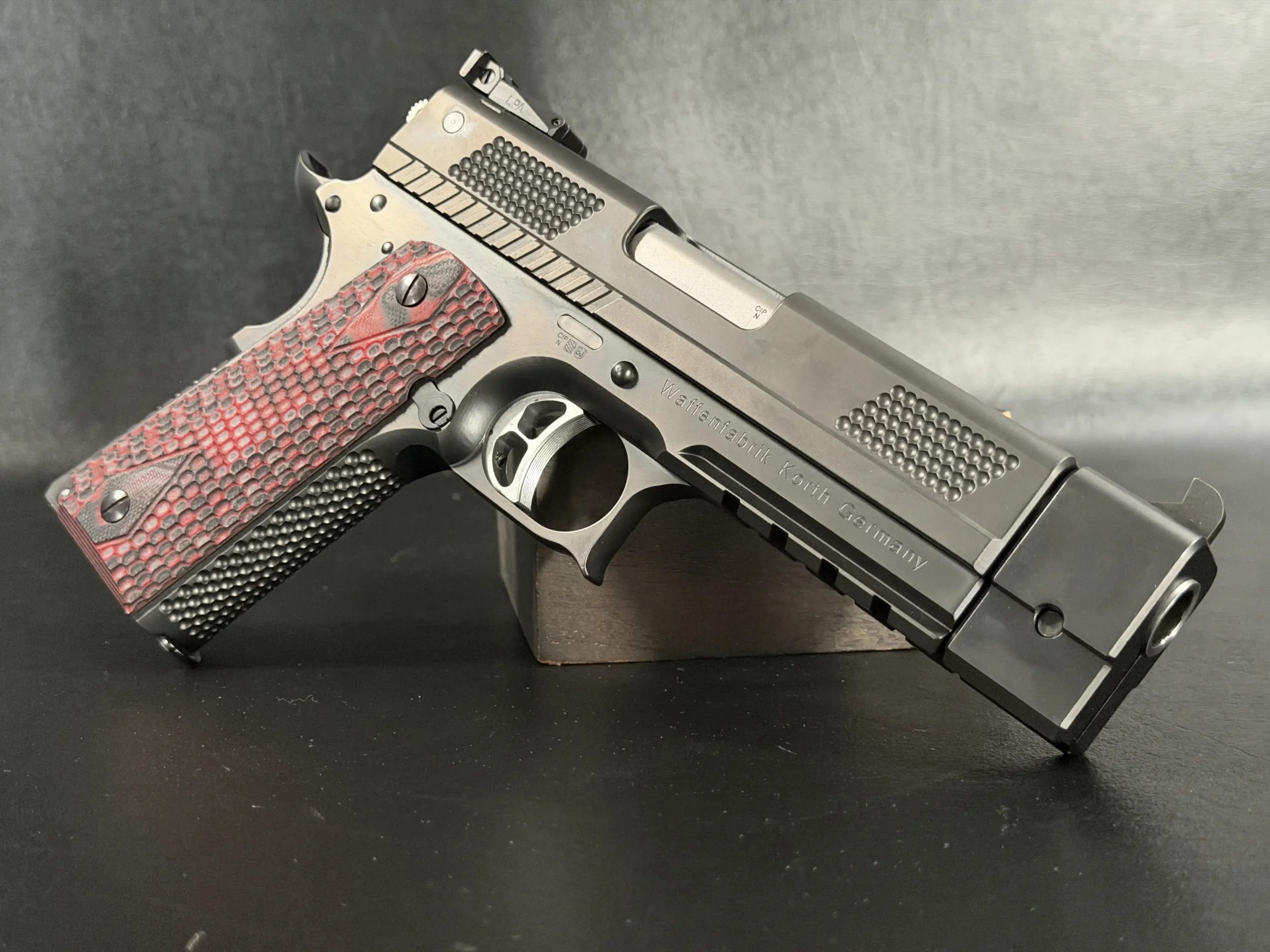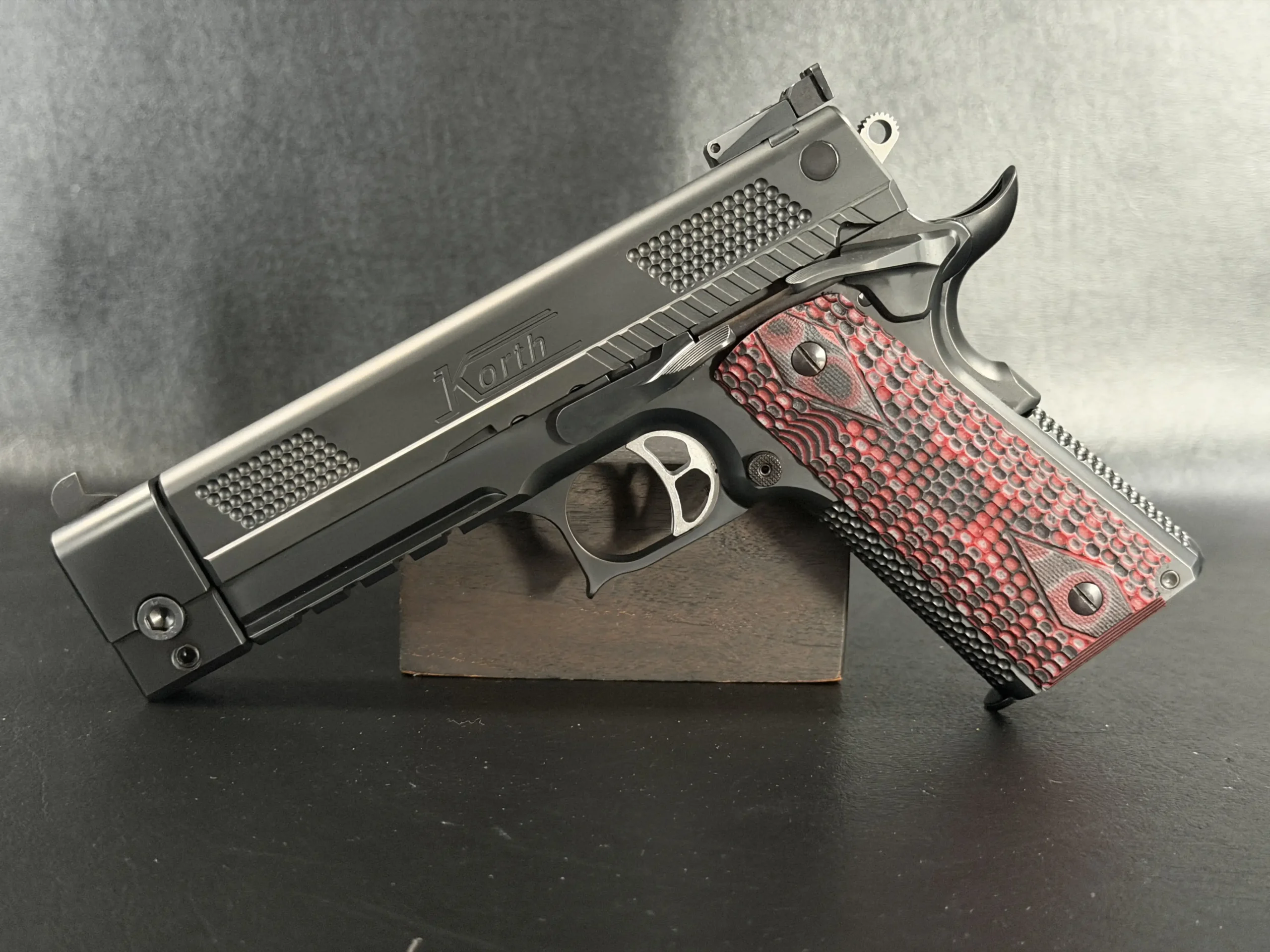 Visually, this example embodies the modern Korth aesthetic in full. The deep matte black finish presents a sleek, non-reflective surface that highlights the pistol’s sculpted machining and tight tolerances. Signature Korth slide texturing, those distinctive raised pattern panels, provide both visual identity and functional purchase during manipulation.