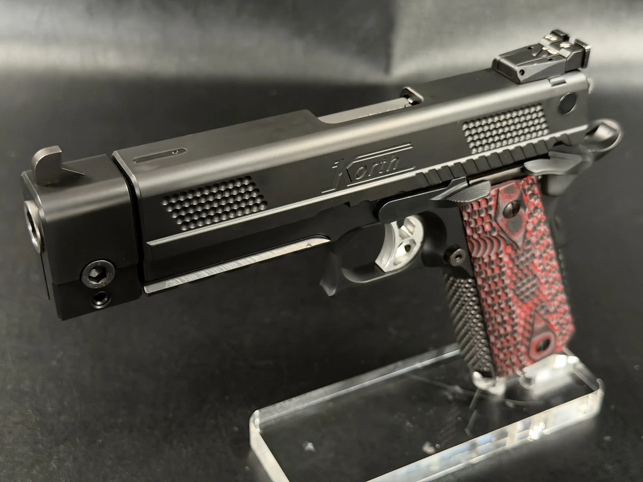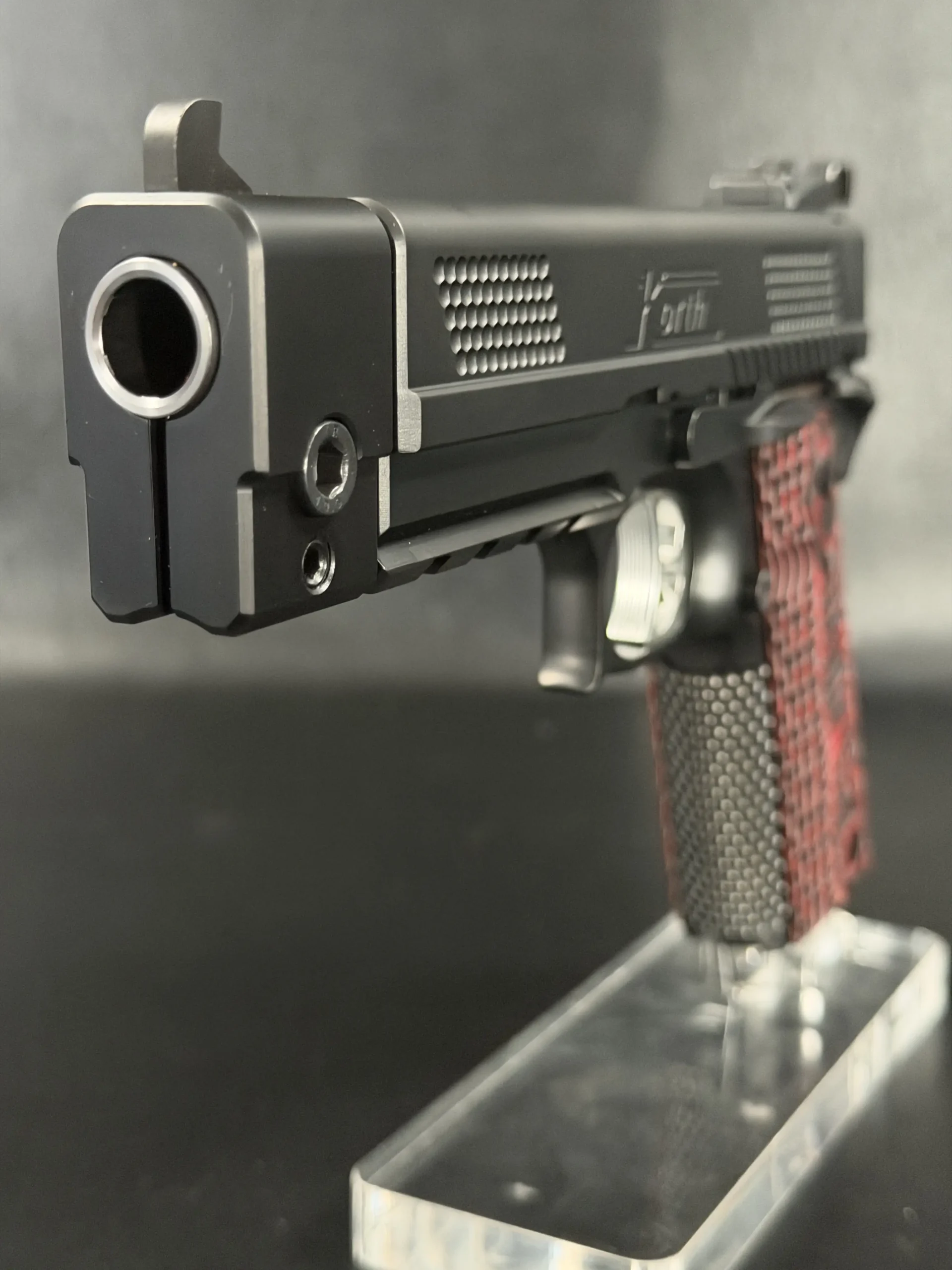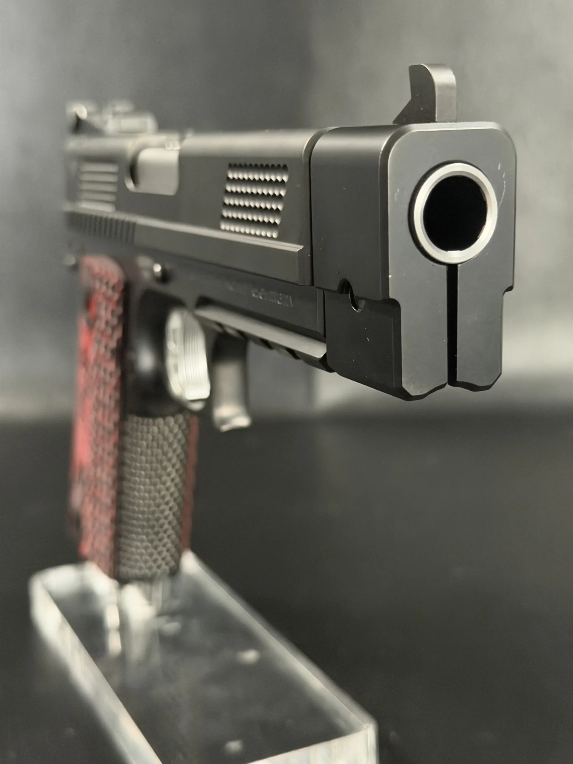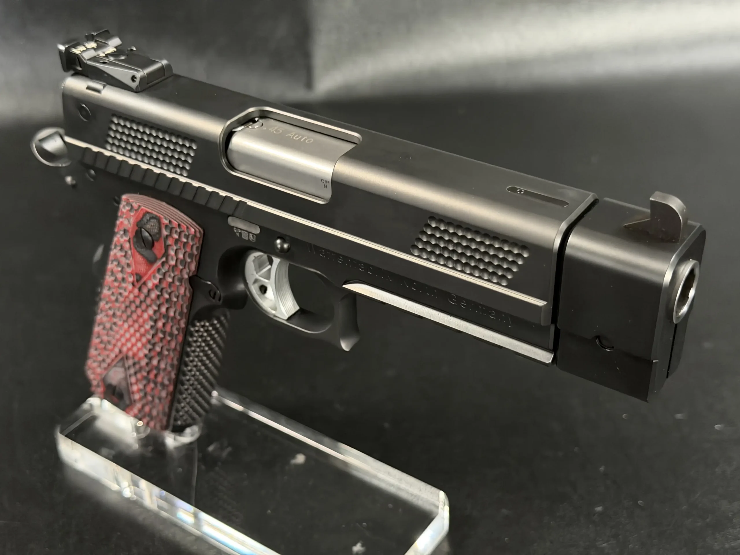 One of the most striking visual elements on this PRS is the grip treatment. The red and black textured grip panels add contrast to the otherwise monochromatic build, bold without being loud, and perfectly suited to the pistol’s performance-driven personality. They anchor the hand confidently while adding a custom, almost bespoke feel to the presentation.