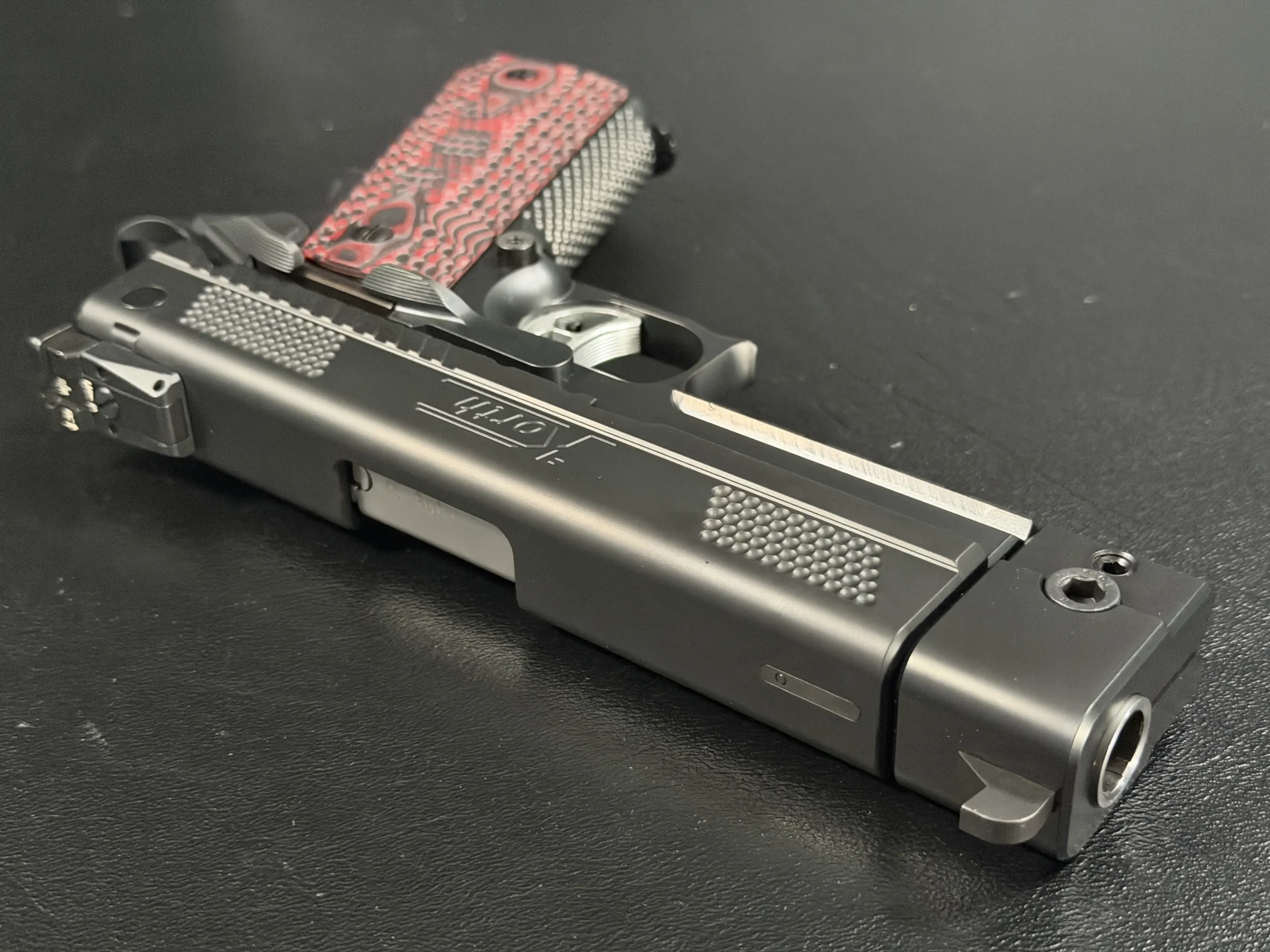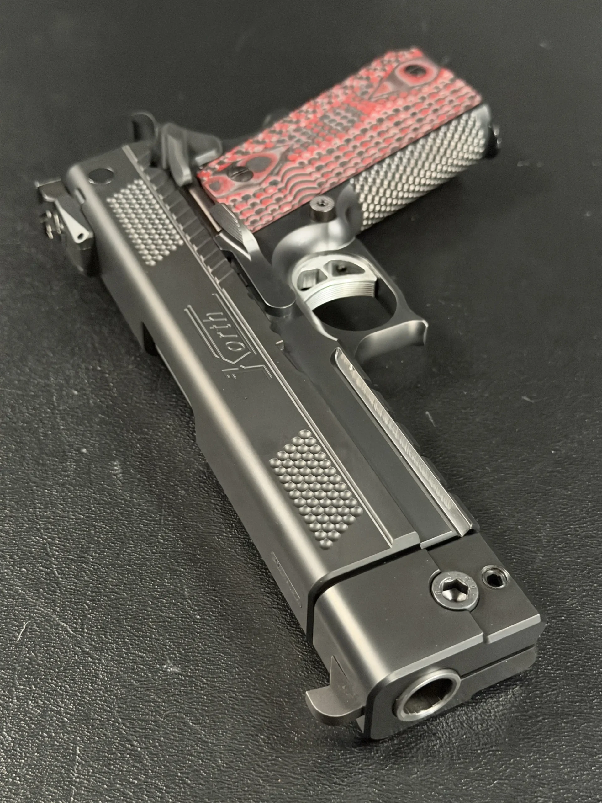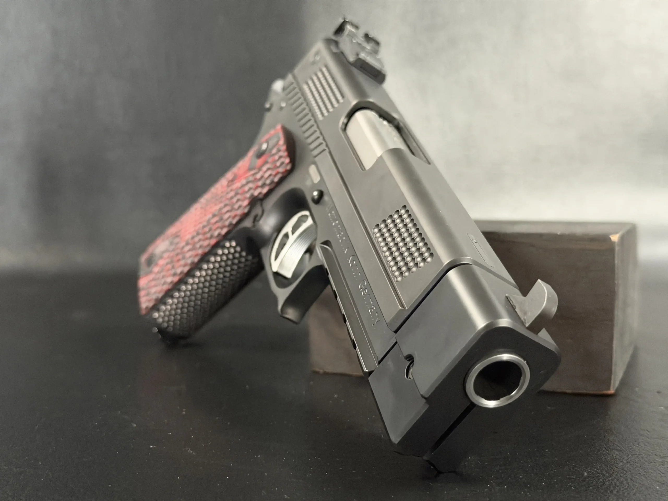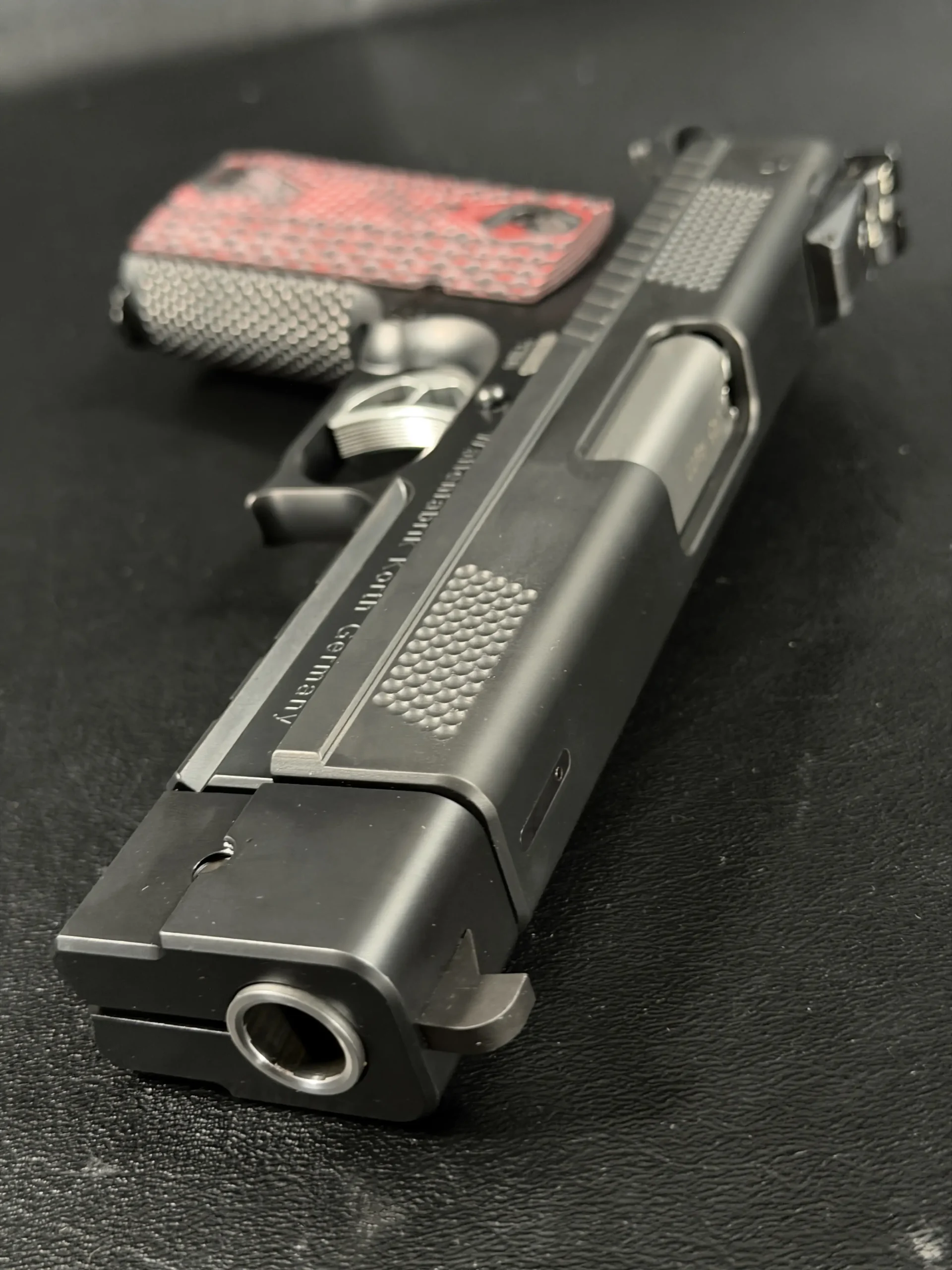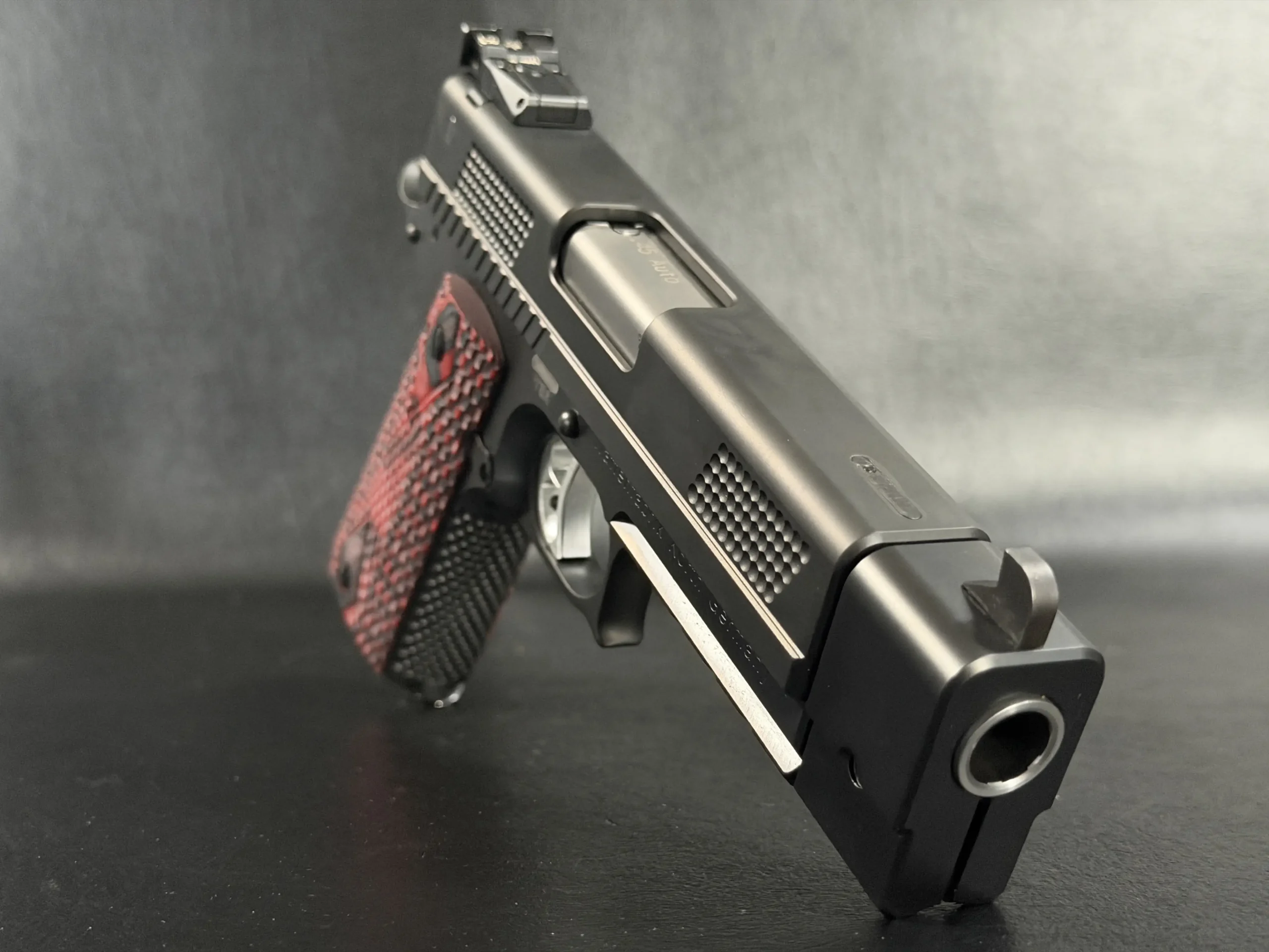 One of the most striking visual elements on this PRS is the grip treatment. The red and black textured grip panels add contrast to the otherwise monochromatic build, bold without being loud, and perfectly suited to the pistol’s performance-driven personality. They anchor the hand confidently while adding a custom, almost bespoke feel to the presentation.
