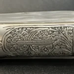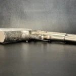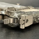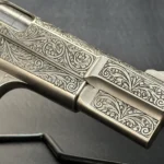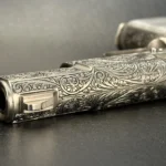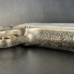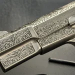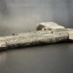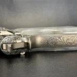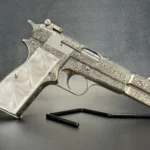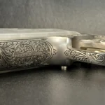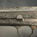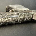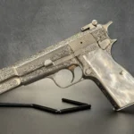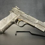 This exquisite Browning Hi-Power Renaissance semi-automatic pistol hails from the renowned Belgian Browning Renaissance series, a lineup celebrated for its meticulous craftsmanship and ornate designs. Produced in 1977, this pistol showcases a masterful leafy scroll engraving that covers the entire surface, lending it a unique and sophisticated appearance. The firearm’s artwork enhances its aesthetic appeal and highlights the precision and attention to detail inherent in Renaissance series guns.