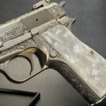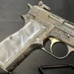 Equipped with a reliable fixed blade and notch sighting system, this Browning Hi Power ensures precision and accuracy, making it a highly functional piece and a collector’s delight. It features the standard imprints and carries Belgian certifications of authenticity, affirming its quality and origin. The pistol is further embellished with elegantly smooth faux pearl grips, which provide a comfortable hold and add a touch of luxury to the overall design.
