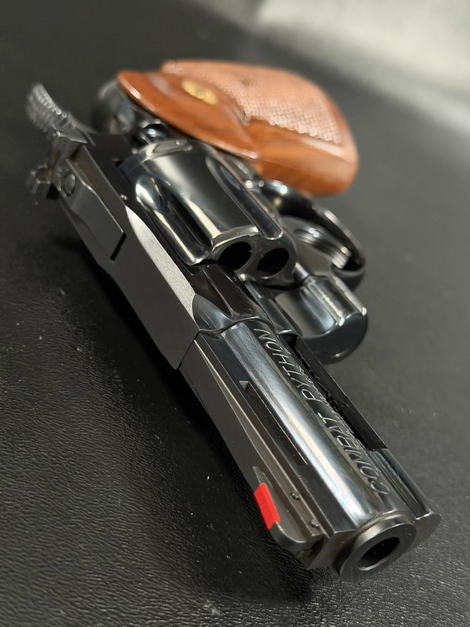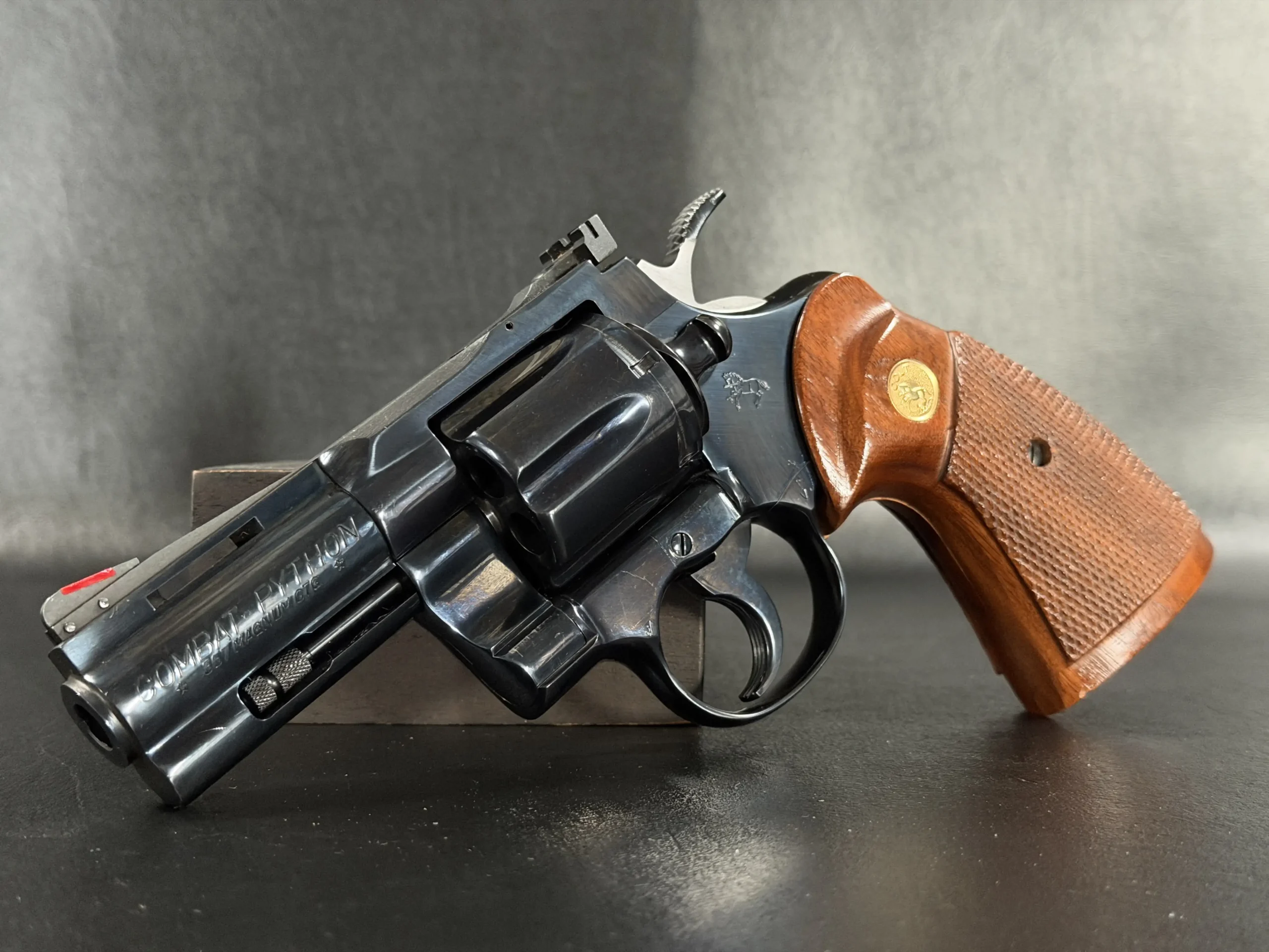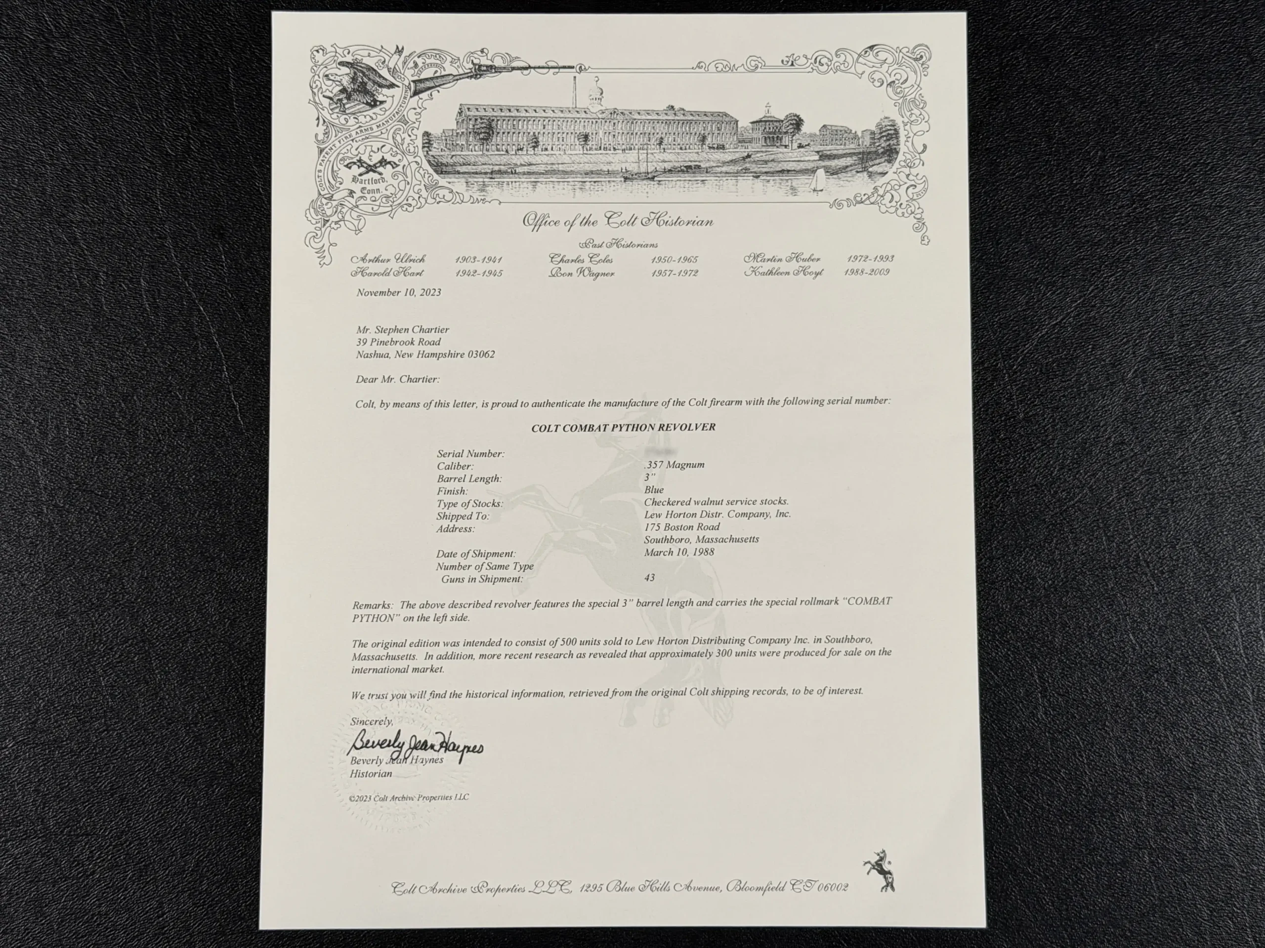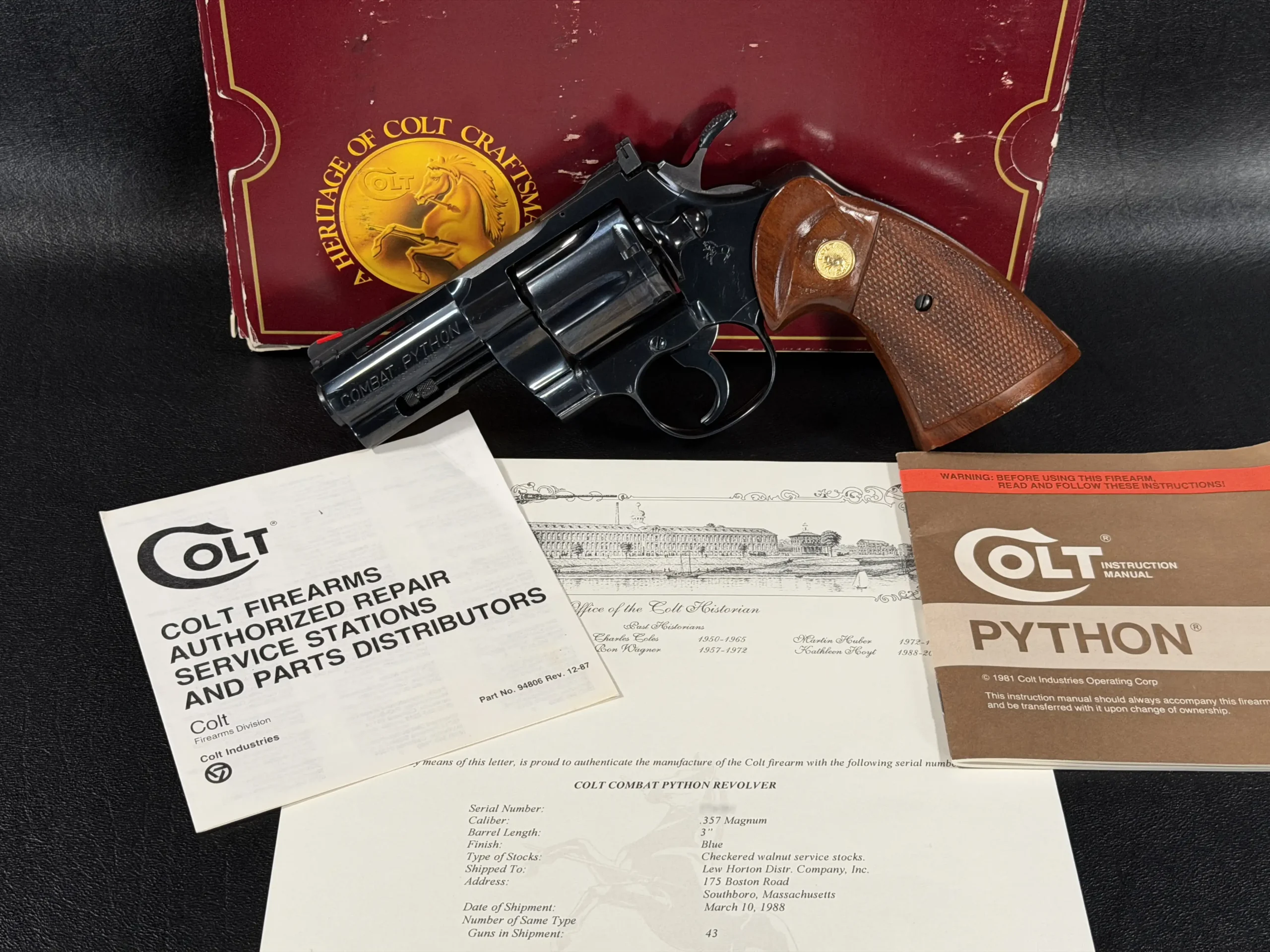 This Combat Python comes with its original maroon box, styrofoam inserts, paperwork, and a 2023 Colt factory letter verifying its status as one of 43 firearms shipped to Lew Horton’s of Southboro, MA, on March 10, 1988.