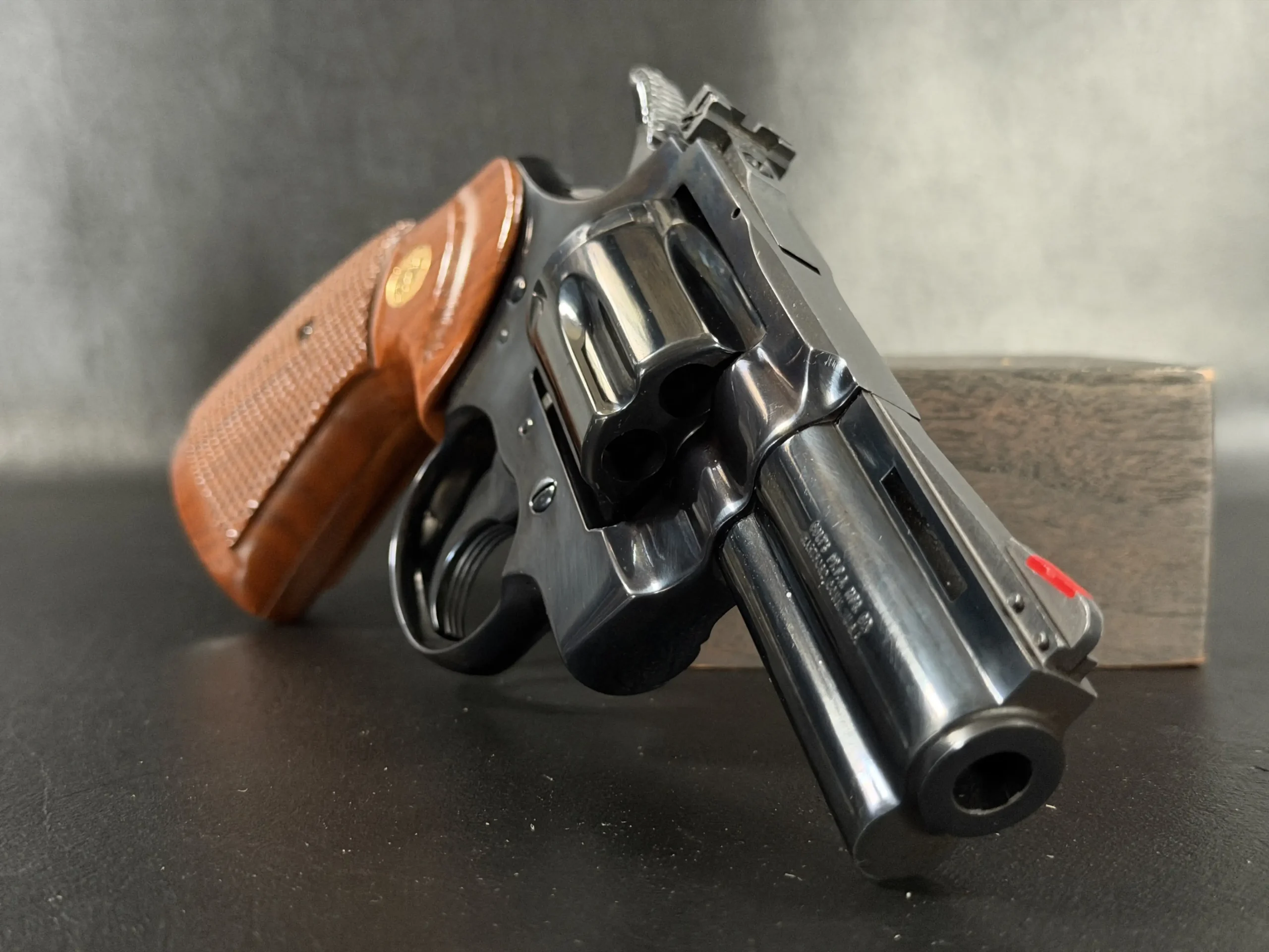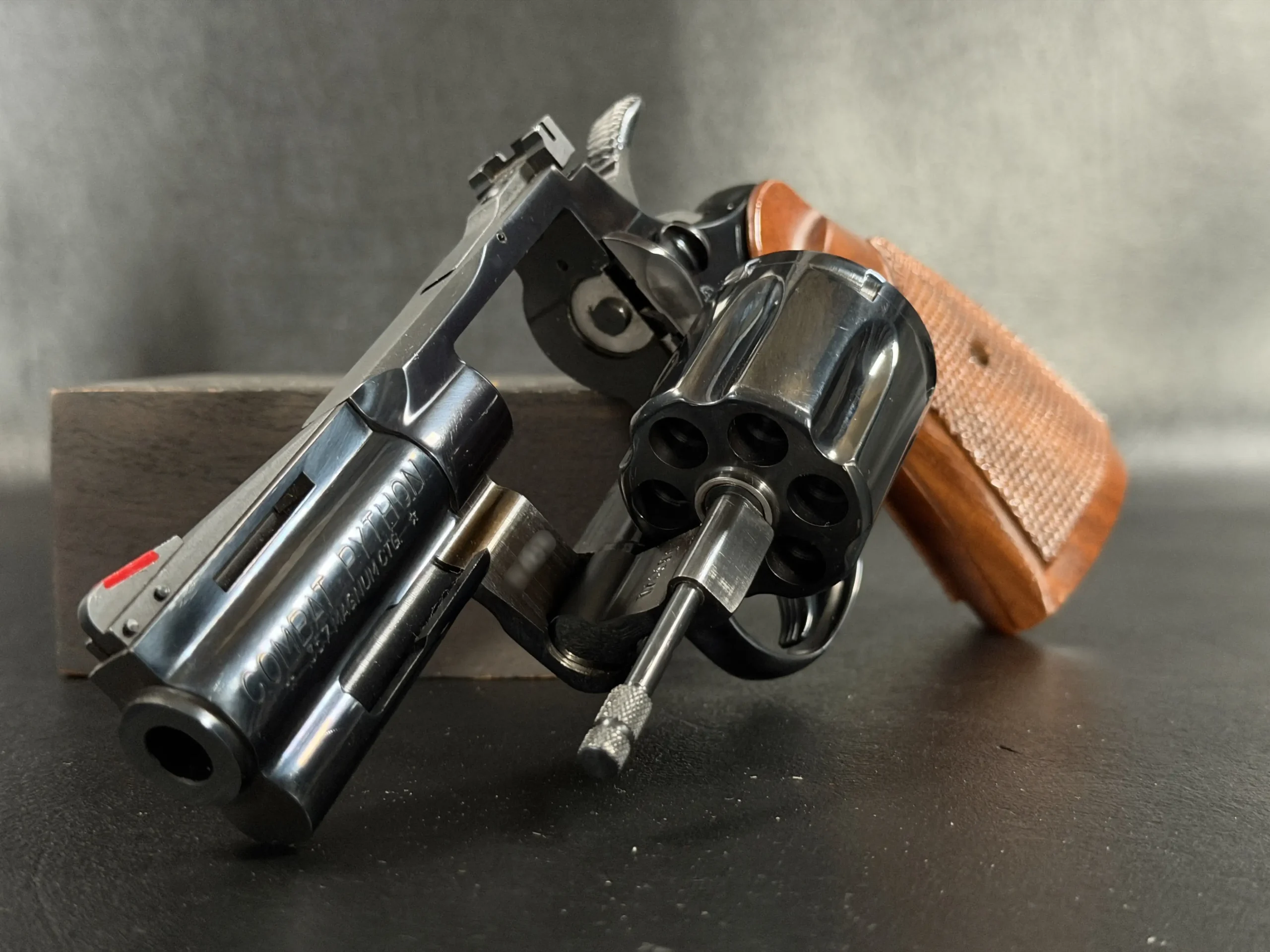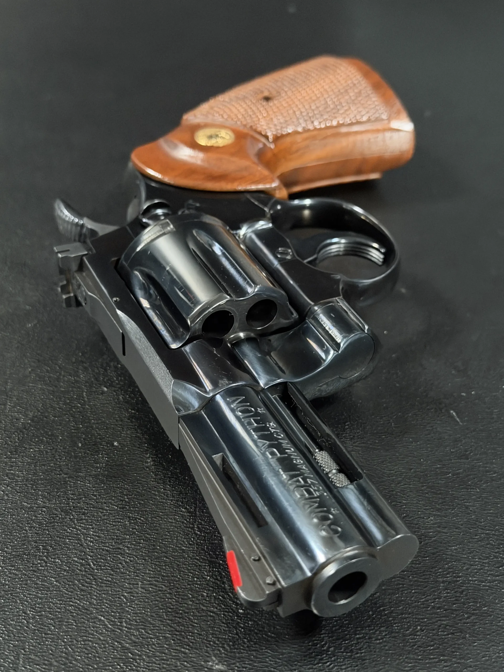 Condition-wise, the revolver is in near-excellent shape. The frame’s blue finish has been factory-restored to a mirror-like sheen, and the original barrel finish remains pristine. Internally, it appears unfired, and the cylinder bears only a faint turn line and minimal finish wear near the flutes. The bore and grips are likewise near-perfect, making this Combat Python a highly desirable piece for any severe Colt collector. Its impeccable condition is a testament to its quality and care of ownership.