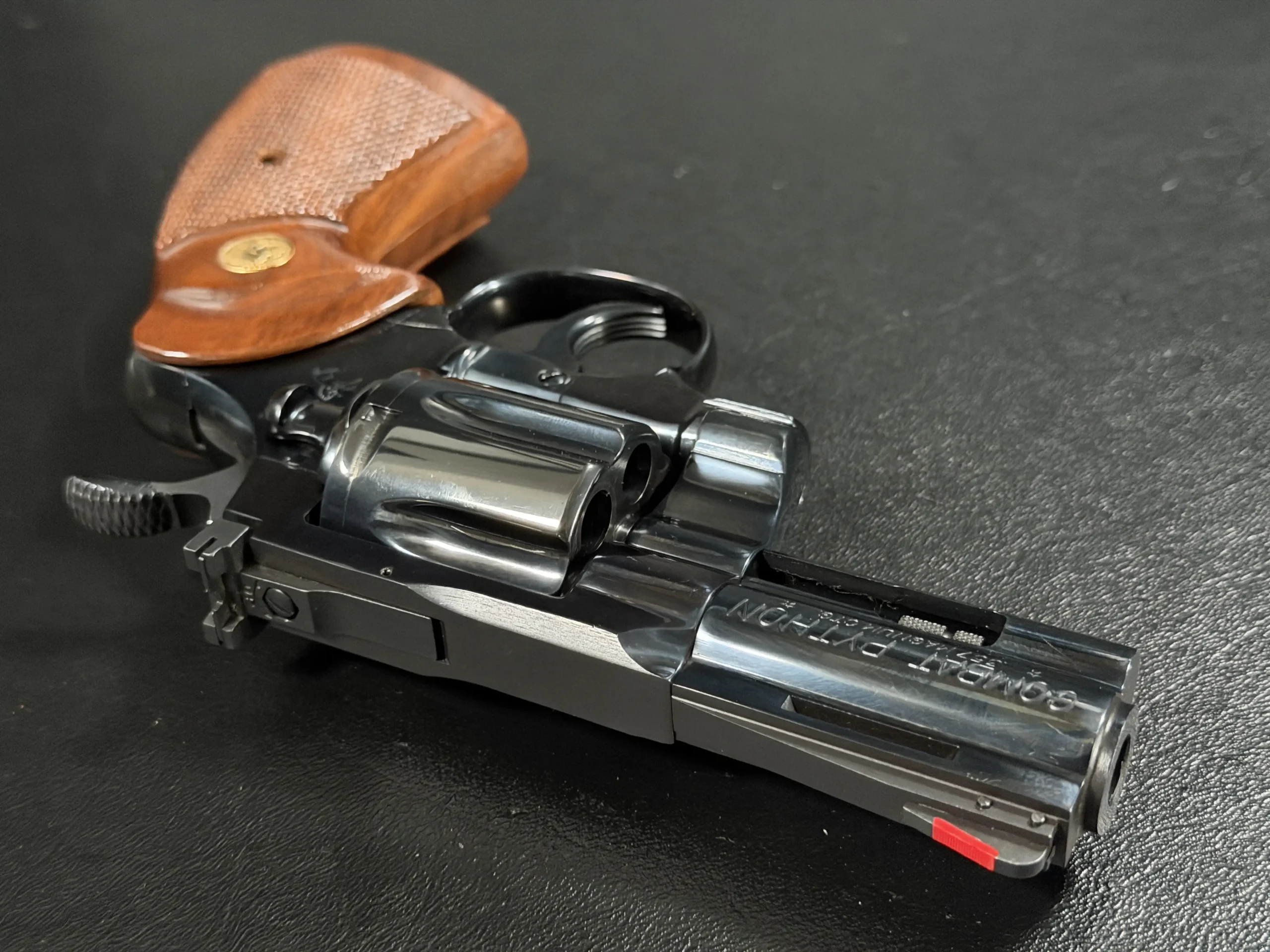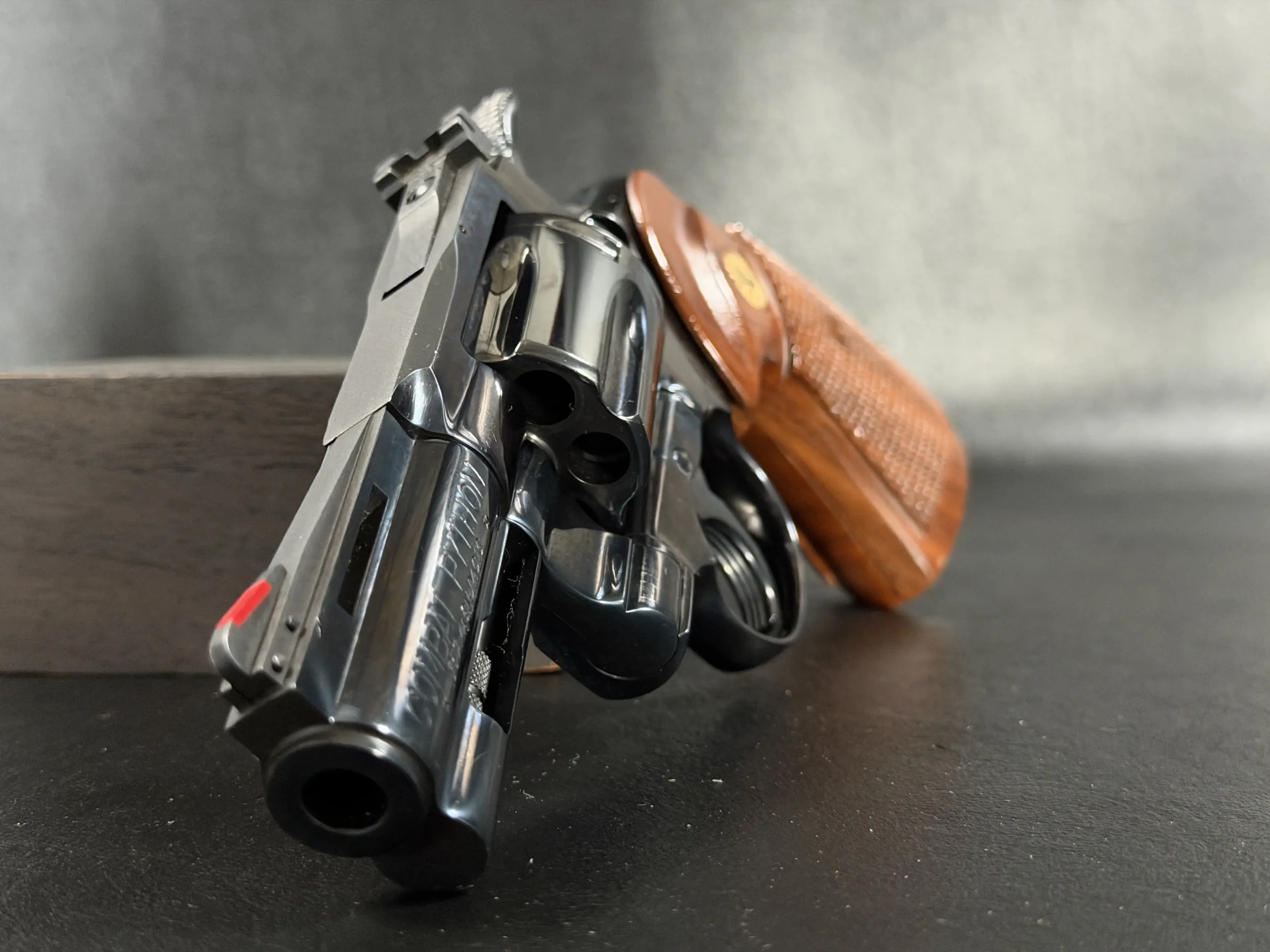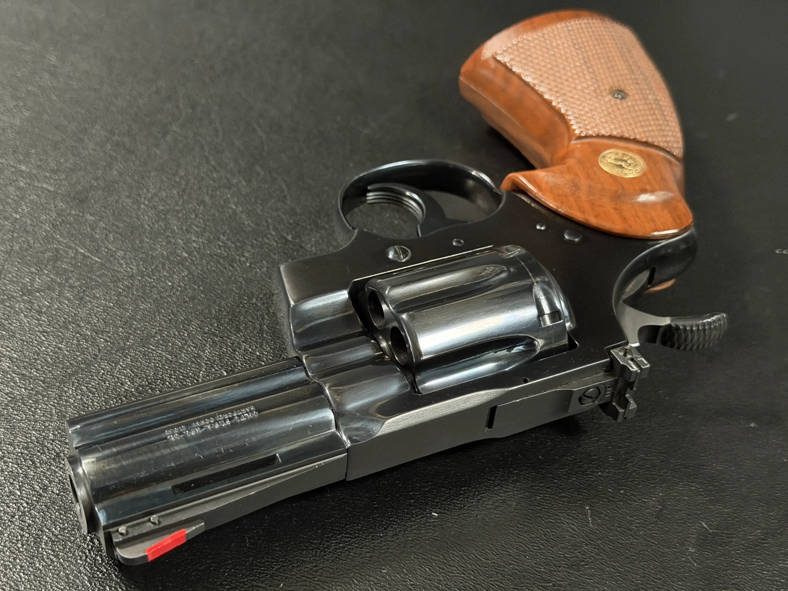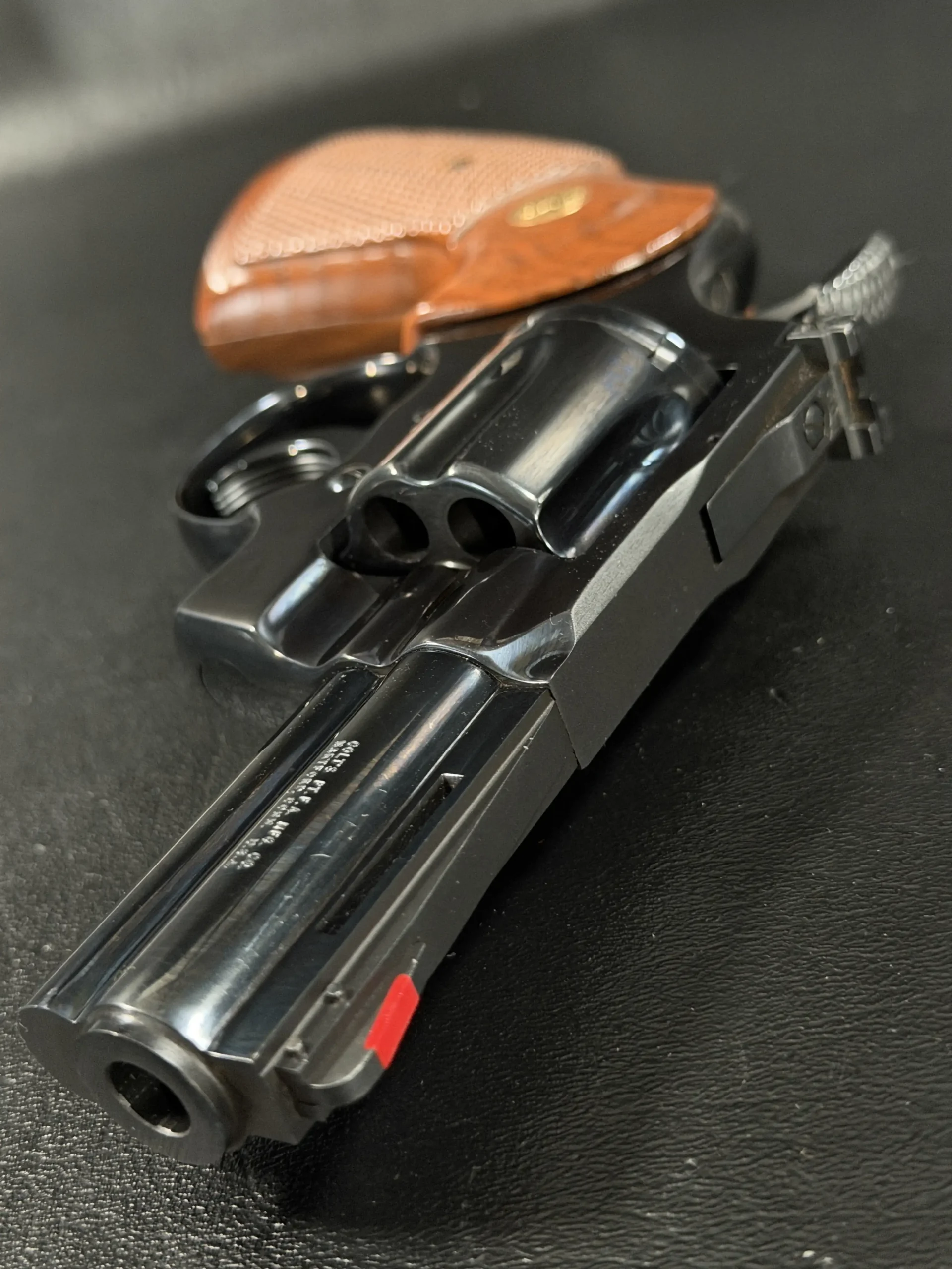 Condition-wise, the revolver is in near-excellent shape. The frame’s blue finish has been factory-restored to a mirror-like sheen, and the original barrel finish remains pristine. Internally, it appears unfired, and the cylinder bears only a faint turn line and minimal finish wear near the flutes. The bore and grips are likewise near-perfect, making this Combat Python a highly desirable piece for any severe Colt collector. Its impeccable condition is a testament to its quality and care of ownership.
