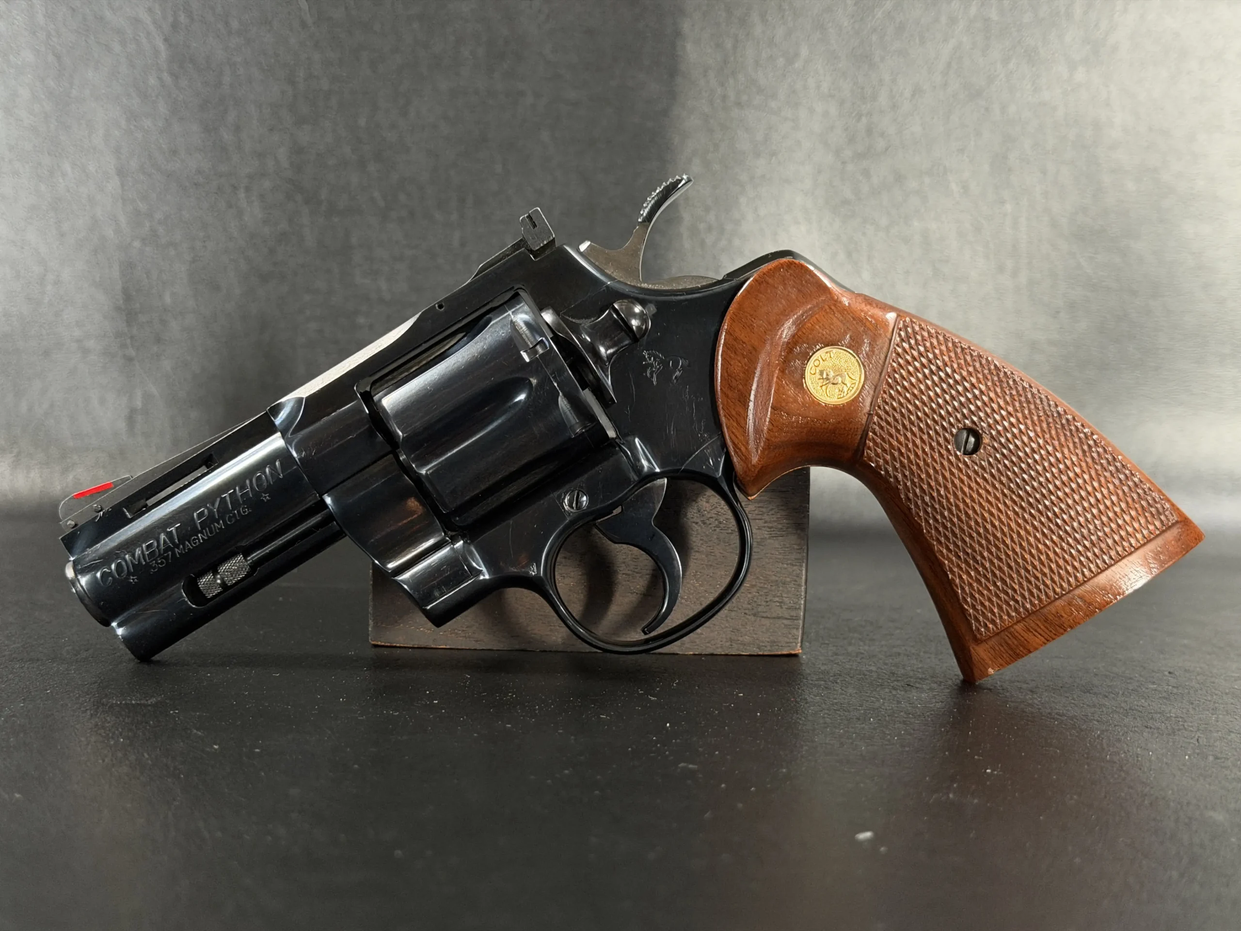 This rare Colt Combat Python is a testament to the meticulous craftsmanship of the 1988 production model. One of only 510 made exclusively for Lew Horton Distributors, with an additional 300 for international markets, it features a distinctive 3-inch ventilated rib barrel, complete with a red ramp front sight and the “COMBAT PYTHON” marking on the left, exuding elegance and precision.