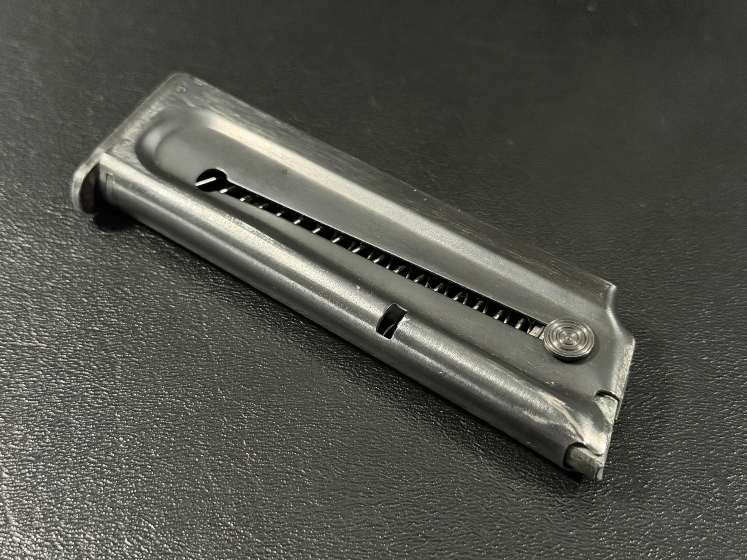 The pistol itself retains the distinctive features collectors look for in early ACE examples, the proper slide markings, checkered brown grips, parkerized military-style finish, and the unique floating chamber system that gave the Service Model ACE its characteristic recoil impulse. The original .22 LR magazine accompanies the pistol, further reinforcing its authenticity and completeness.