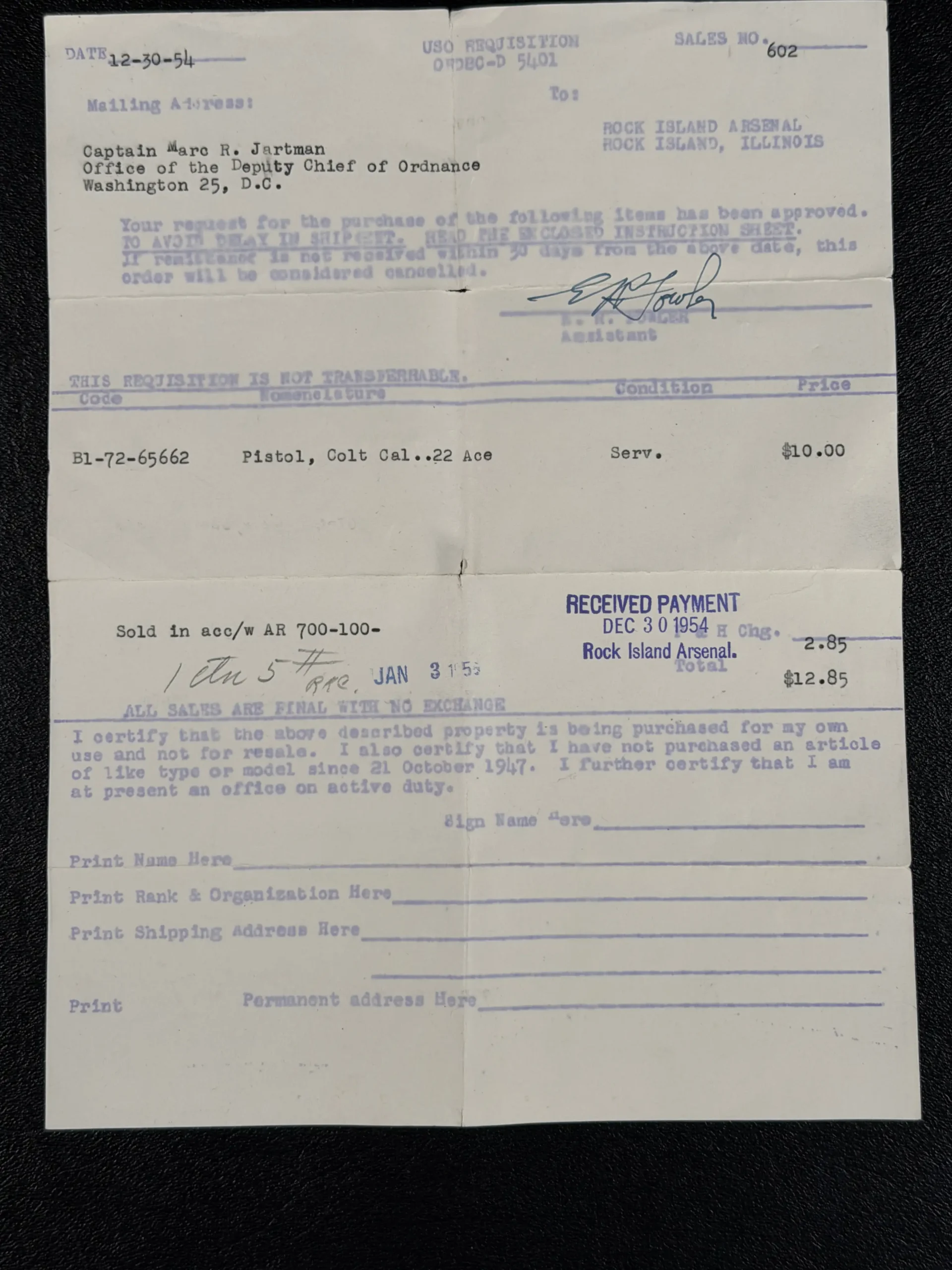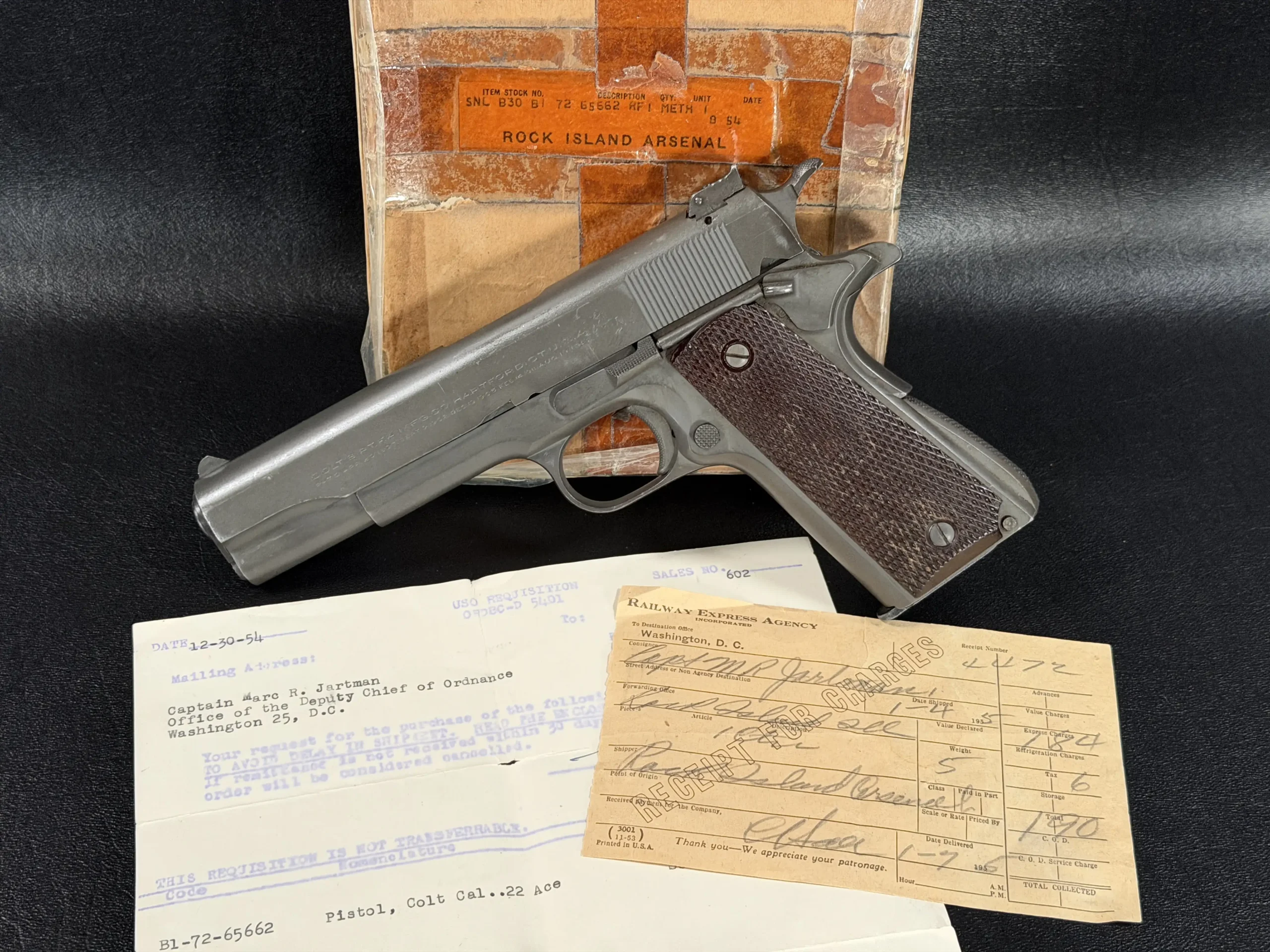 What makes this example particularly compelling is its documented Rock Island Arsenal provenance. Accompanied by original mid-1950s sales paperwork and Railway Express Agency documentation, this pistol was sold through U.S. Ordnance channels as a service arm. The archival material not only anchors the pistol firmly in its historical period but also elevates it beyond a simple firearm, making it a documented military artifact.