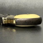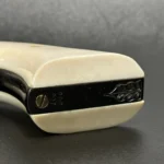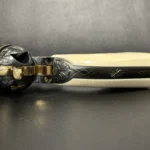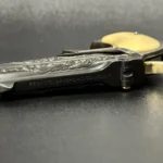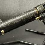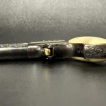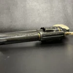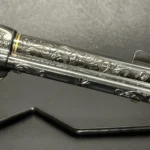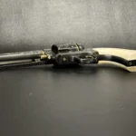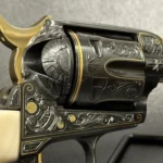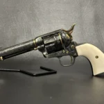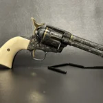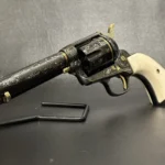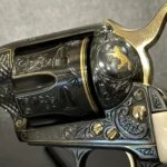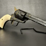 The Colt Single Action Army, chambered in .45 Colt, showcases a deep-blued finish accentuated with intricate gold inlay engraving. Its brass controllers and screws add a touch of vintage charm. At the same time, the smooth ivory grips offer both beauty and authenticity.