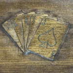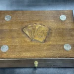 Housed in a custom wooden display box, the set exudes timeless luxury. The lid is adorned with carved Aces & Eights playing cards—a nod to the legendary “Dead Man’s Hand”—while the interior features four embedded silver dollars, artfully displayed with two heads and two tails visible.
