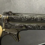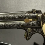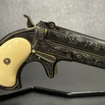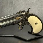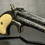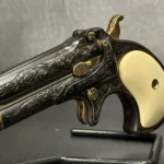 The Remington Derringer complements the Colt, chambered in .41 Rimfire. This compact yet equally stunning firearm mirrors Colt’s artistry with a matching blued finish, gold inlay engravings, brass accents, and ivory grips. Together, these firearms embody the spirit of the Old West.