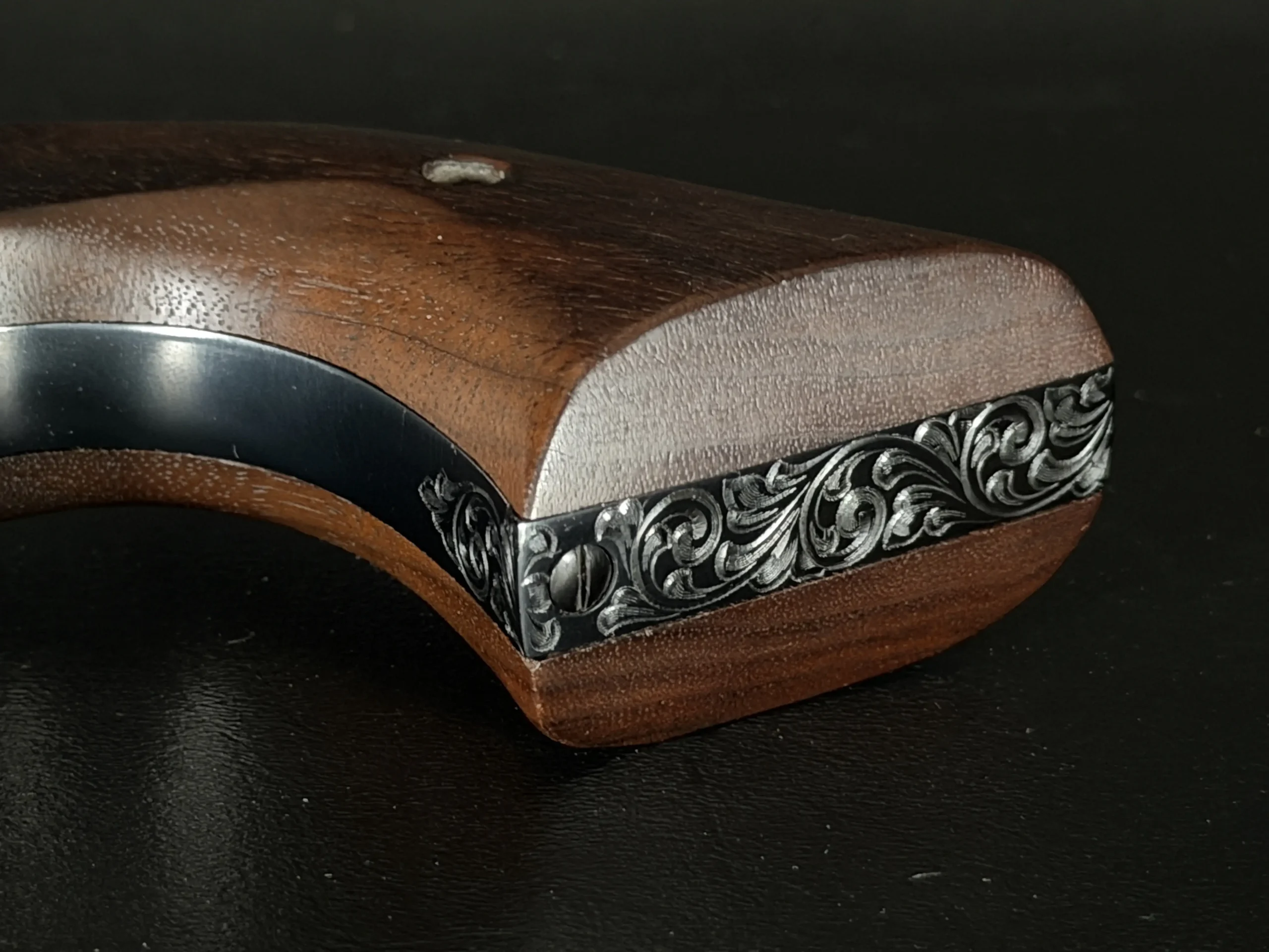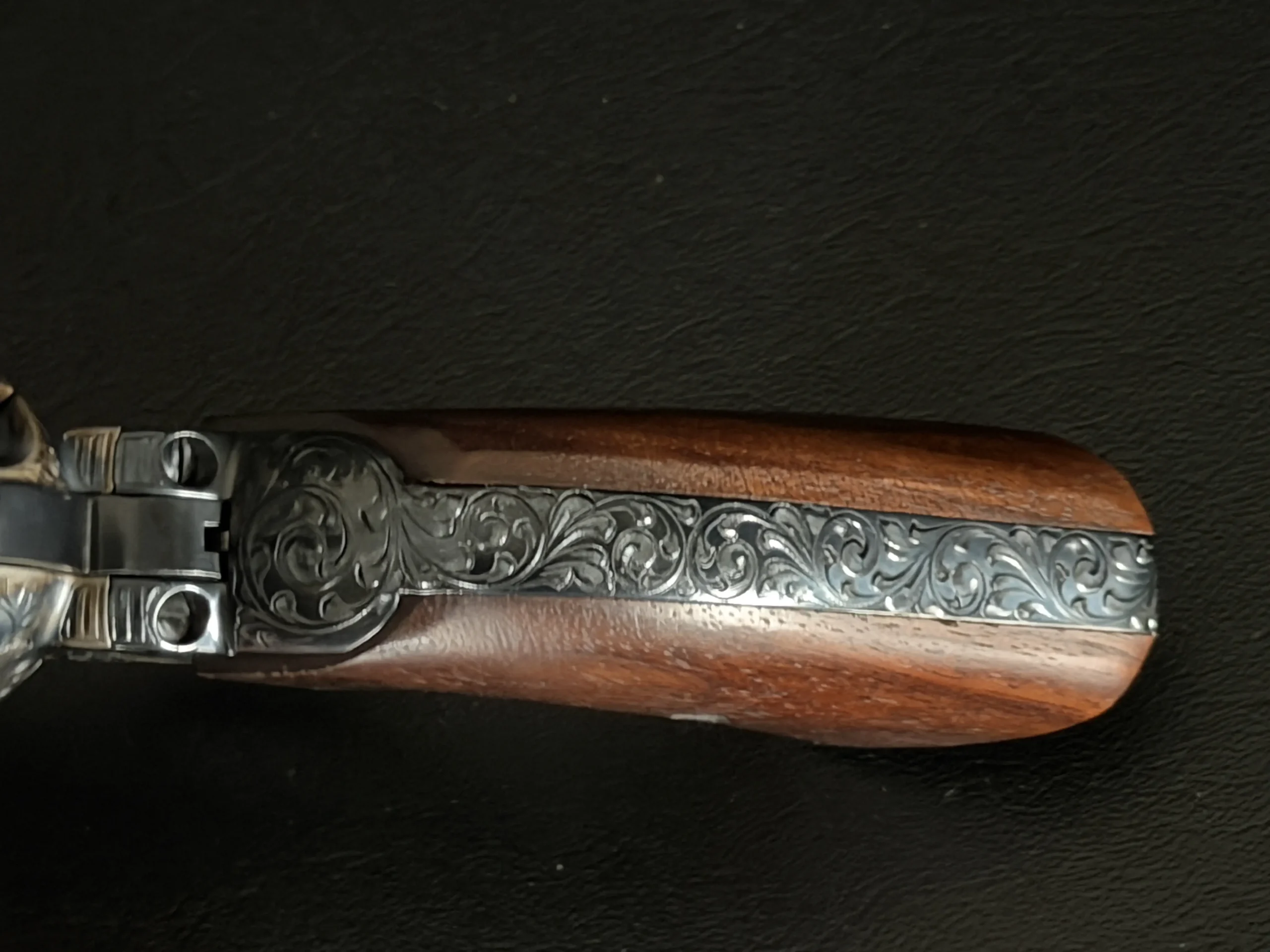 Then come the walnut grips. Warm to the touch, perfectly fitted, and grain-rich with character, they tie the whole revolver together with organic grace. You can feel the balance the moment it sits in your palm—steady, familiar, right.