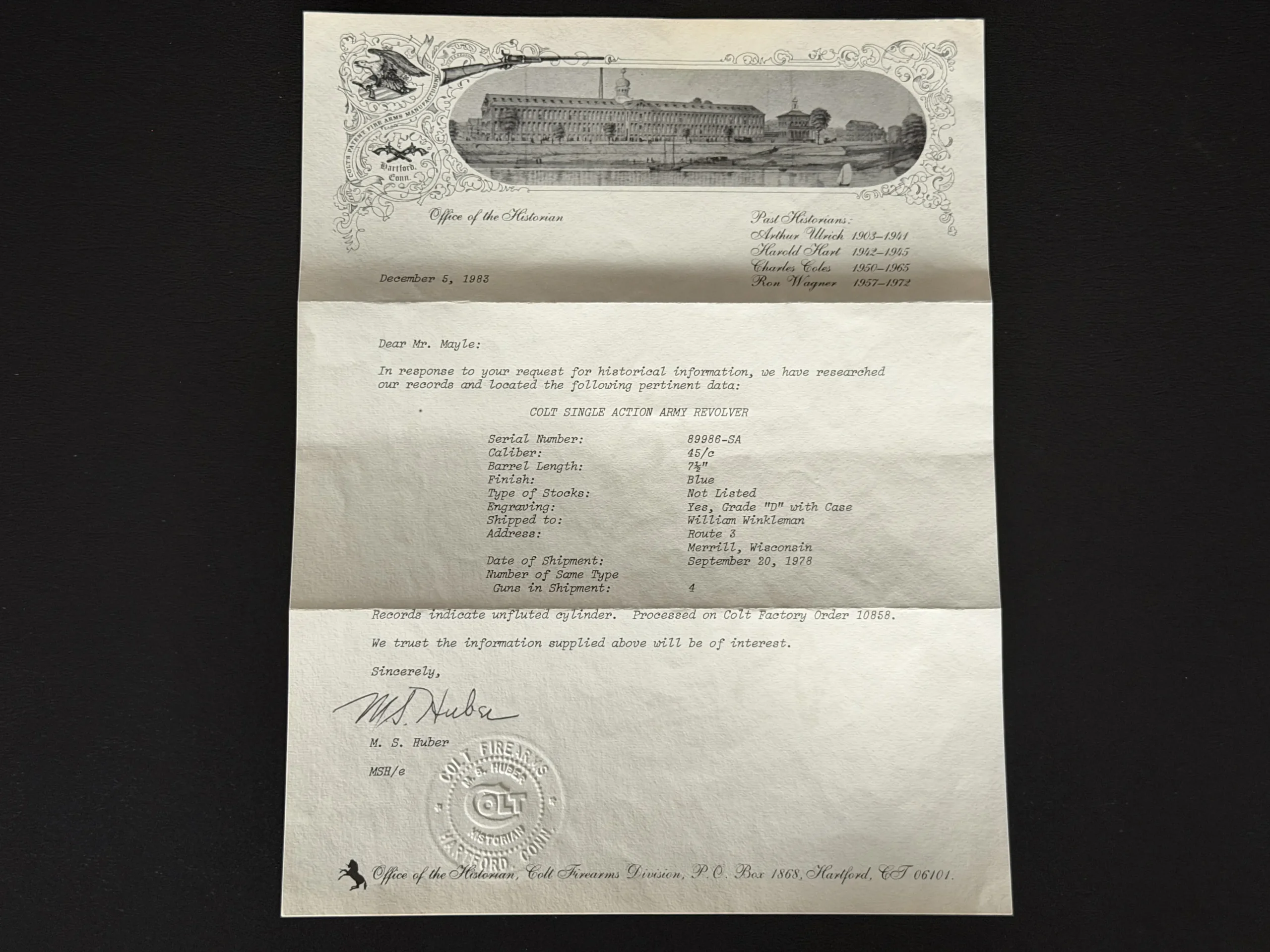 Completing this collector’s dream is its original Colt case, still intact, along with a Colt factory letter (dated 1983) confirming its authenticity and factory provenance. That kind of documentation doesn’t just add value—it seals the revolver’s story, turning admiration into trust.