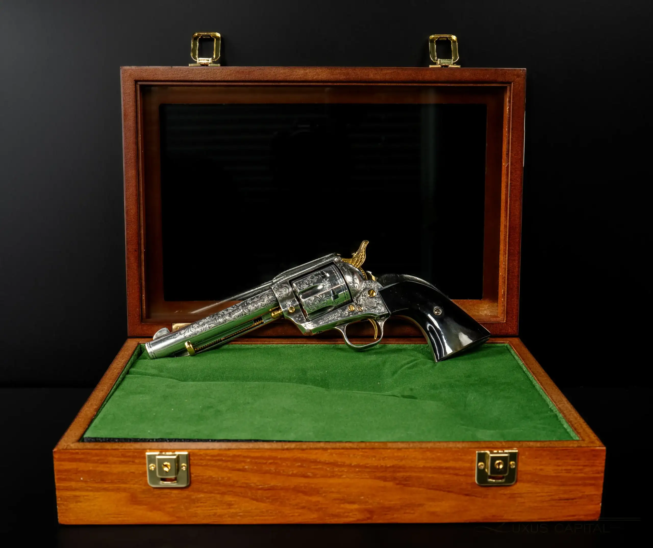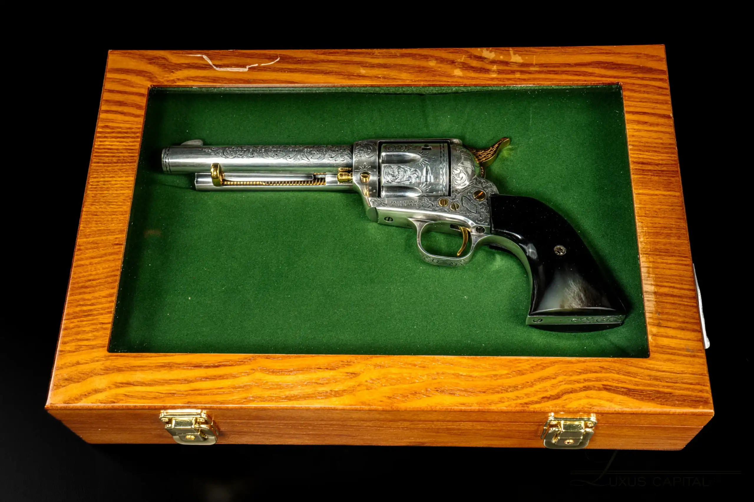 Chambered in .357 Magnum, this revolver maintains the proven reliability and handling qualities that made the Single-Action Army legendary while presenting itself as a piece destined for display and appreciation. The revolver is accompanied by a custom wood presentation case featuring a glass display lid and green felt interior, allowing the revolver to be admired while safely housed.