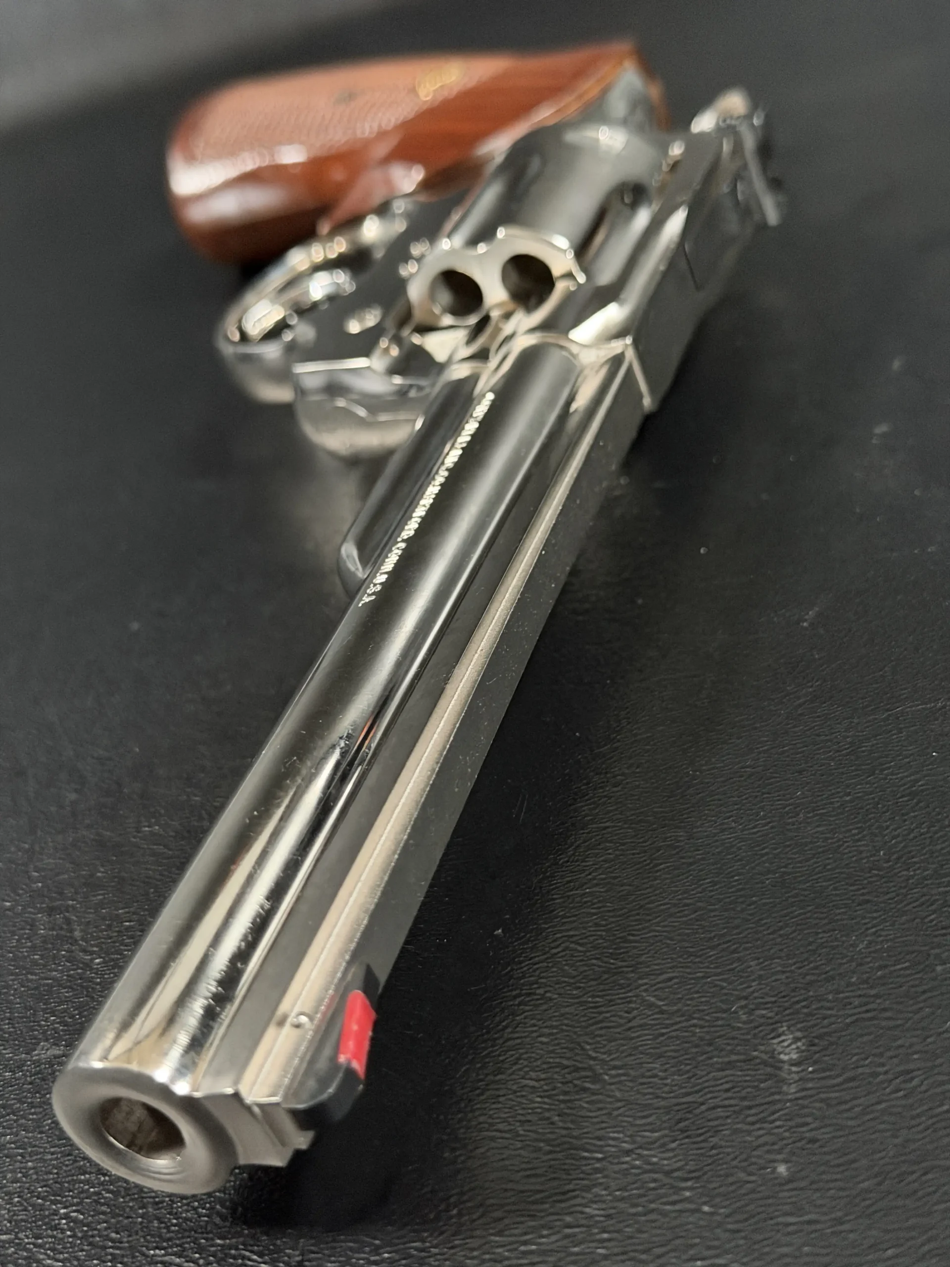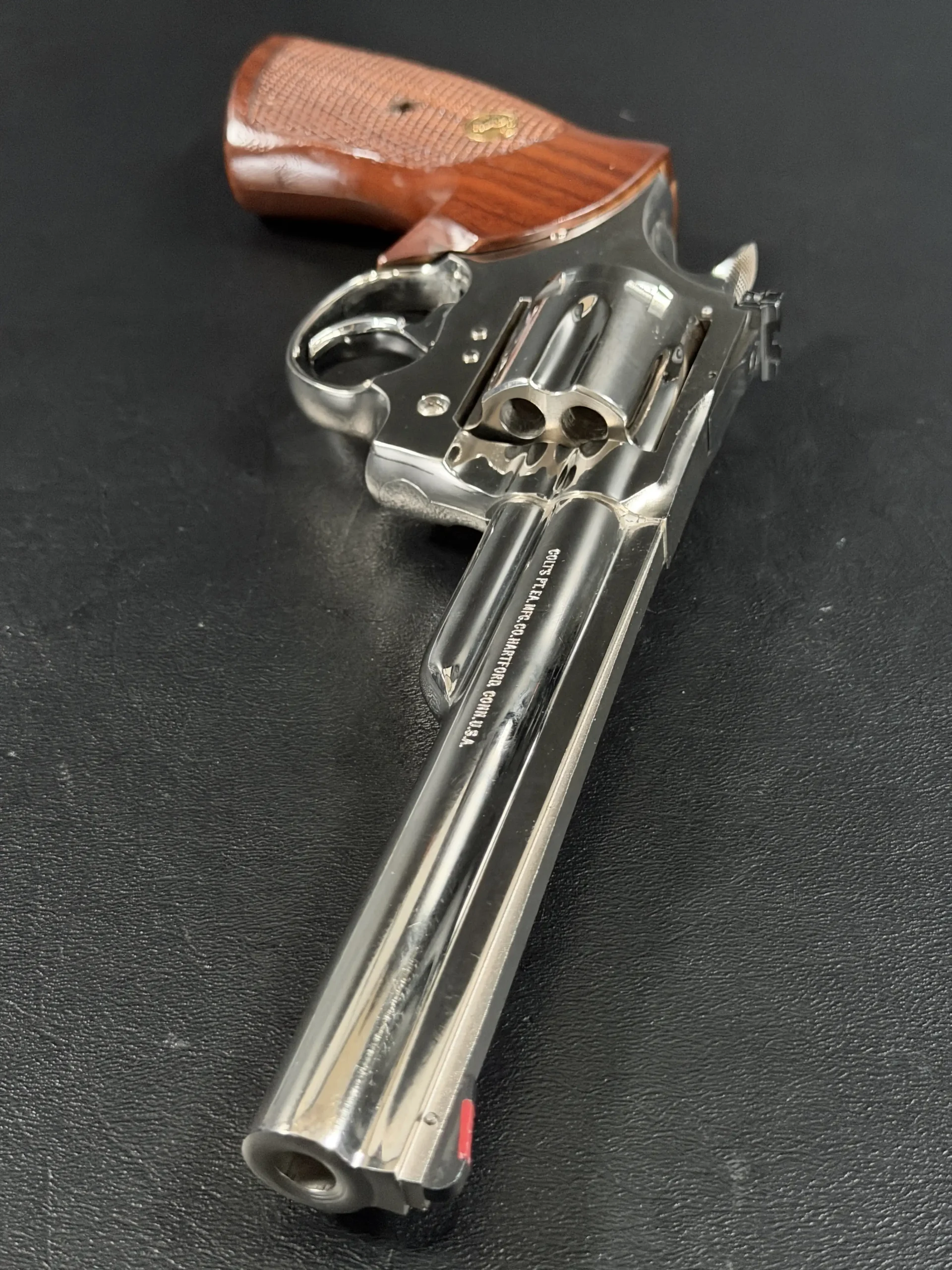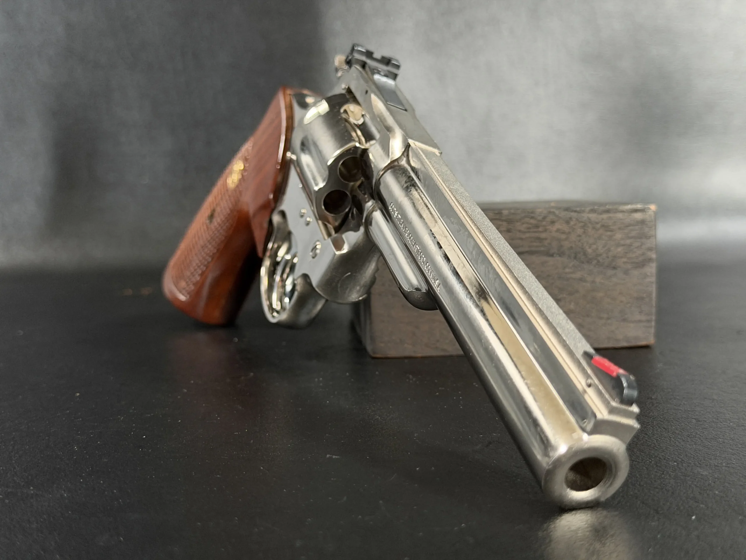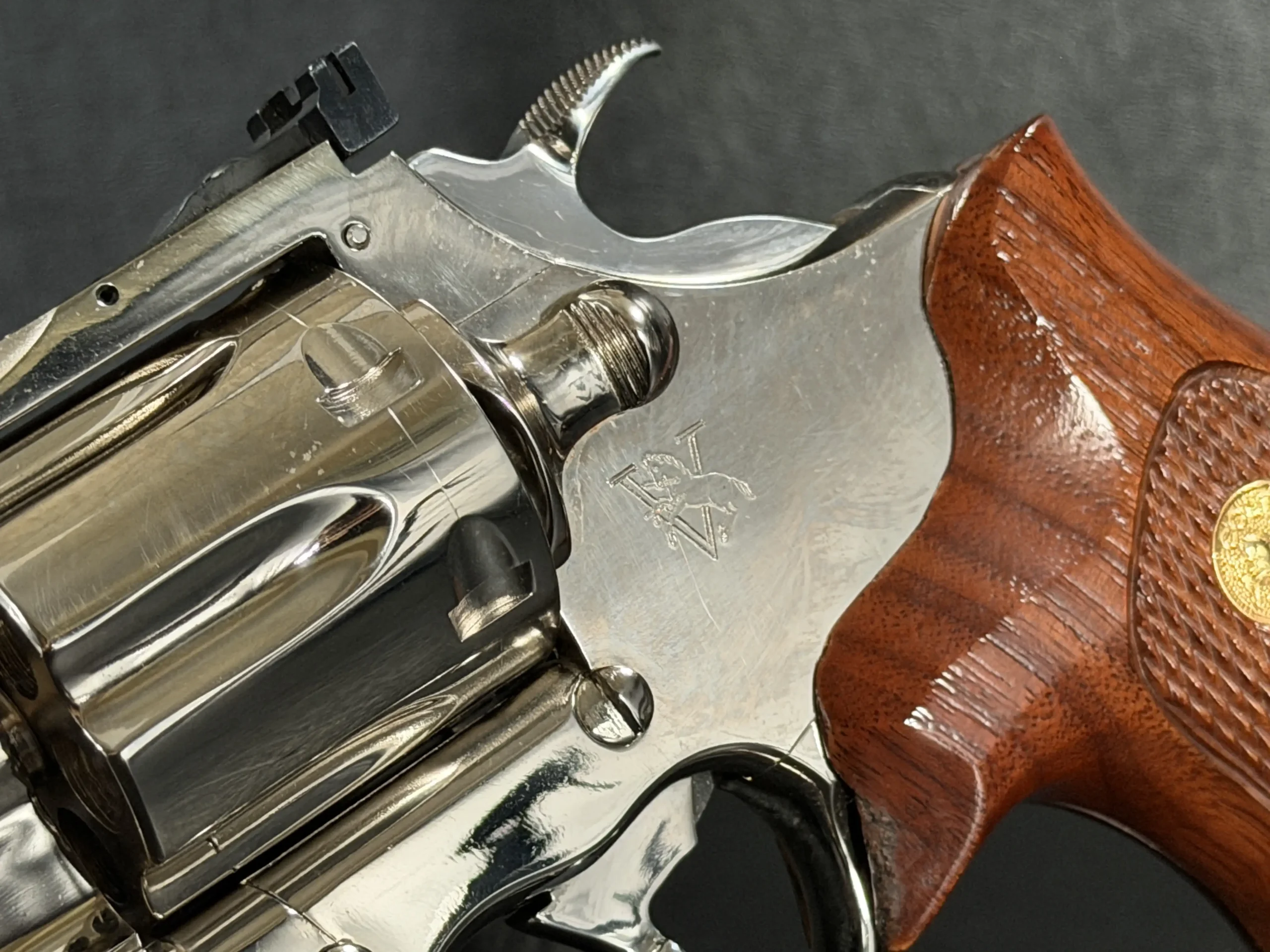 What immediately sets this example apart is its striking factory nickel finish paired with blue-accented sights. The polish is crisp and reflective, highlighting the clean lines of the ventilated rib barrel and full-lug profile. The revolver is fitted with varnished and checkered wraparound walnut stocks featuring gold-plated Rampant Colt medallions, complementing the bright metal finish with warmth and balance.