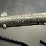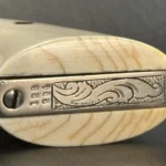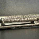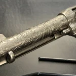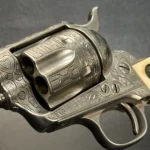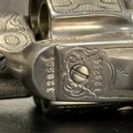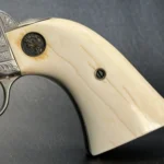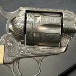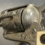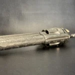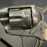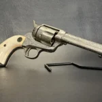 This 1889 Colt Single Action Army isn’t just a revolver—it’s a time capsule wrapped in nickel and Western pride. What makes it truly stand out? The striking custom engravings by David Harris, who didn’t just follow in the footsteps of Texas engraving icons like Cole Agee and Weldon Bledsoe—he honored them with every line and cattle brand carved into this piece. His homage to Texas ranching history comes alive in bold, stylized marks like the “2 Lazy 2 P” brand, all laid over a classic punch-dot background. It’s not just decoration—it’s storytelling in steel.