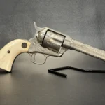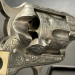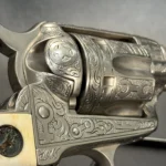 This 1889 Colt Single Action Army is masterfully engraved by David Harris in the classic Texas cattle brand style, inspired by legends like Cole Agee and Weldon Bledsoe. Featuring over 99% of its original brushed nickel finish and matching serial numbers, it’s a striking collector’s piece with verified authenticity and timeless Western charm.