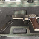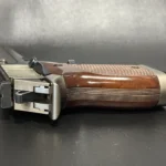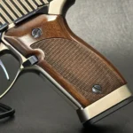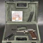 This particular piece is in outstanding condition, complete with its original factory case, the rare CD-style owner’s manual, and two extra magazines. The hardwood grips have that chunky, old-school heft with deep checkering that bites in just right. The rear slide serrations are cut deep, the rear sight is fully adjustable because yes, it’s pretty, but it’s also meant to perform. Chambered in 9x21mm IMI, it’s a fascinating slice of 1990s firearm history explicitly designed to skirt Italy’s restriction on military calibers. A clever workaround that gave collectors something rare and a little rebellious.