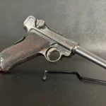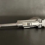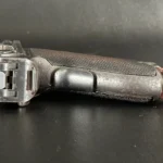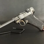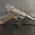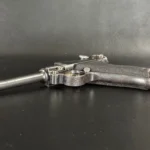 This particular Luger is equipped with a grip safety and an unmarked thumb safety, with the “safe” position polished to a bright finish. It features an early breech block and frame, along with a wide trigger guard and a narrow trigger. Notably, all numbered parts are matching except for the left grip (72).