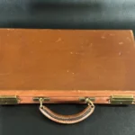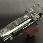 Everything about this pistol feels intentional—the balance, the texture, the subtle transition between blued steel and strawed hardware. It comes housed in a leather-covered presentation case lined in dark green felt, complete with two spare magazines, two screwdrivers, and compartments for ammunition and cleaning tools. (As noted, the original keys are no longer present.)