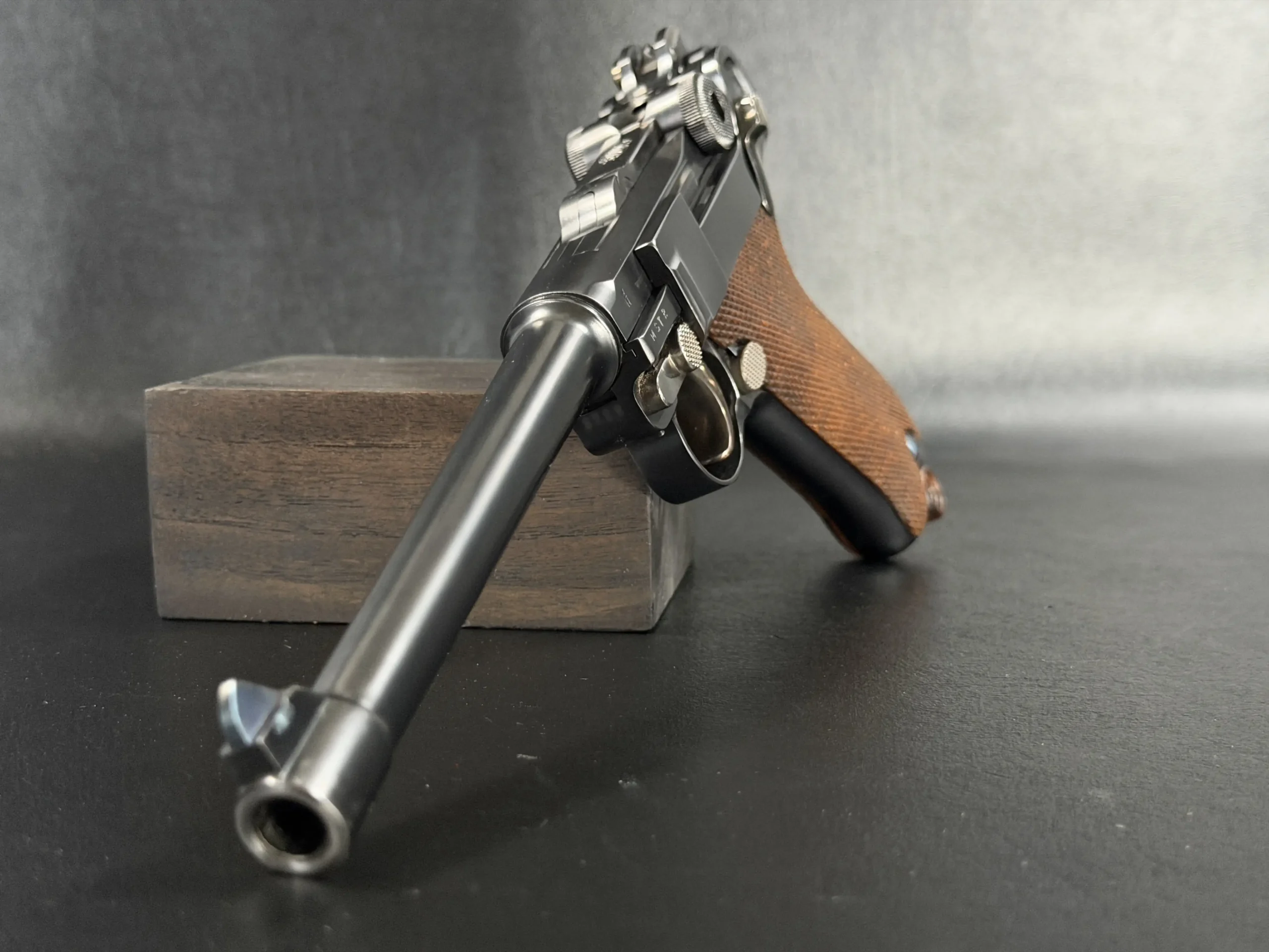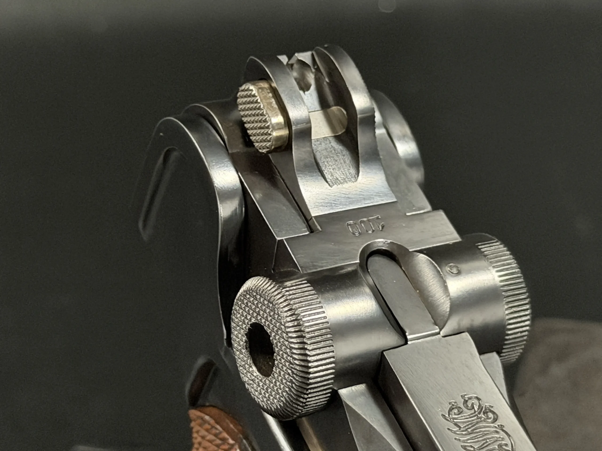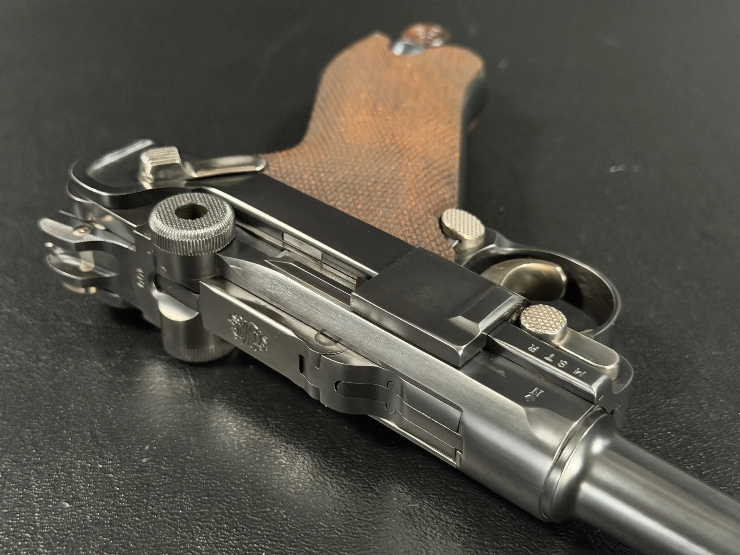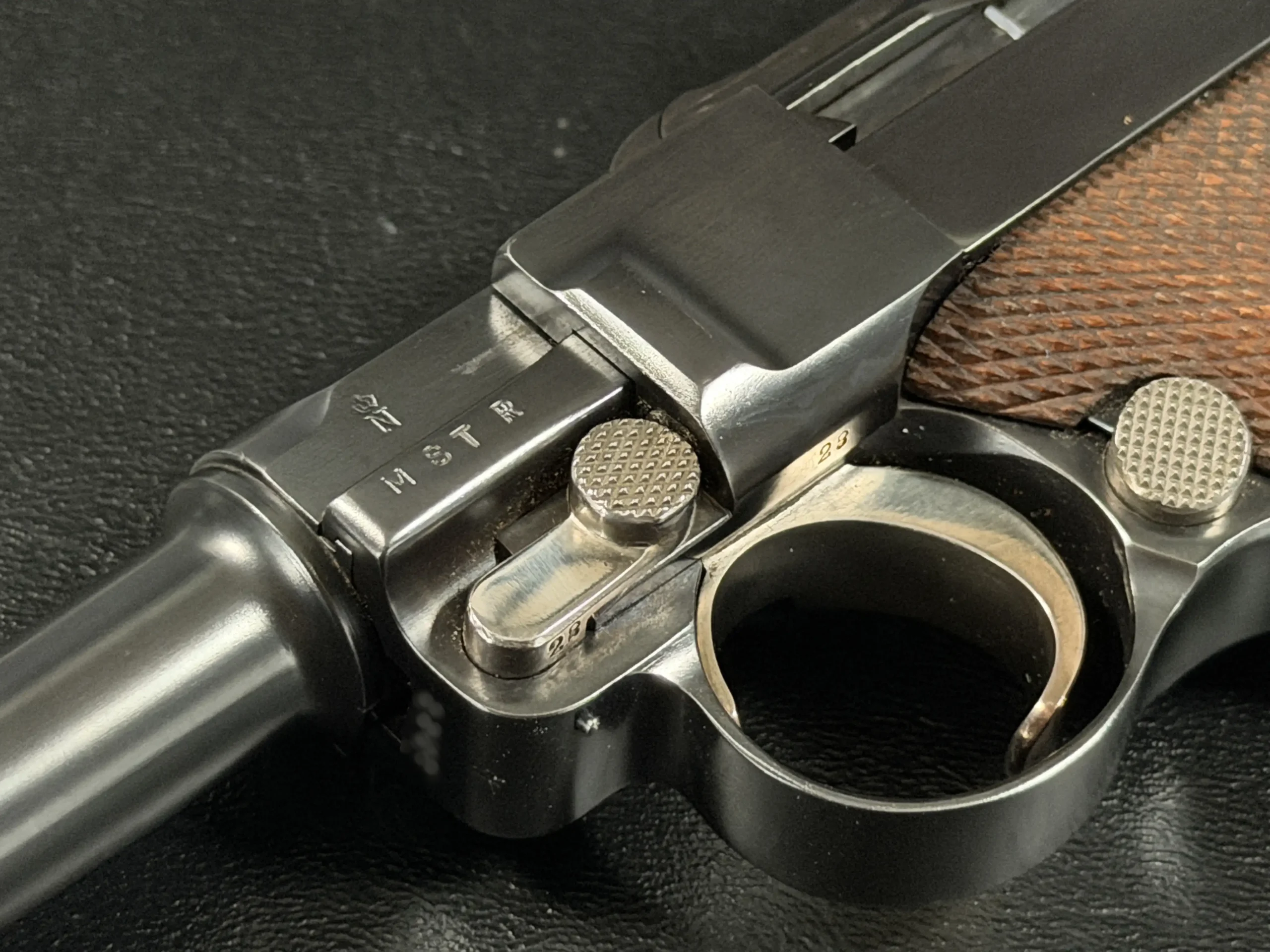 One of the defining characteristics of this pistol is John Martz’s proprietary Martz Toggle Release (MSTR) mechanism, a discreet but highly regarded refinement of the traditional Luger operating system. Unlike standard Lugers, which require the toggle to be manually manipulated from the rear, the MSTR system incorporates a frame-mounted release that allows the toggle assembly to be dropped and cycled with greater ease. Martz engineered this feature to improve handling while preserving the visual balance and mechanical integrity of the Luger design. Subtly integrated and unobtrusive, the MSTR enhances usability without detracting from the pistol’s classic silhouette, and it remains one of the most recognizable signatures of Martz’s work.