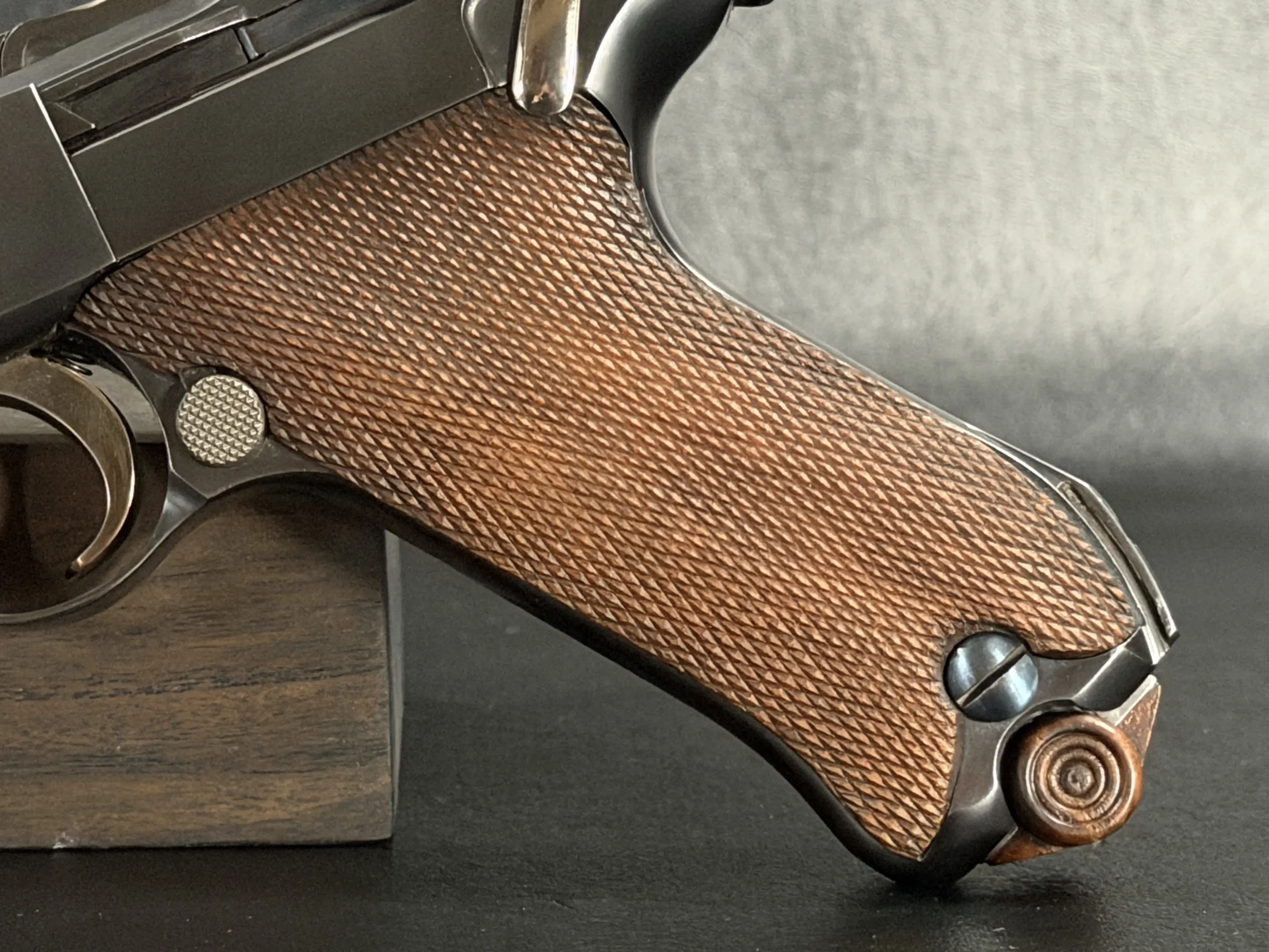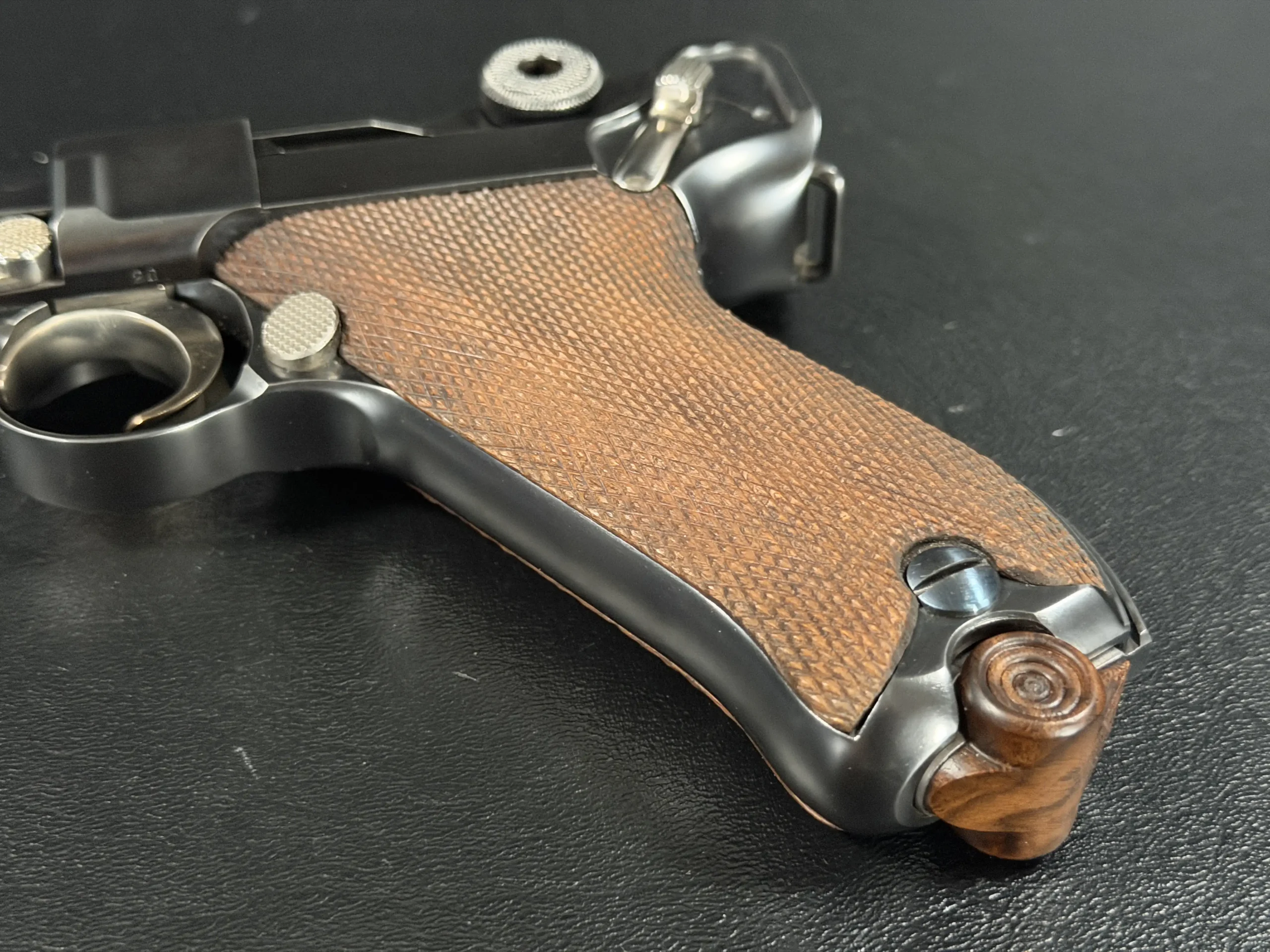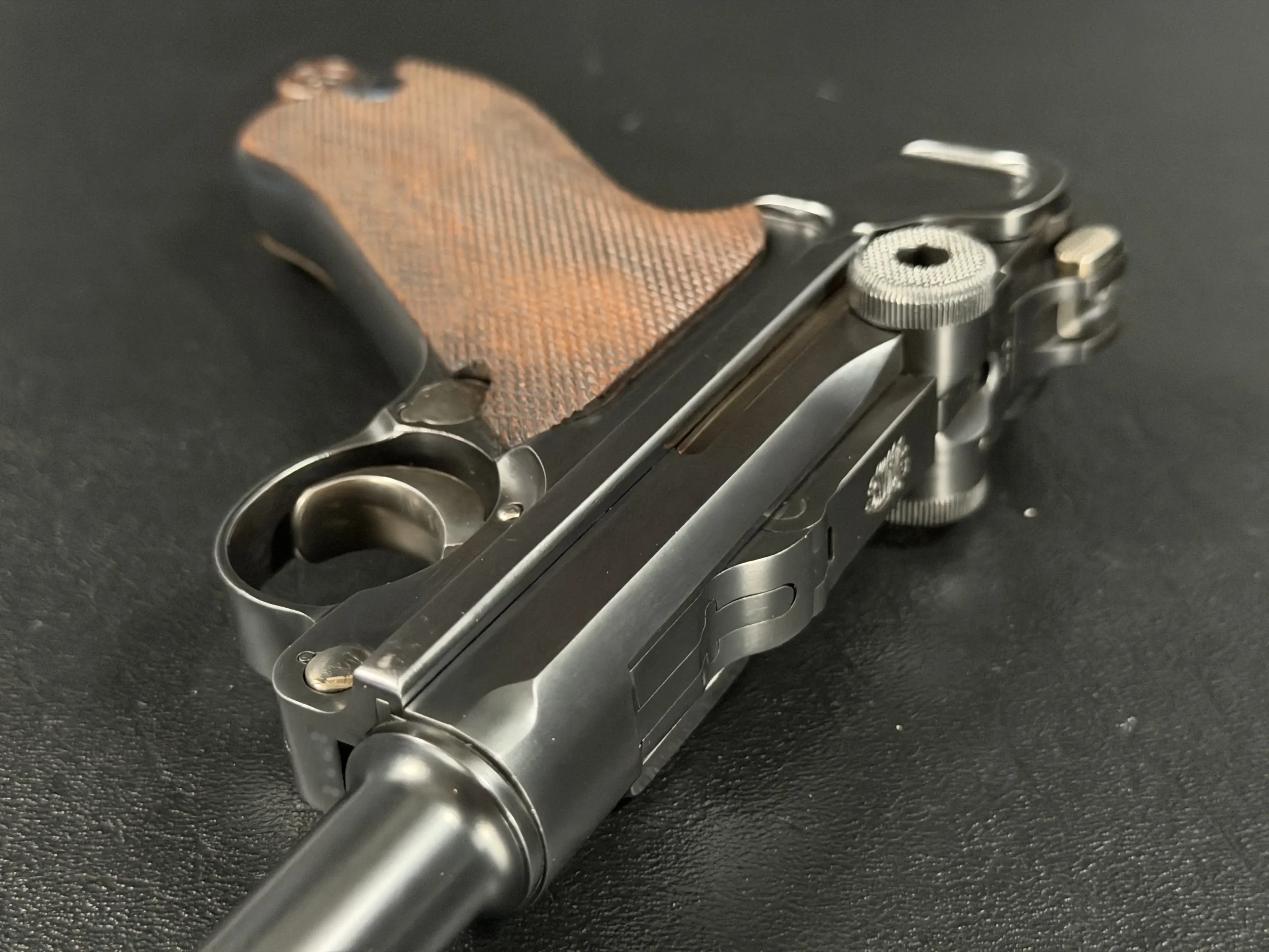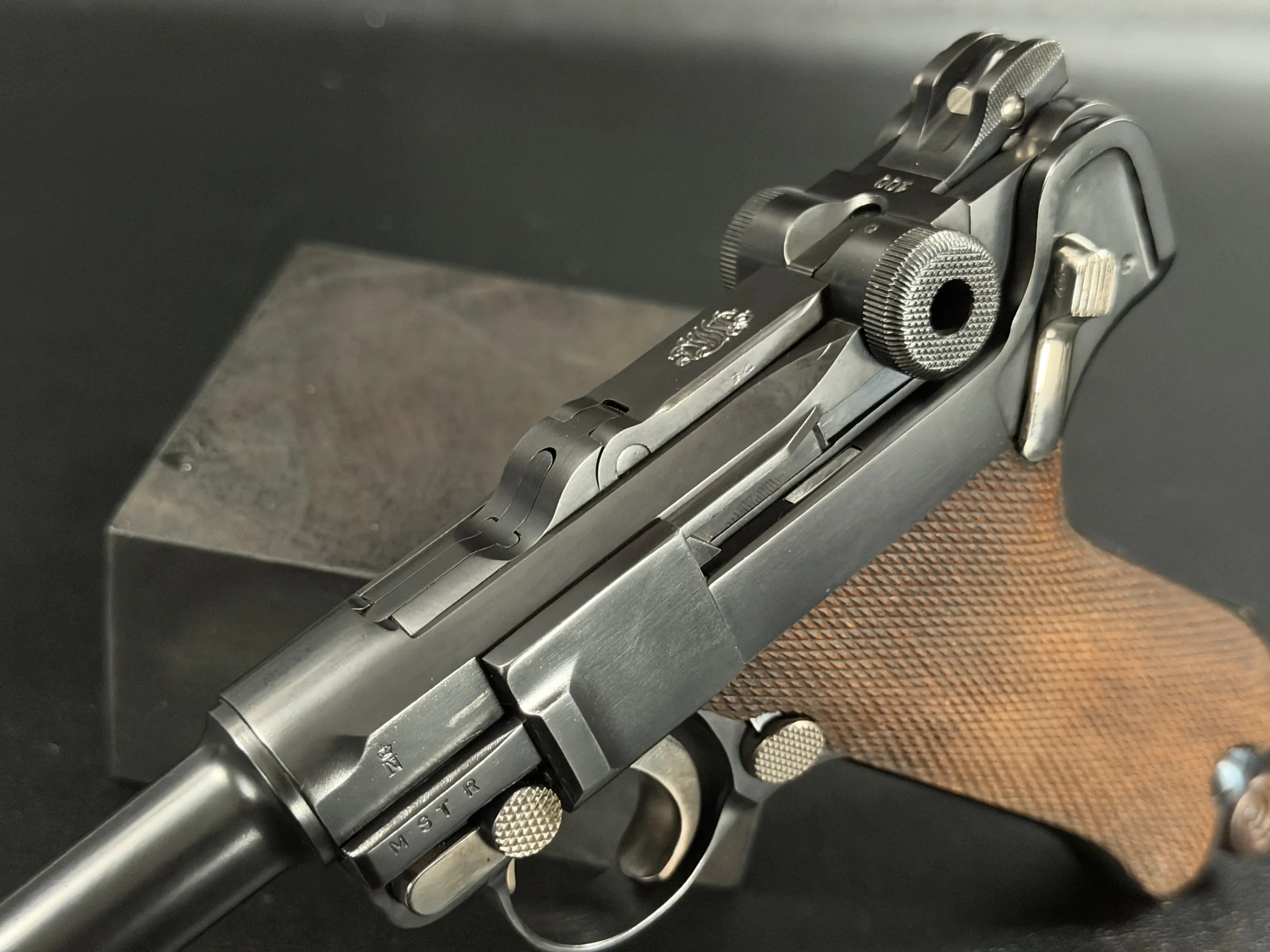 One of the defining characteristics of this pistol is John Martz’s proprietary Martz Toggle Release (MSTR) mechanism, a discreet but highly regarded refinement of the traditional Luger operating system. Unlike standard Lugers, which require the toggle to be manually manipulated from the rear, the MSTR system incorporates a frame-mounted release that allows the toggle assembly to be dropped and cycled with greater ease. Martz engineered this feature to improve handling while preserving the visual balance and mechanical integrity of the Luger design. Subtly integrated and unobtrusive, the MSTR enhances usability without detracting from the pistol’s classic silhouette, and it remains one of the most recognizable signatures of Martz’s work.