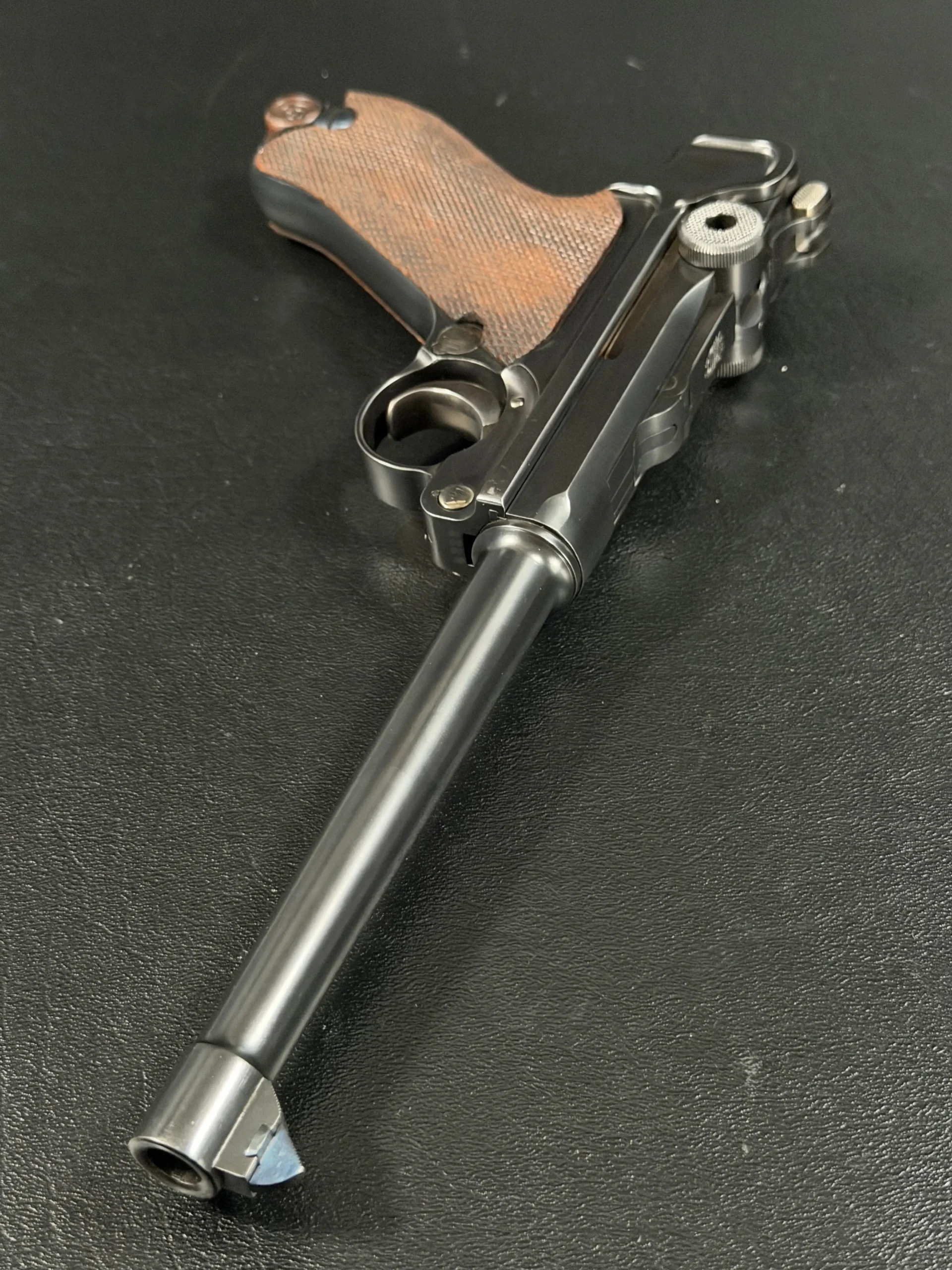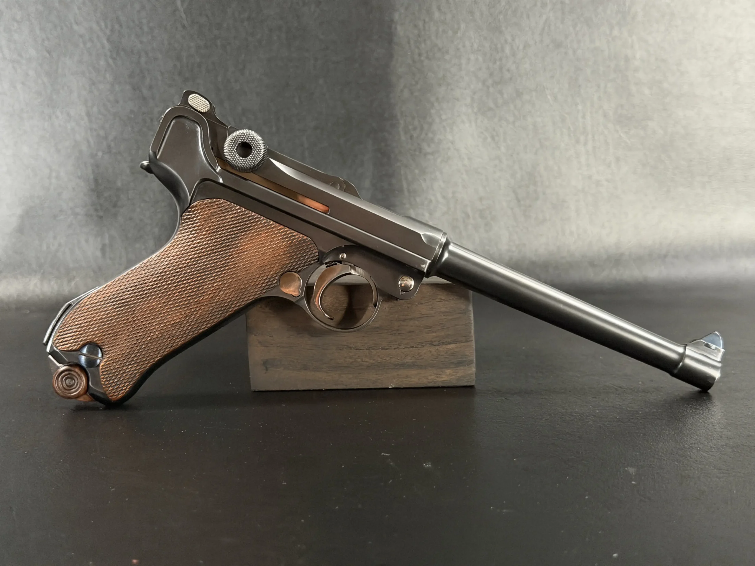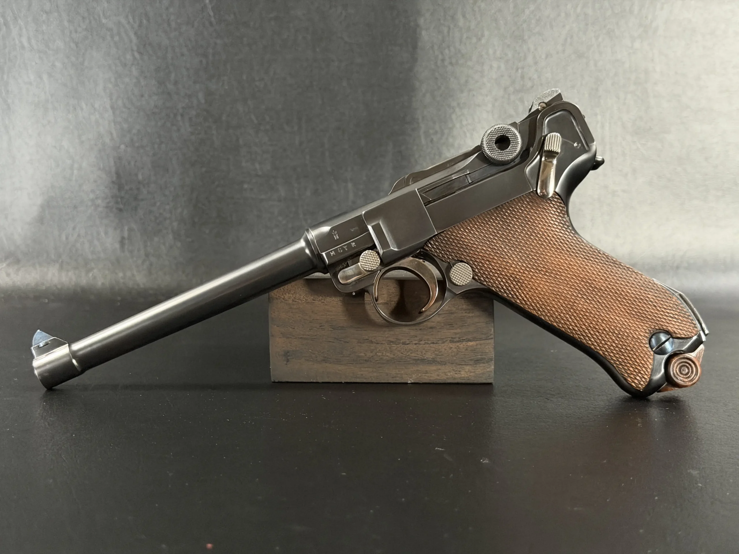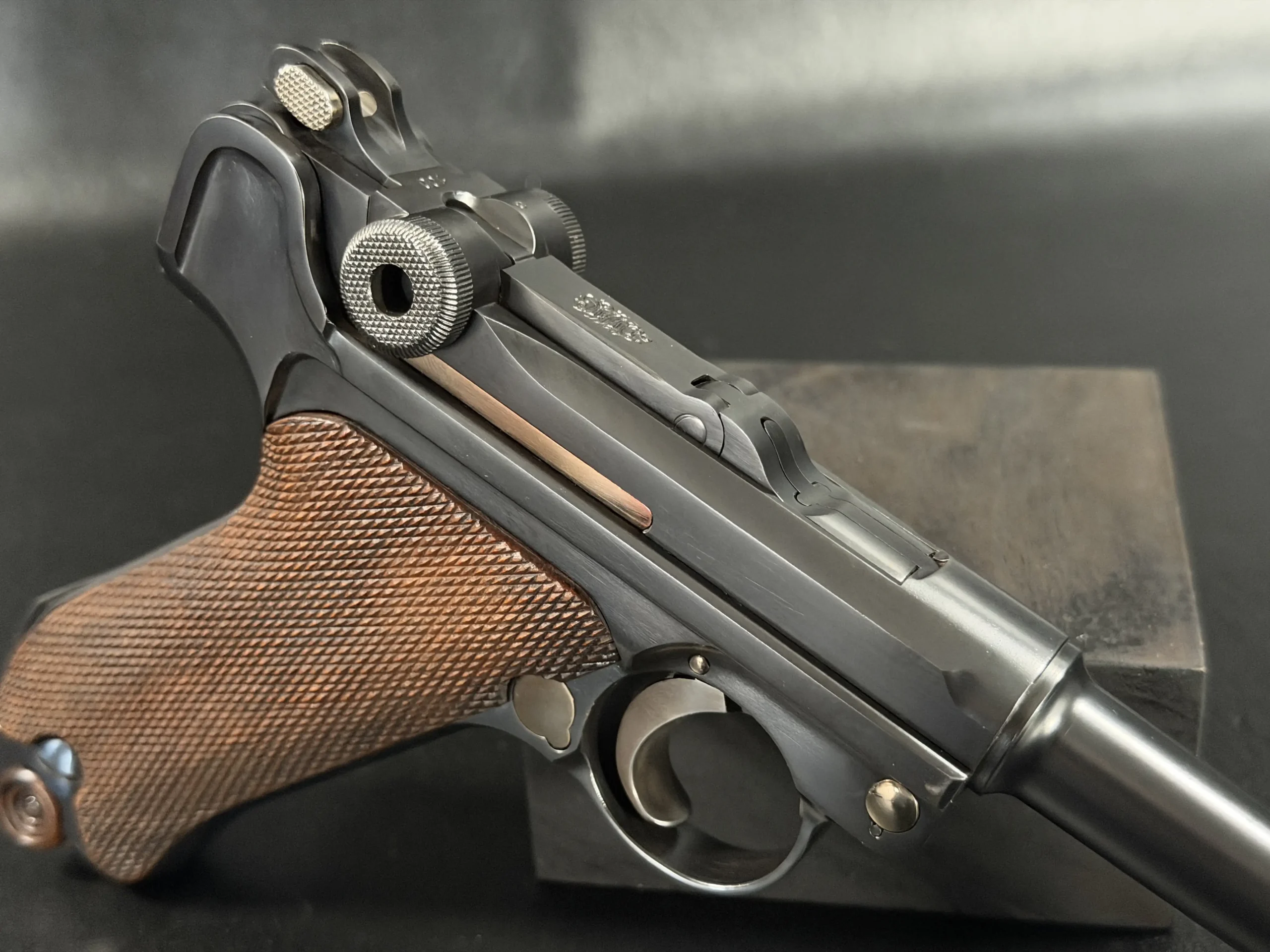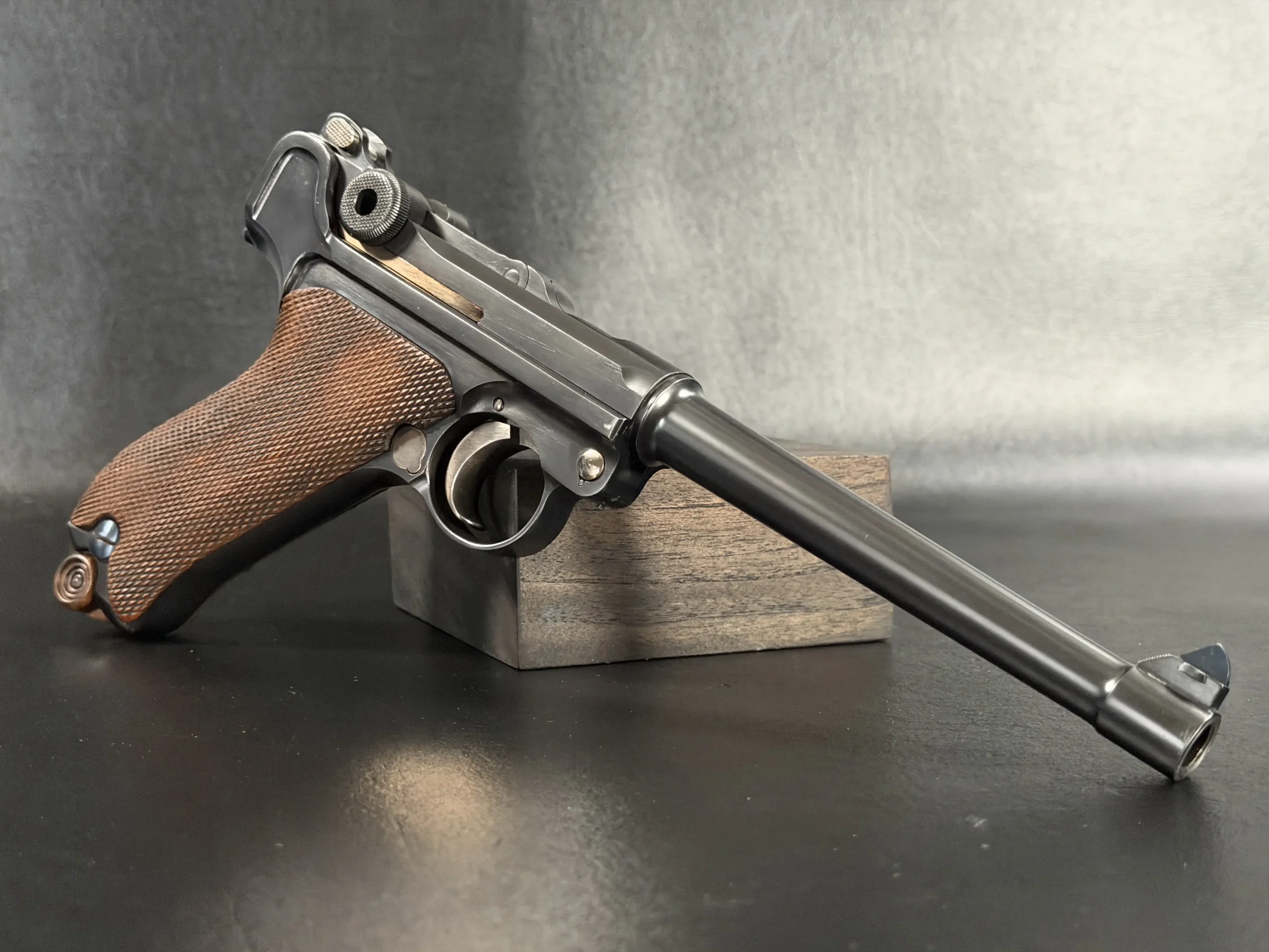 The pistol features the distinctive long 6-inch barrel and classic Navy profile, immediately setting it apart from standard commercial Lugers. A fixed blade front sight is paired with a two-position tangent rear sight adjustable from 100 to 200 meters, reinforcing the authentic Navy configuration. The blank chamber maintains clean, uninterrupted lines, while the iconic “DWM” monogram on the front toggle link and the crown/N proof on the left side of the barrel extension anchor the pistol firmly in its commercial German lineage.