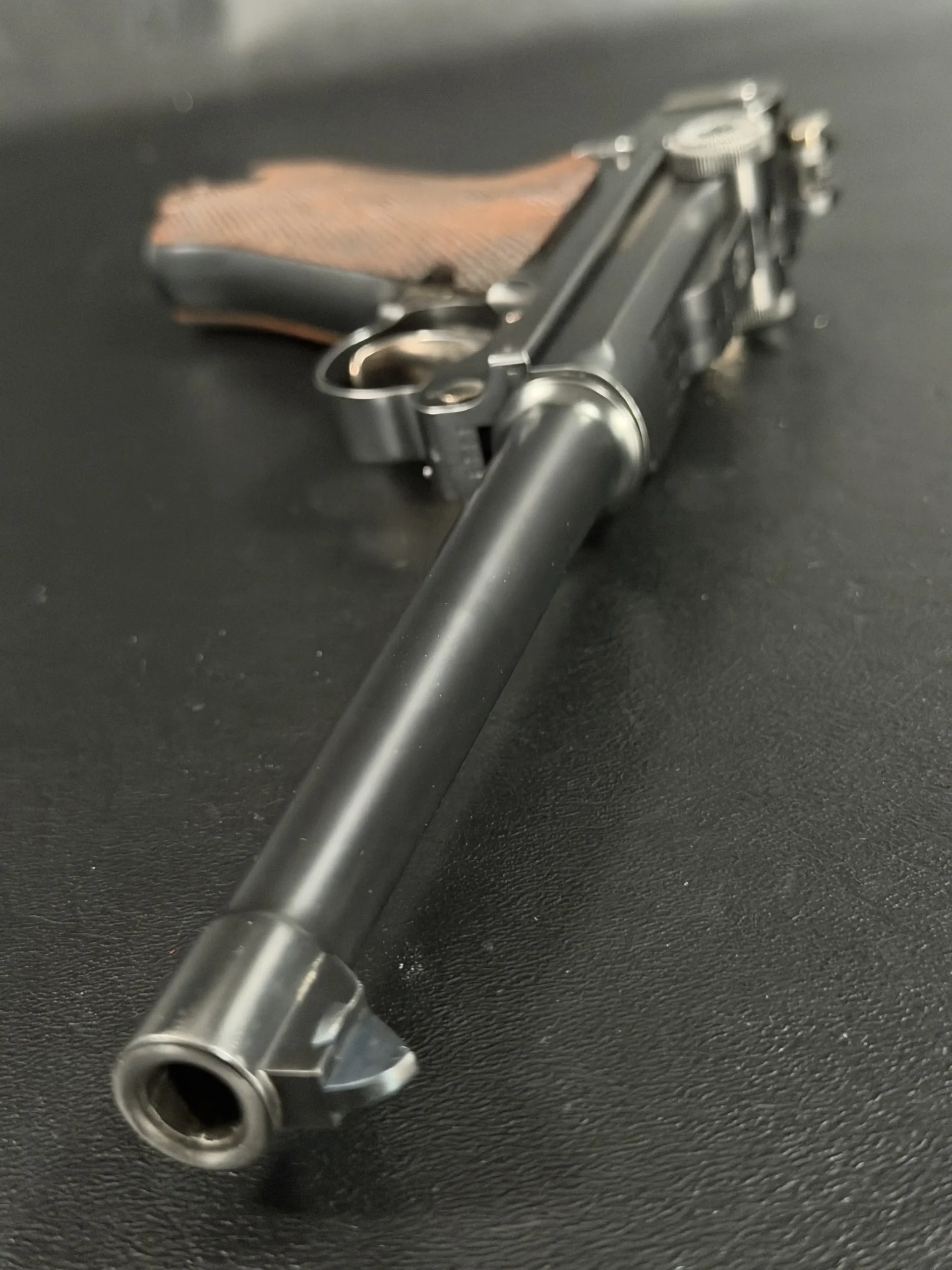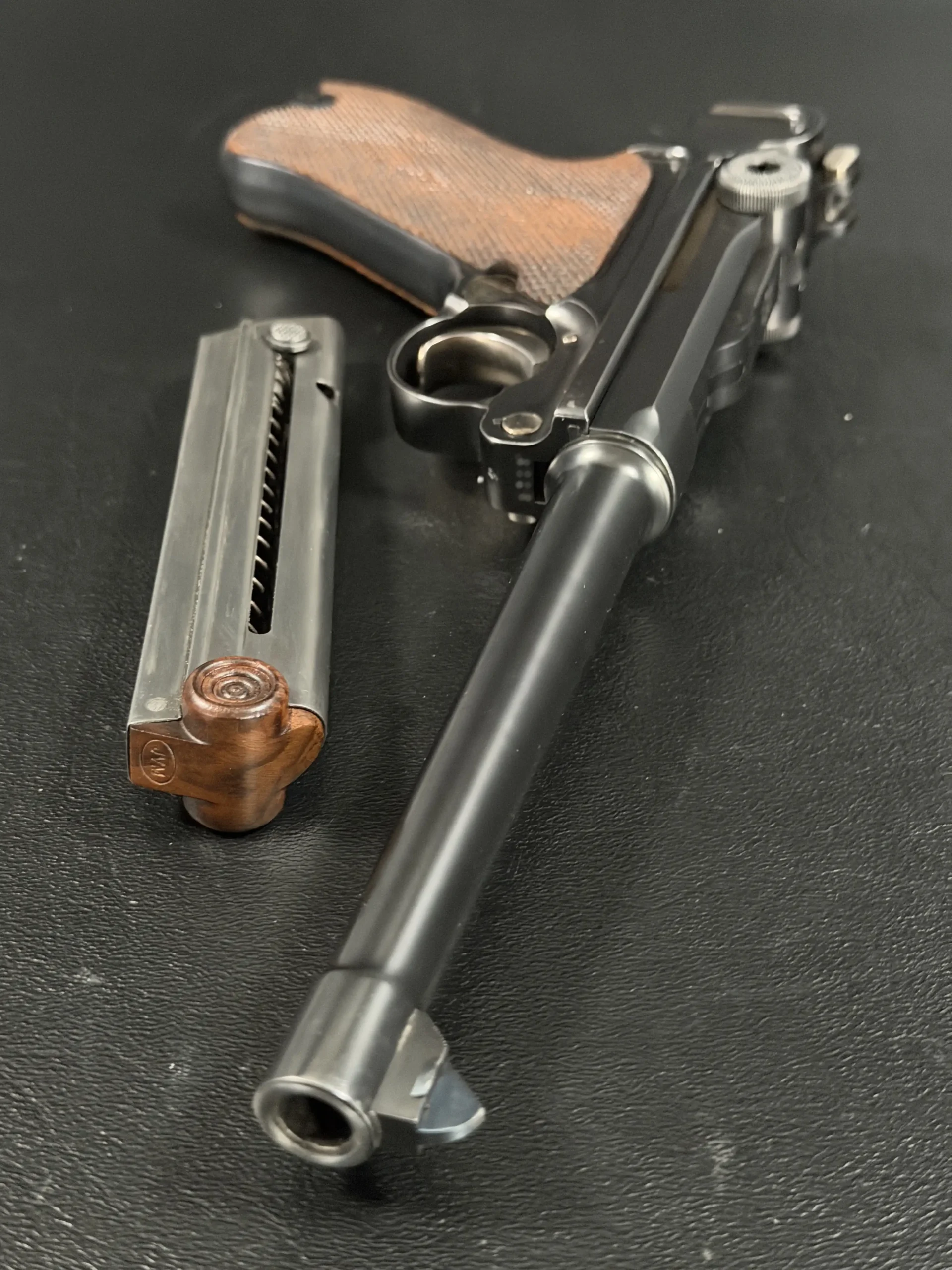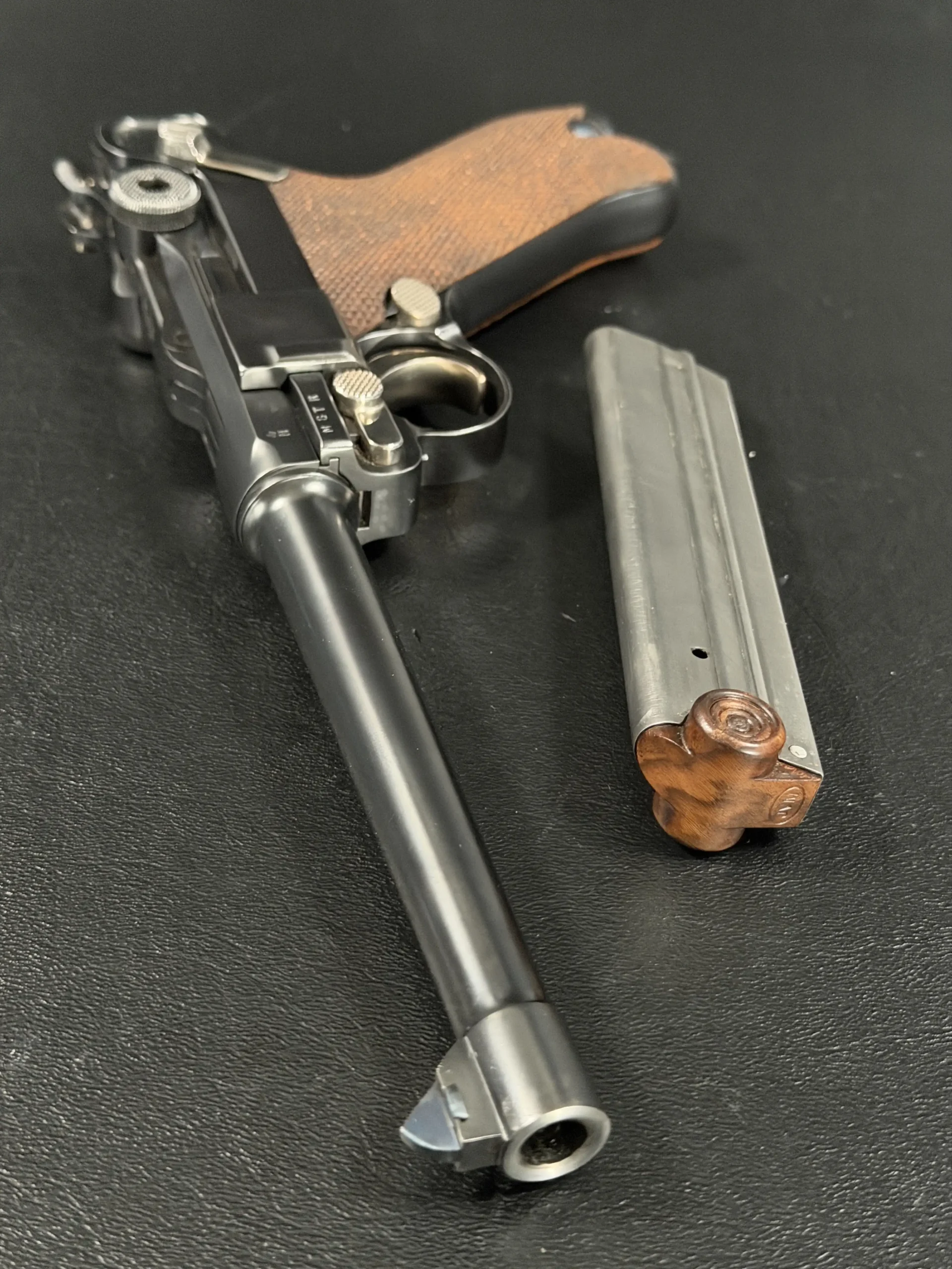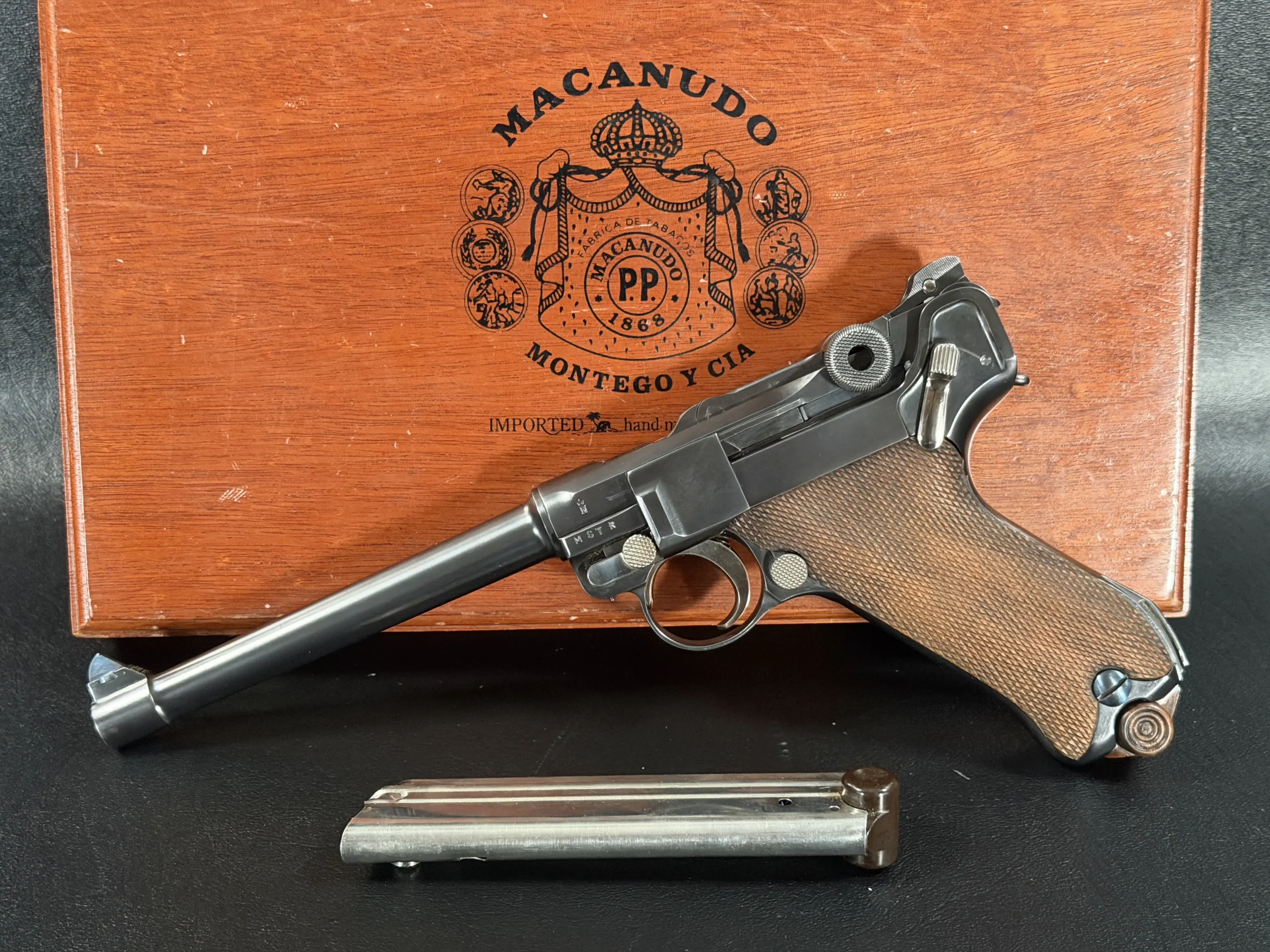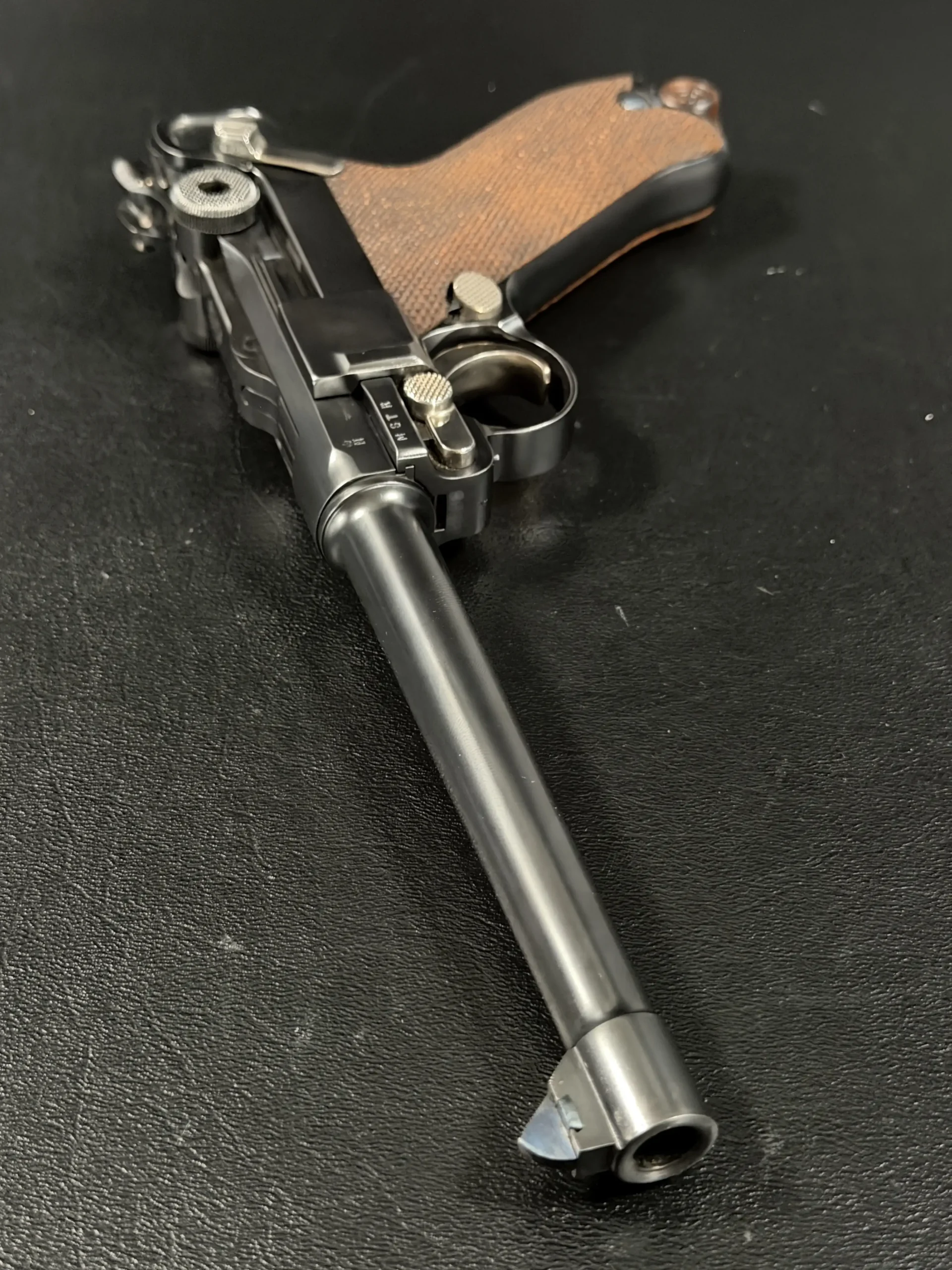 The pistol features the distinctive long 6-inch barrel and classic Navy profile, immediately setting it apart from standard commercial Lugers. A fixed blade front sight is paired with a two-position tangent rear sight adjustable from 100 to 200 meters, reinforcing the authentic Navy configuration. The blank chamber maintains clean, uninterrupted lines, while the iconic “DWM” monogram on the front toggle link and the crown/N proof on the left side of the barrel extension anchor the pistol firmly in its commercial German lineage.