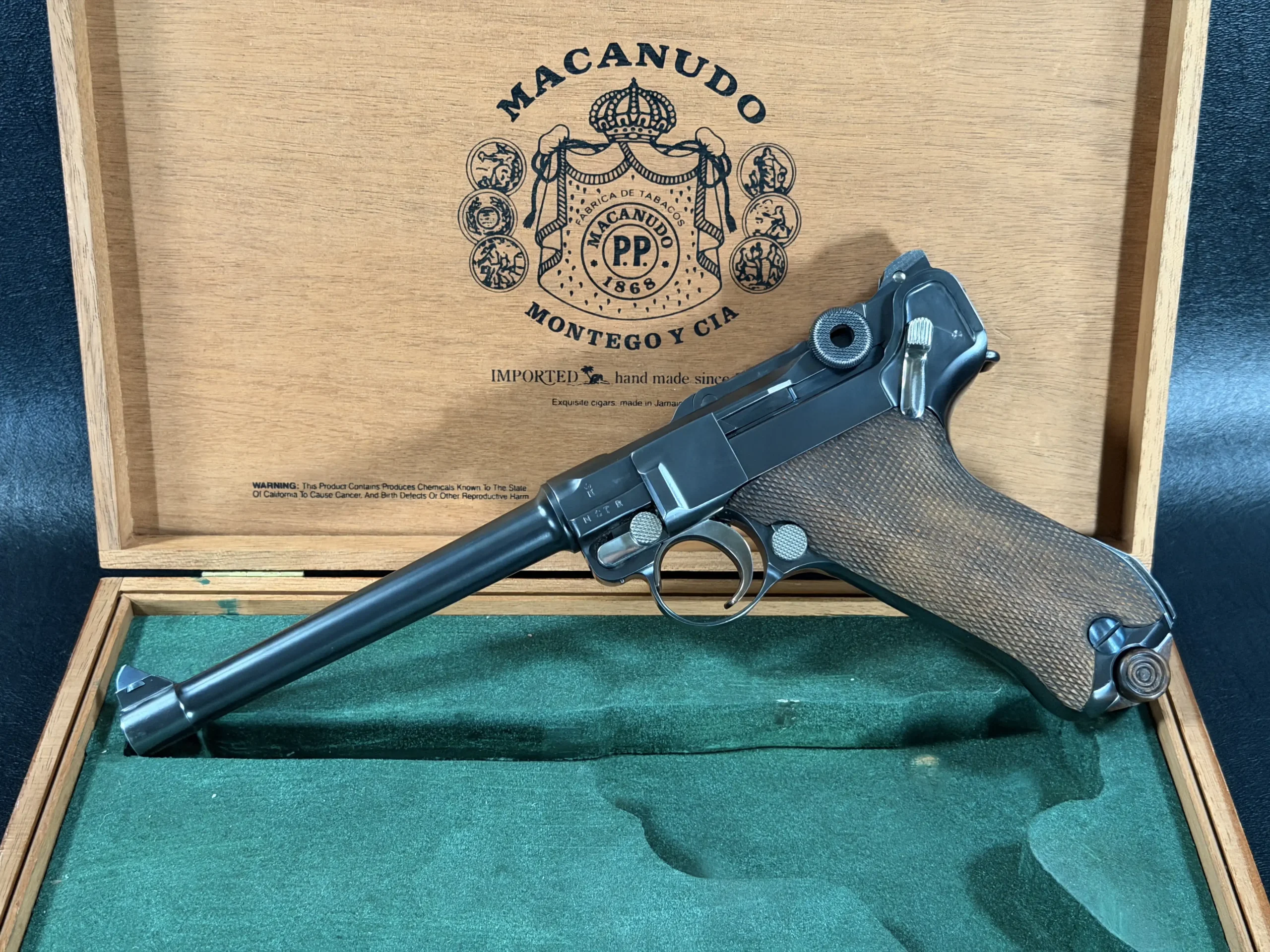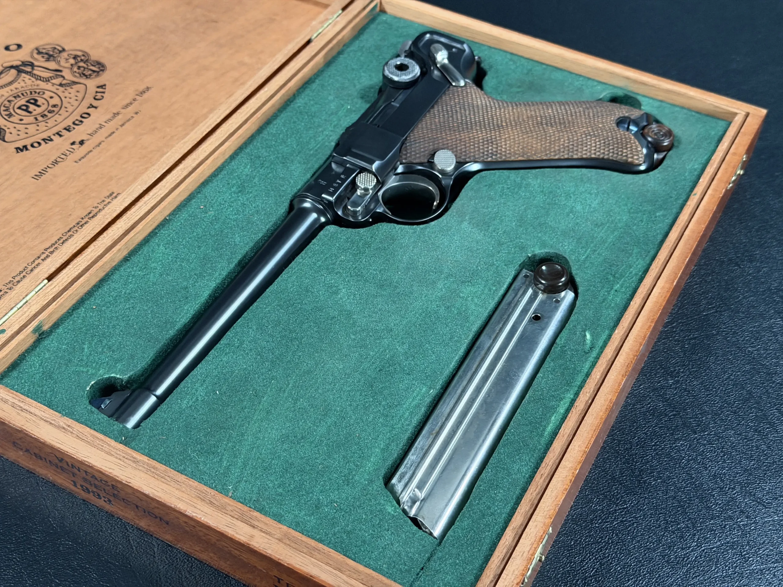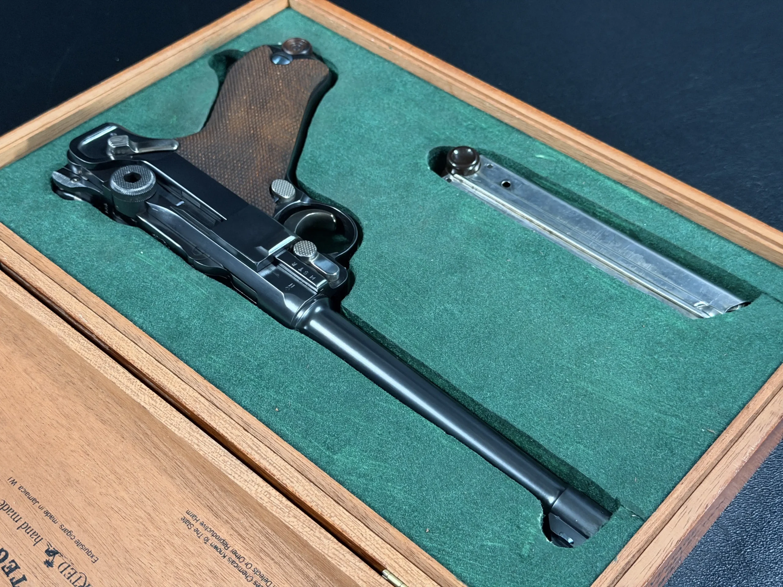 Completing the presentation is a hardwood Macanudo “Number XX” cigar box that has been thoughtfully converted into a fitted display case. Lined to accommodate the pistol and a spare magazine, the case adds a distinctive, period-appropriate touch that underscores the bespoke nature of this piece.