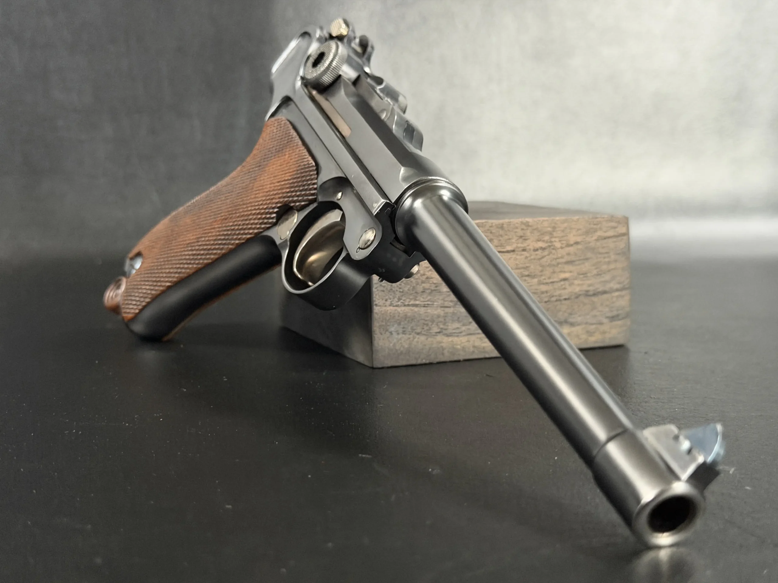 This exceptional custom Luger exemplifies the finest work of John Martz, whose name is inseparable from the highest echelon of bespoke Parabellum pistols. Working with a carefully selected combination of newly manufactured and extensively modified original Luger components, Martz produced a limited number of custom variants that balanced historical fidelity with thoughtful mechanical refinement. This example closely follows the Second Model Commercial Navy Luger and reflects Martz’s deep understanding of both the platform’s heritage and its mechanical potential.