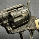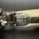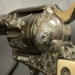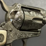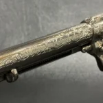 The revolver features approximately 50% scroll engraving, set against a punch-dot background, with a starburst design at the bottom of the trigger guard. Harris, who signed his work on the butt “DW Harris,” is a student of the famous engraver Weldon Bledsoe, who himself learned from the legendary Cole Agee. This lineage cements the revolver’s heritage in the finest engraving traditions, a fact that will surely resonate with collectors.