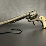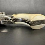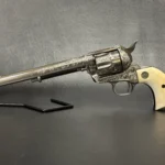 This piece retains 99% of its nickel-plated finish, presenting near-excellent overall condition. The two-piece smooth grips feature Colt medallions, though they show some signs of wear, including a small crack at the bottom front of the left grip and a dent on the left point of the toe of the grip frame. Despite these minor imperfections, the revolver’s condition is a testament to its quality.