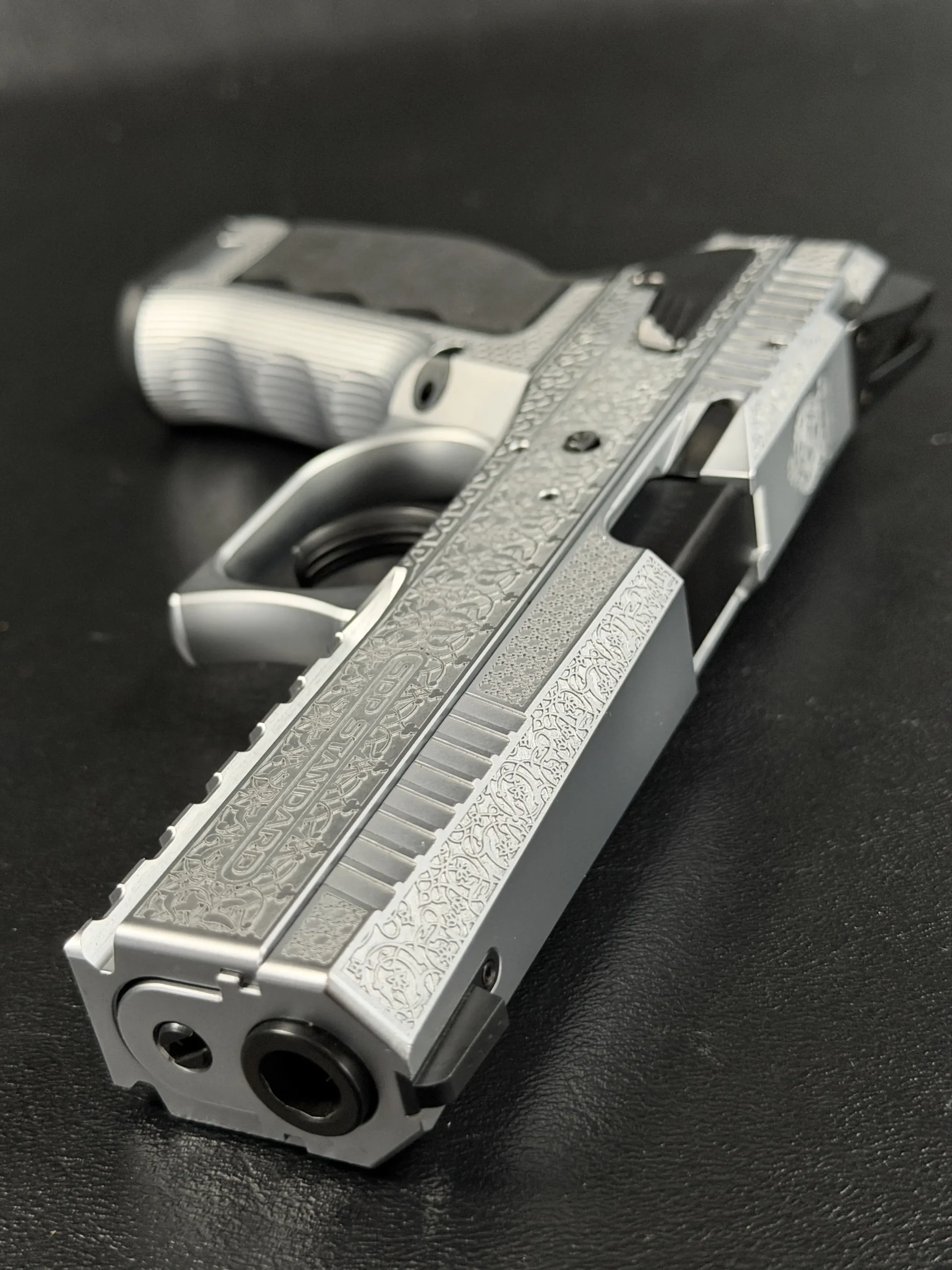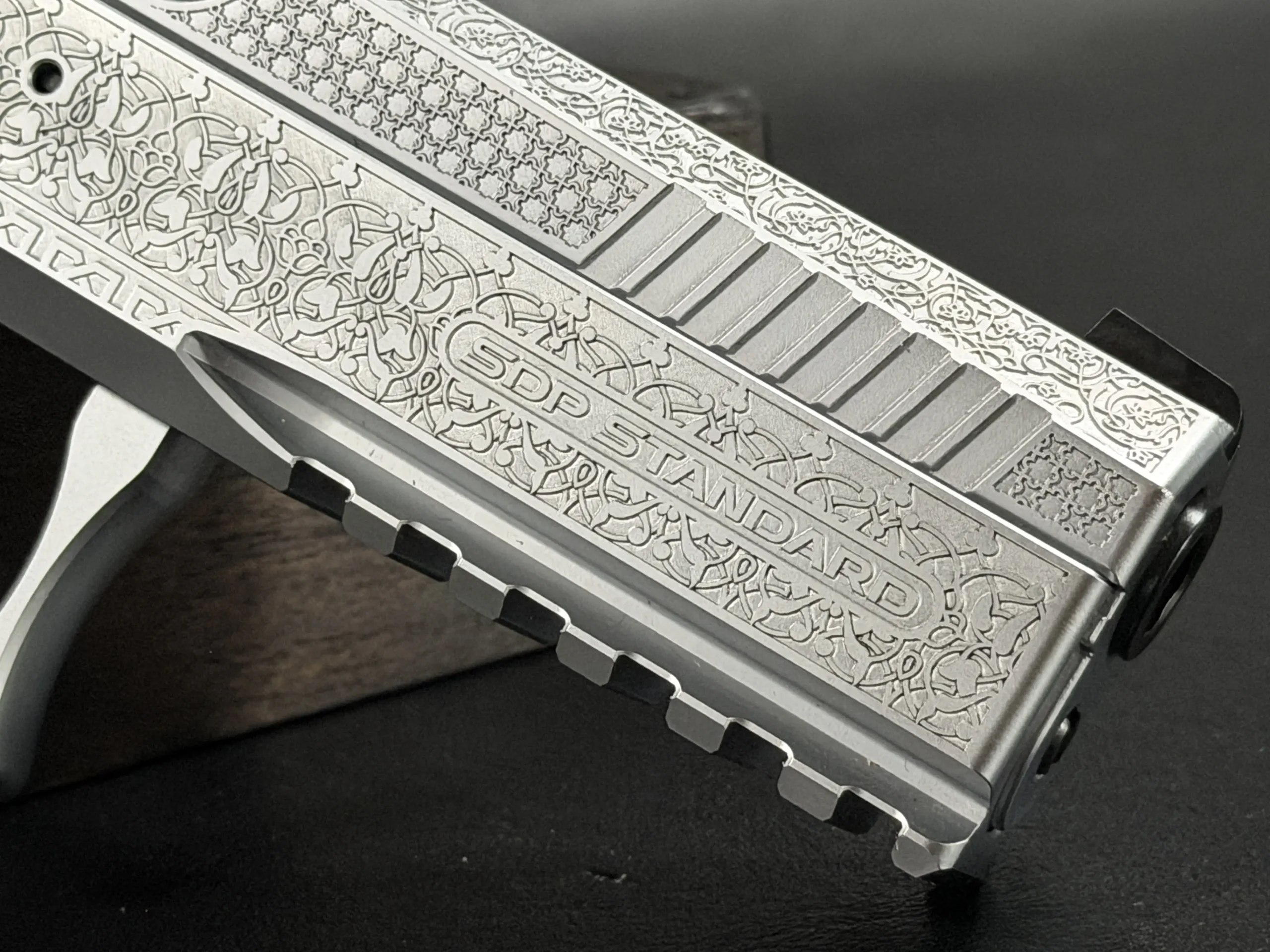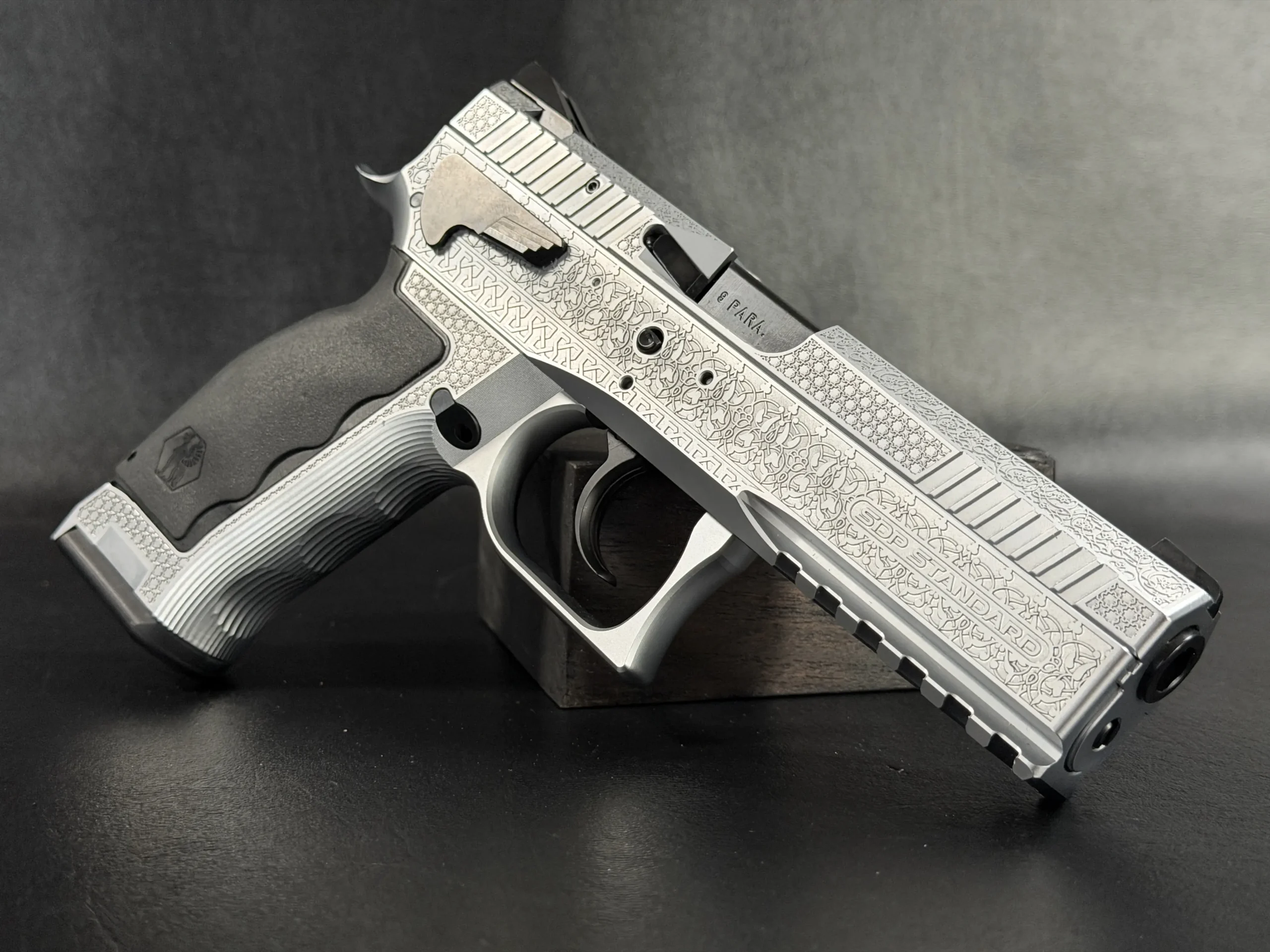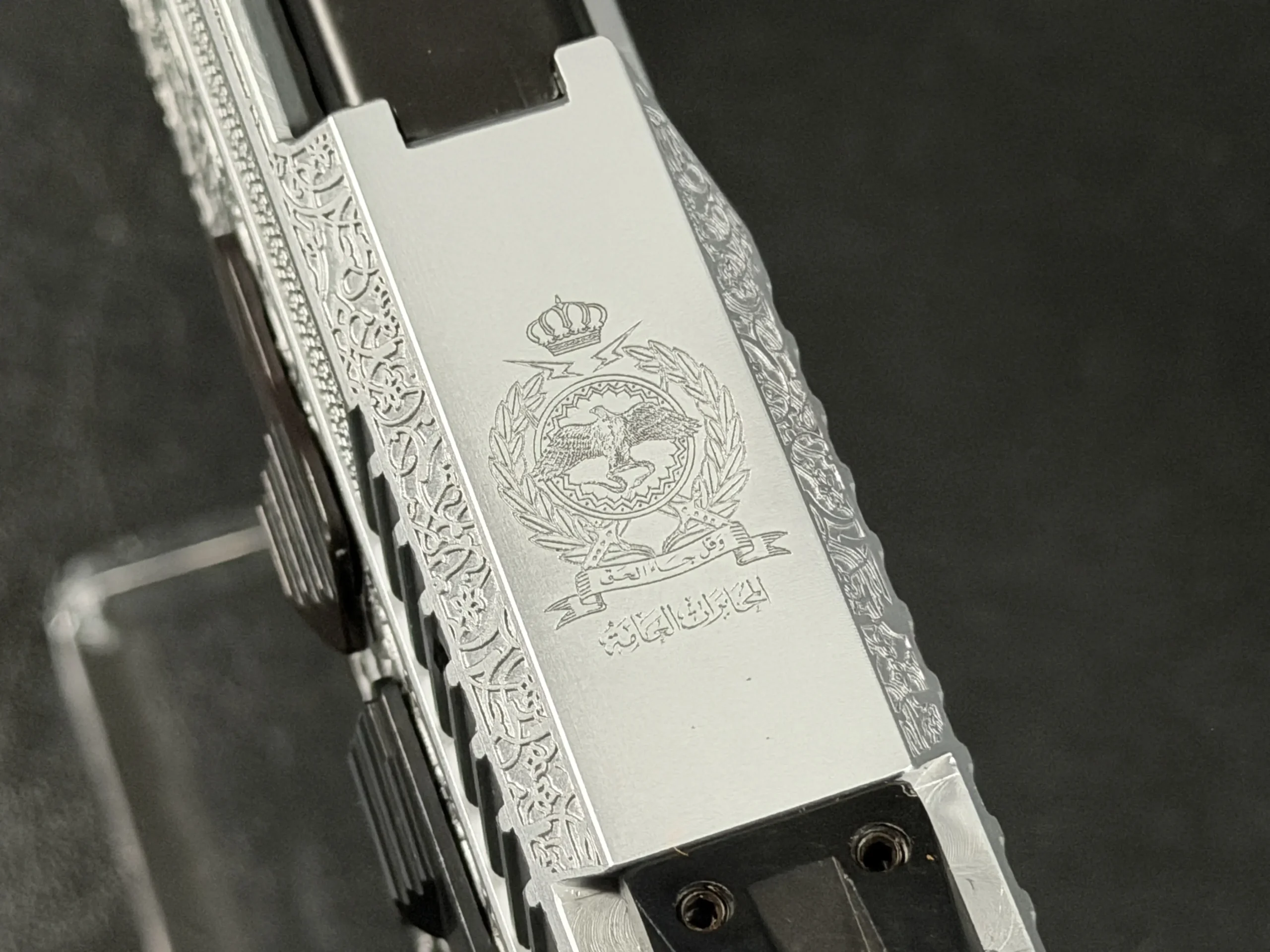 The side surfaces of the slide and frame are richly engraved with flowing Arabic ornamental motifs, executed with precision and restraint rather than excess. The engraving is architectural in nature—balanced, symmetrical, and deliberate, complementing the clean geometry of the SDP platform rather than overwhelming it. Along the top of the slide, the emblem of the Jordanian Intelligence Service is engraved as a clear mark of purpose and provenance.