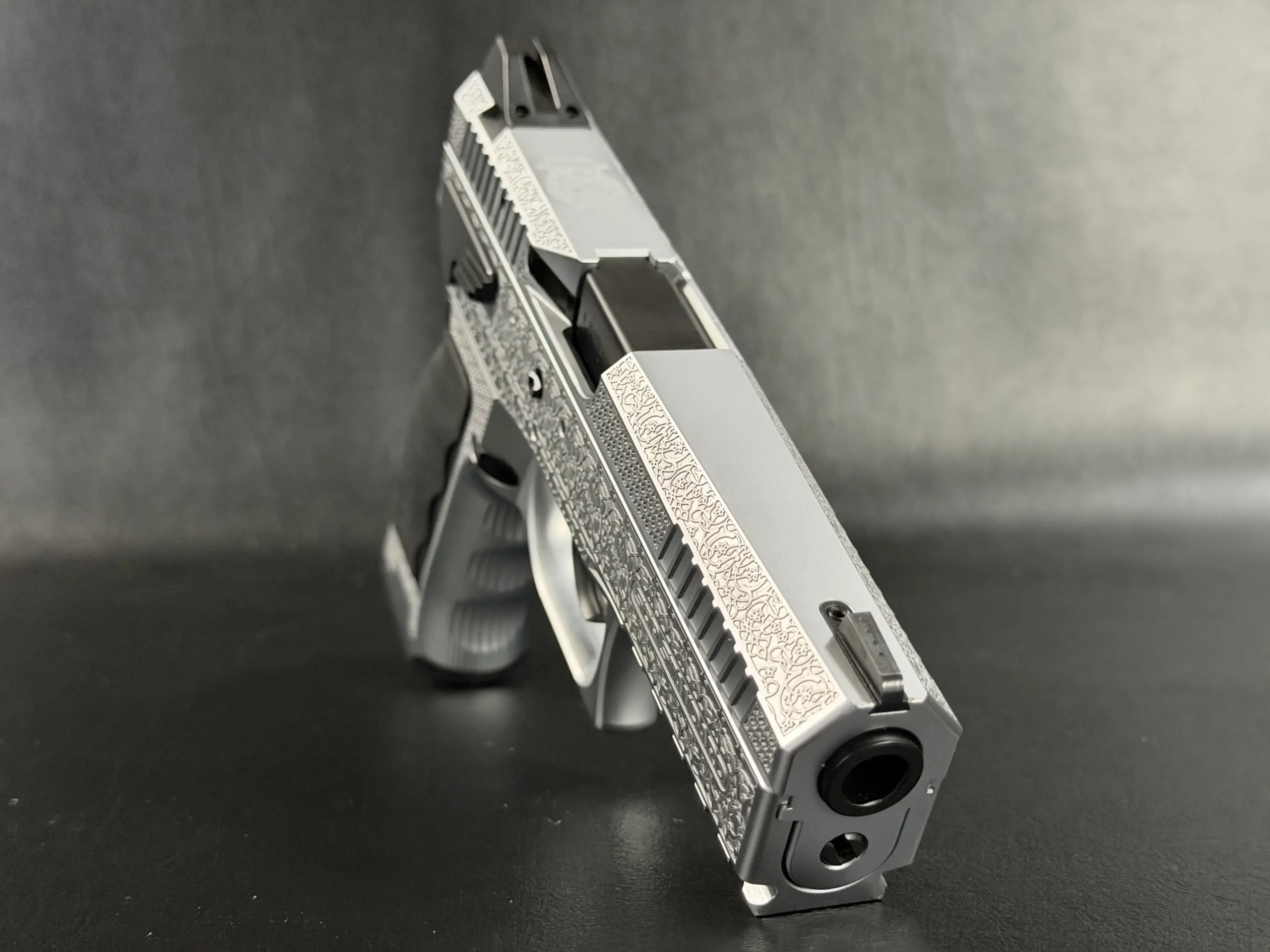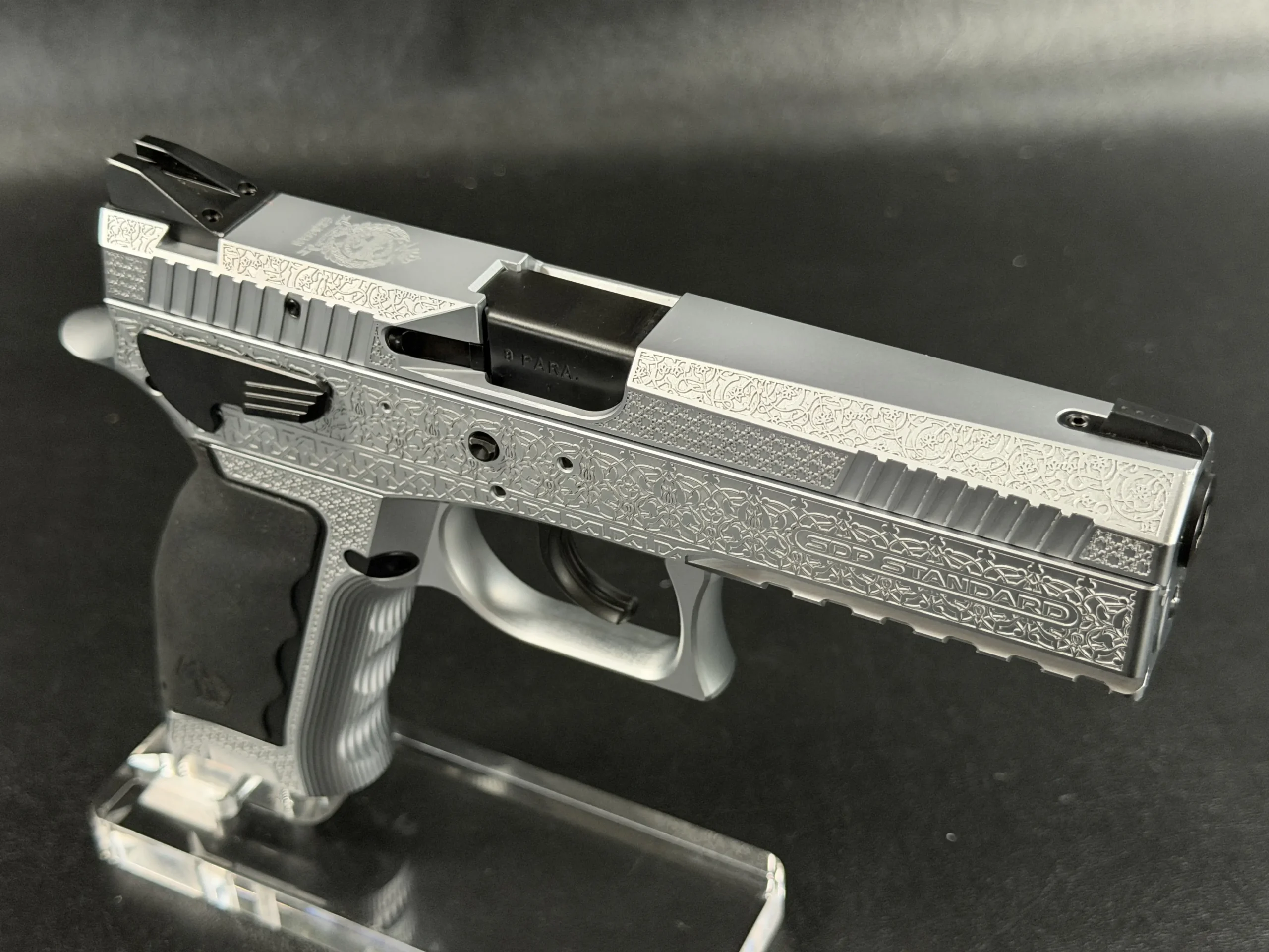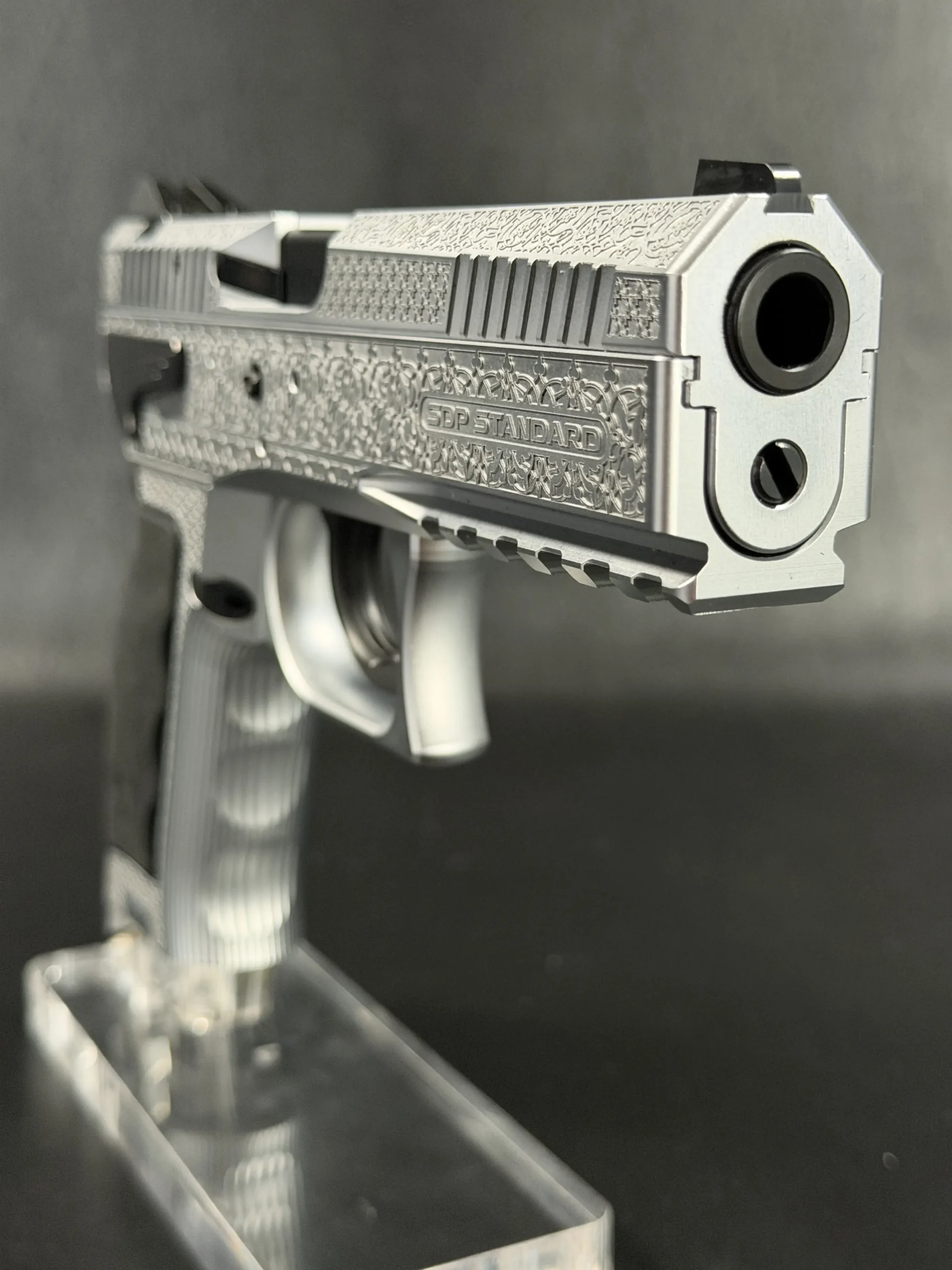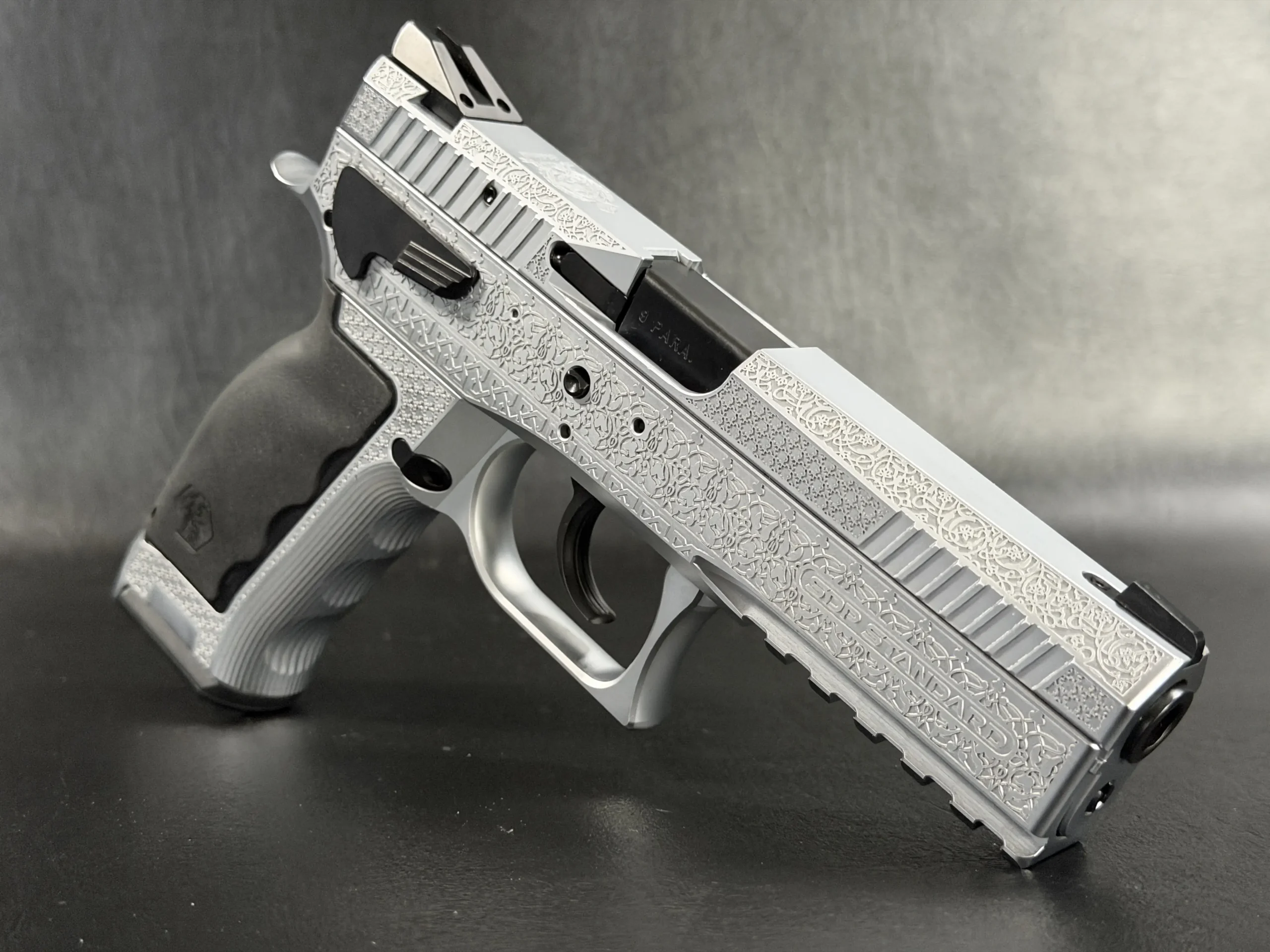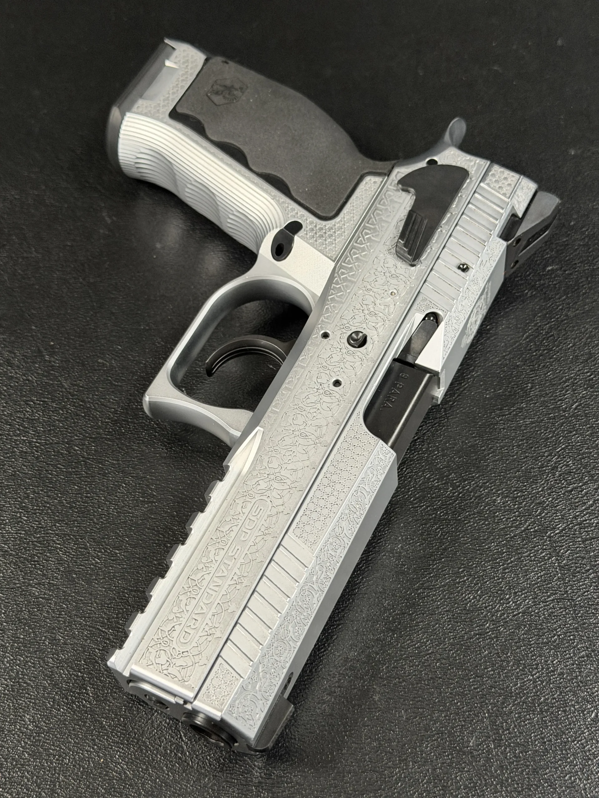 The side surfaces of the slide and frame are richly engraved with flowing Arabic ornamental motifs, executed with precision and restraint rather than excess. The engraving is architectural in nature—balanced, symmetrical, and deliberate, complementing the clean geometry of the SDP platform rather than overwhelming it. Along the top of the slide, the emblem of the Jordanian Intelligence Service is engraved as a clear mark of purpose and provenance.
