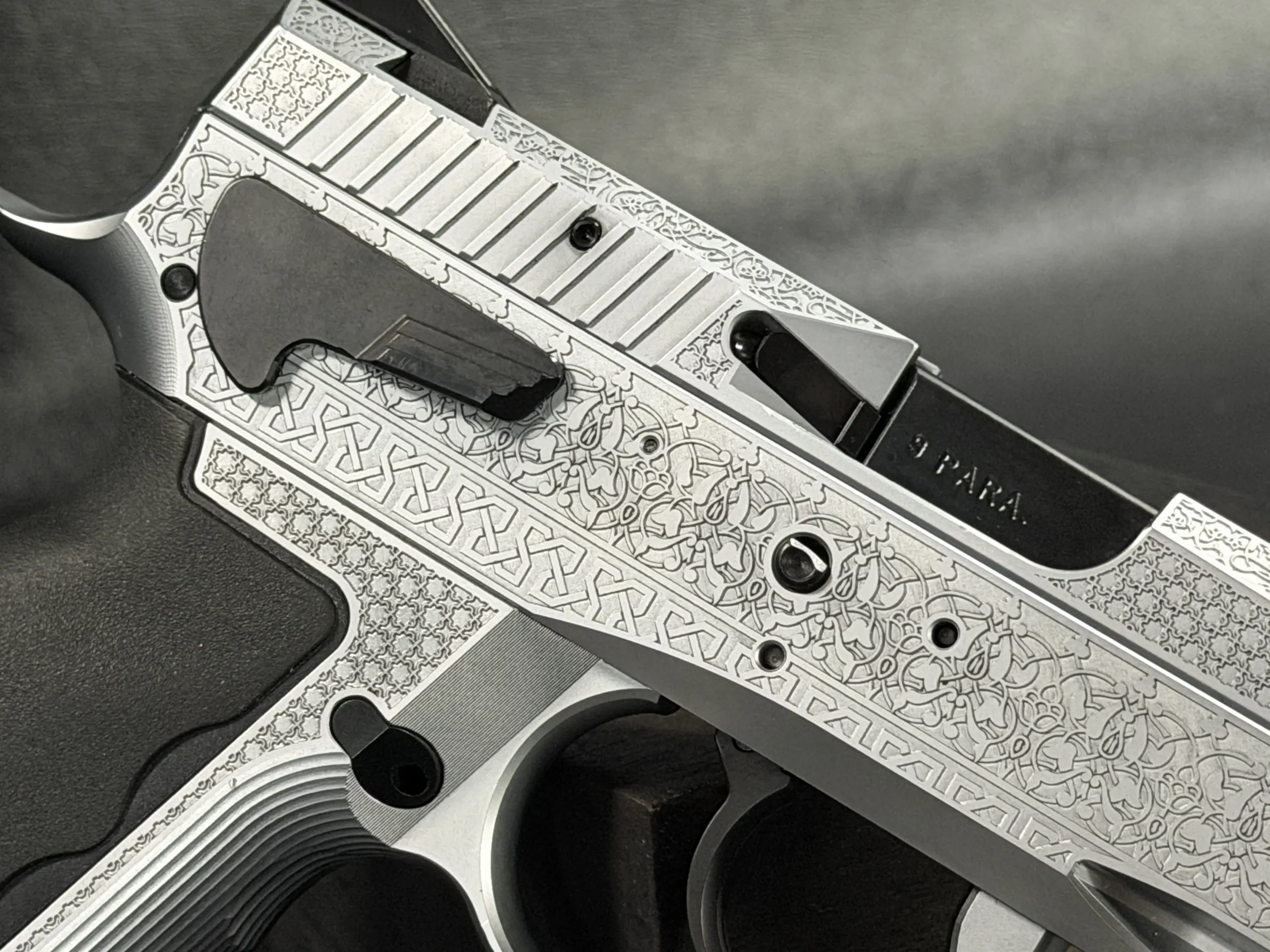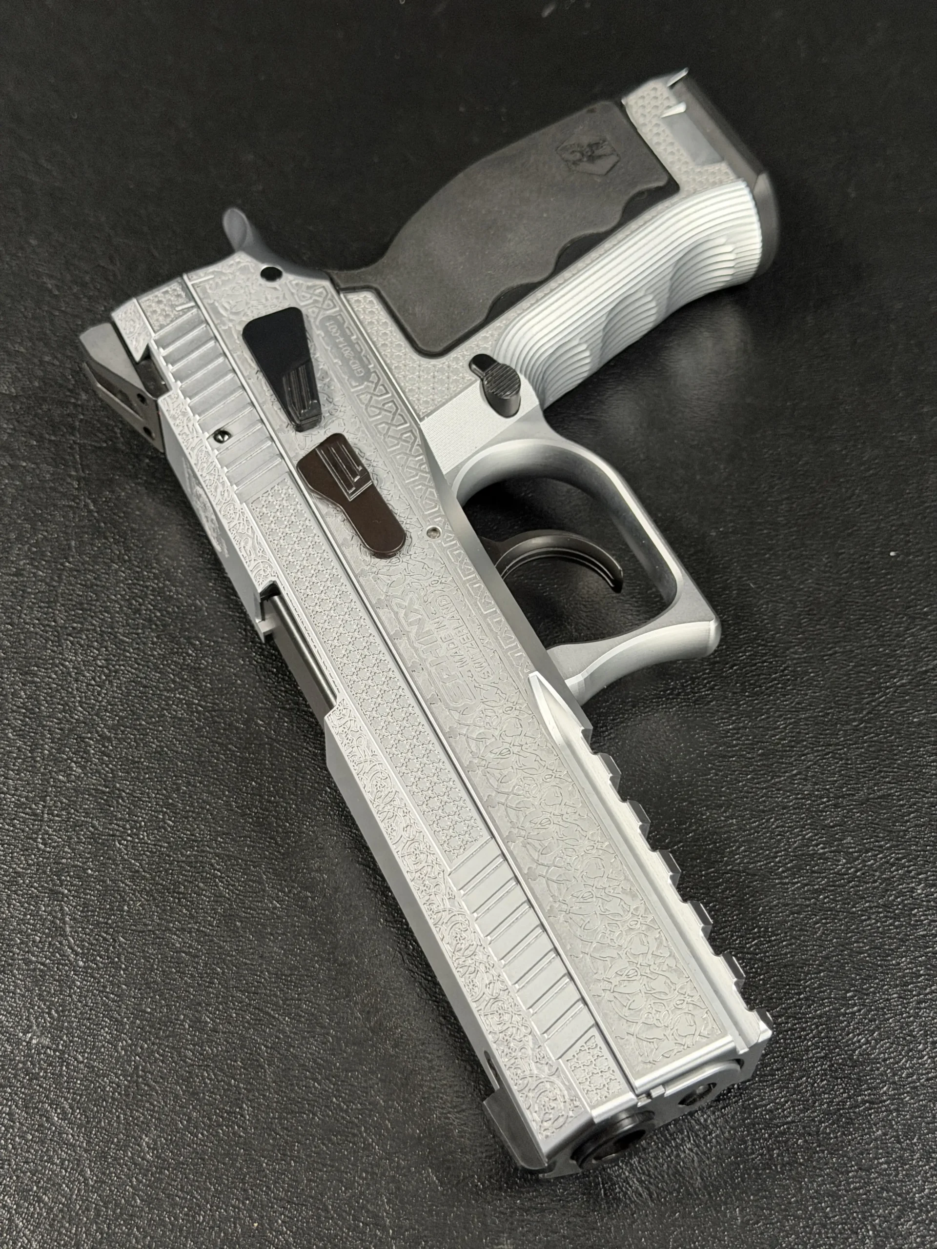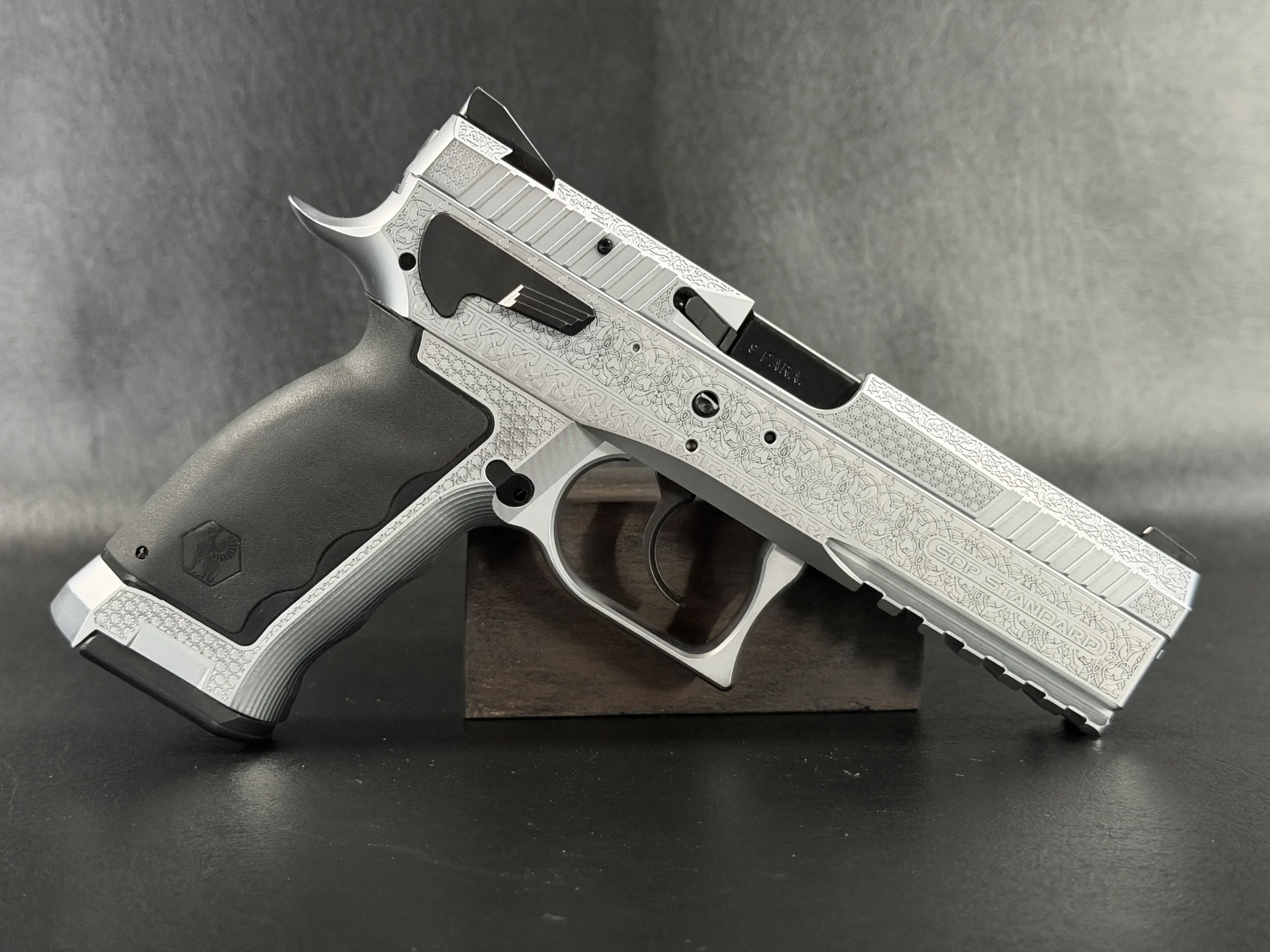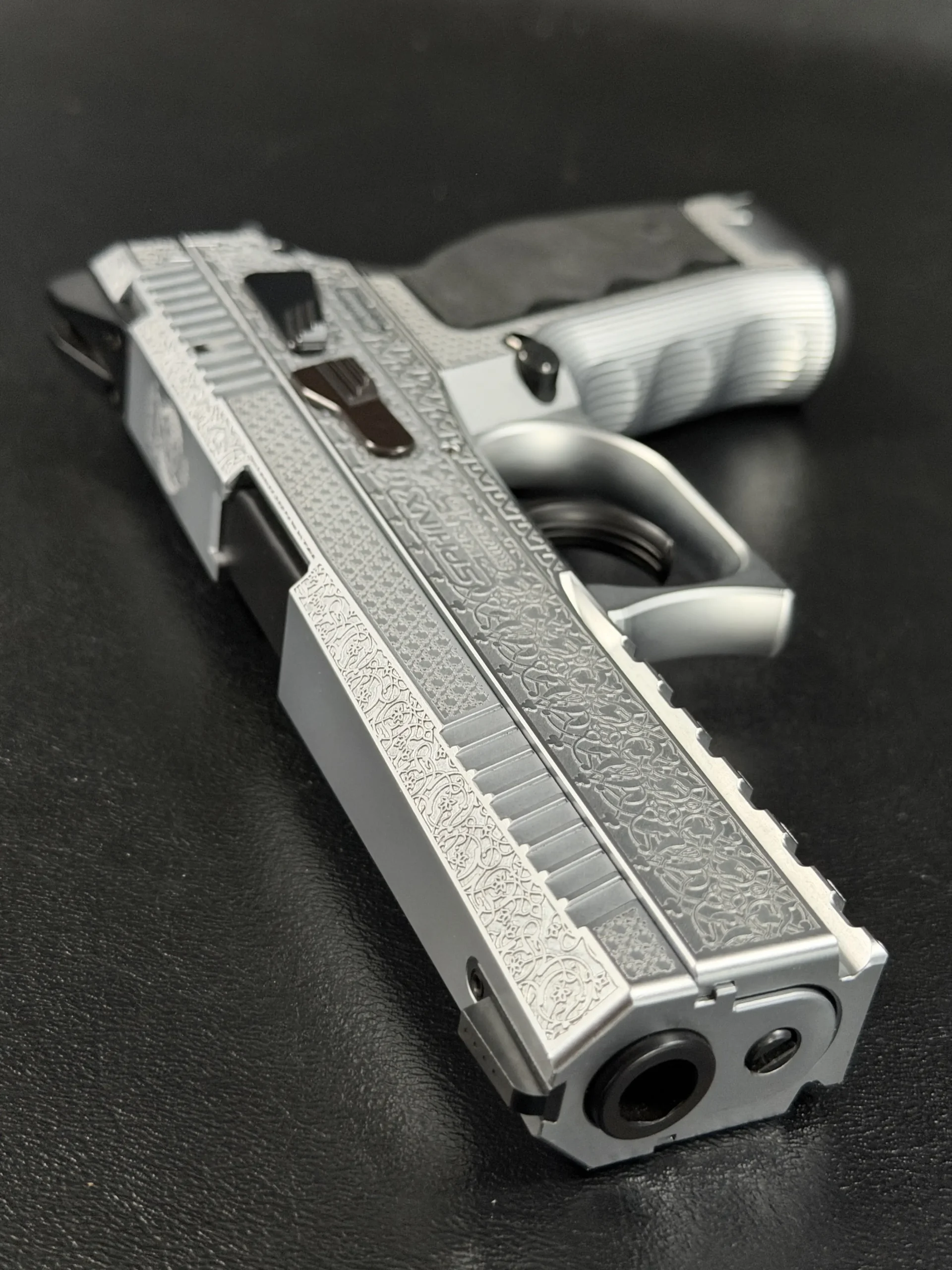 The side surfaces of the slide and frame are richly engraved with flowing Arabic ornamental motifs, executed with precision and restraint rather than excess. The engraving is architectural in nature—balanced, symmetrical, and deliberate, complementing the clean geometry of the SDP platform rather than overwhelming it. Along the top of the slide, the emblem of the Jordanian Intelligence Service is engraved as a clear mark of purpose and provenance.