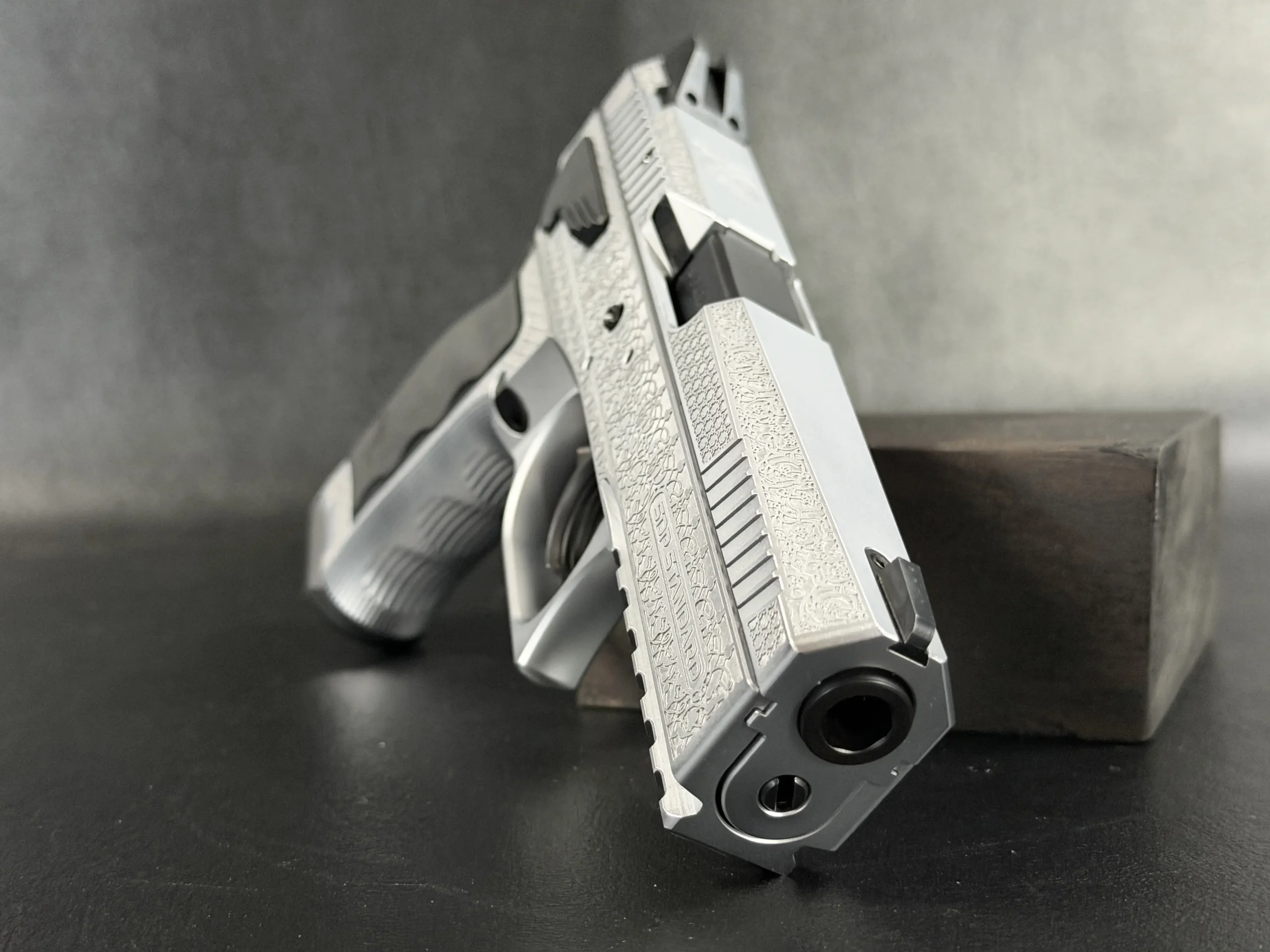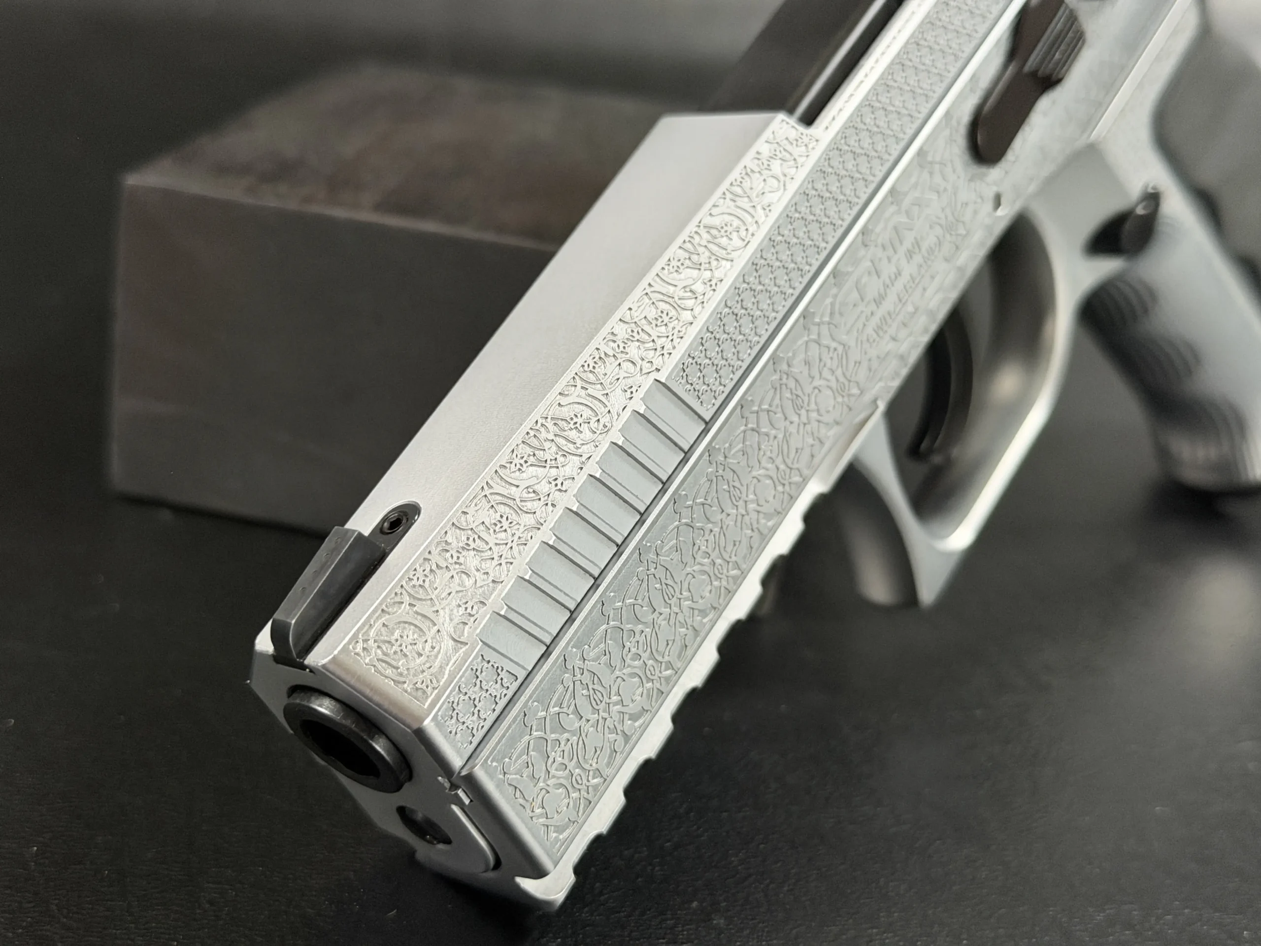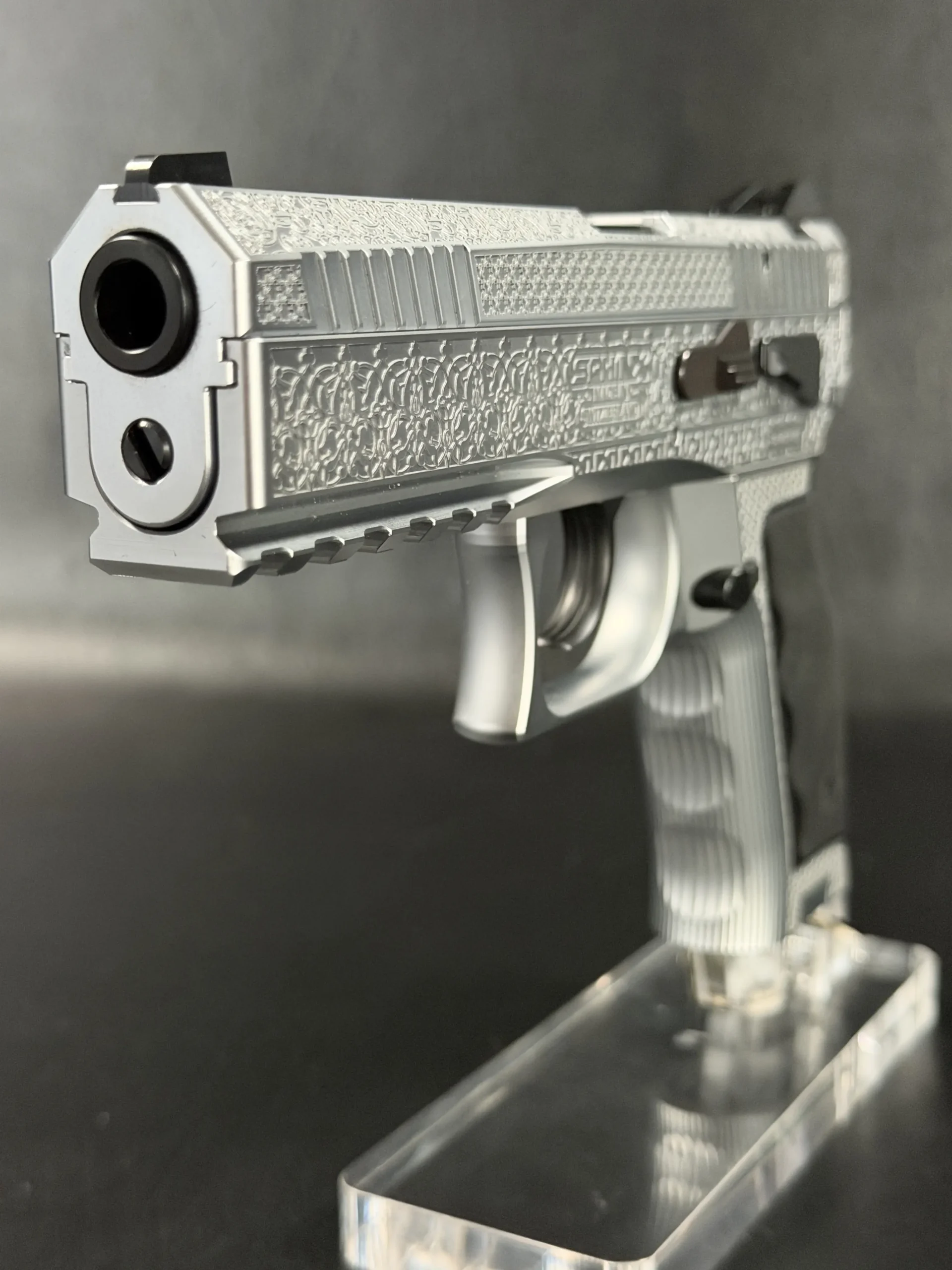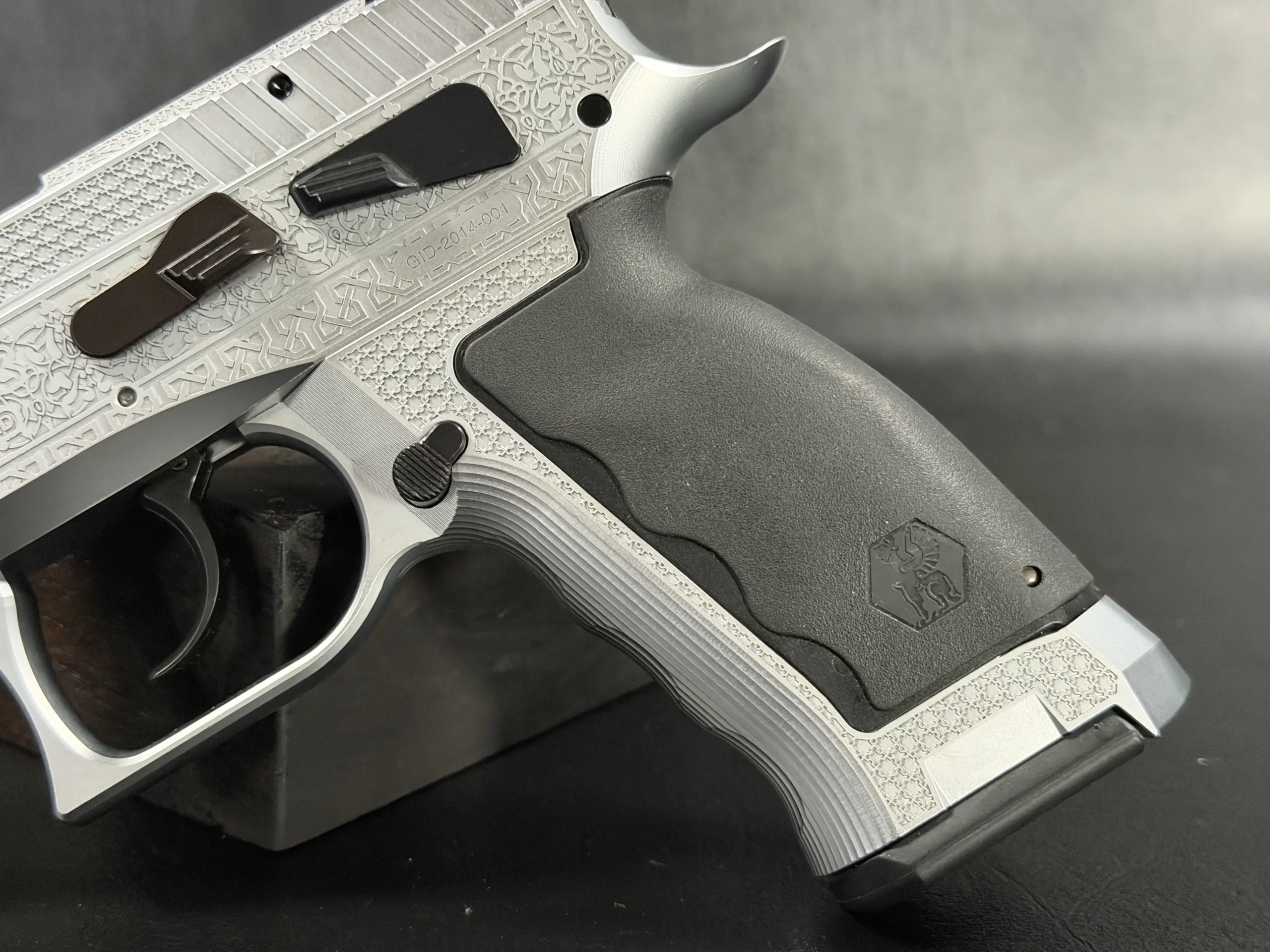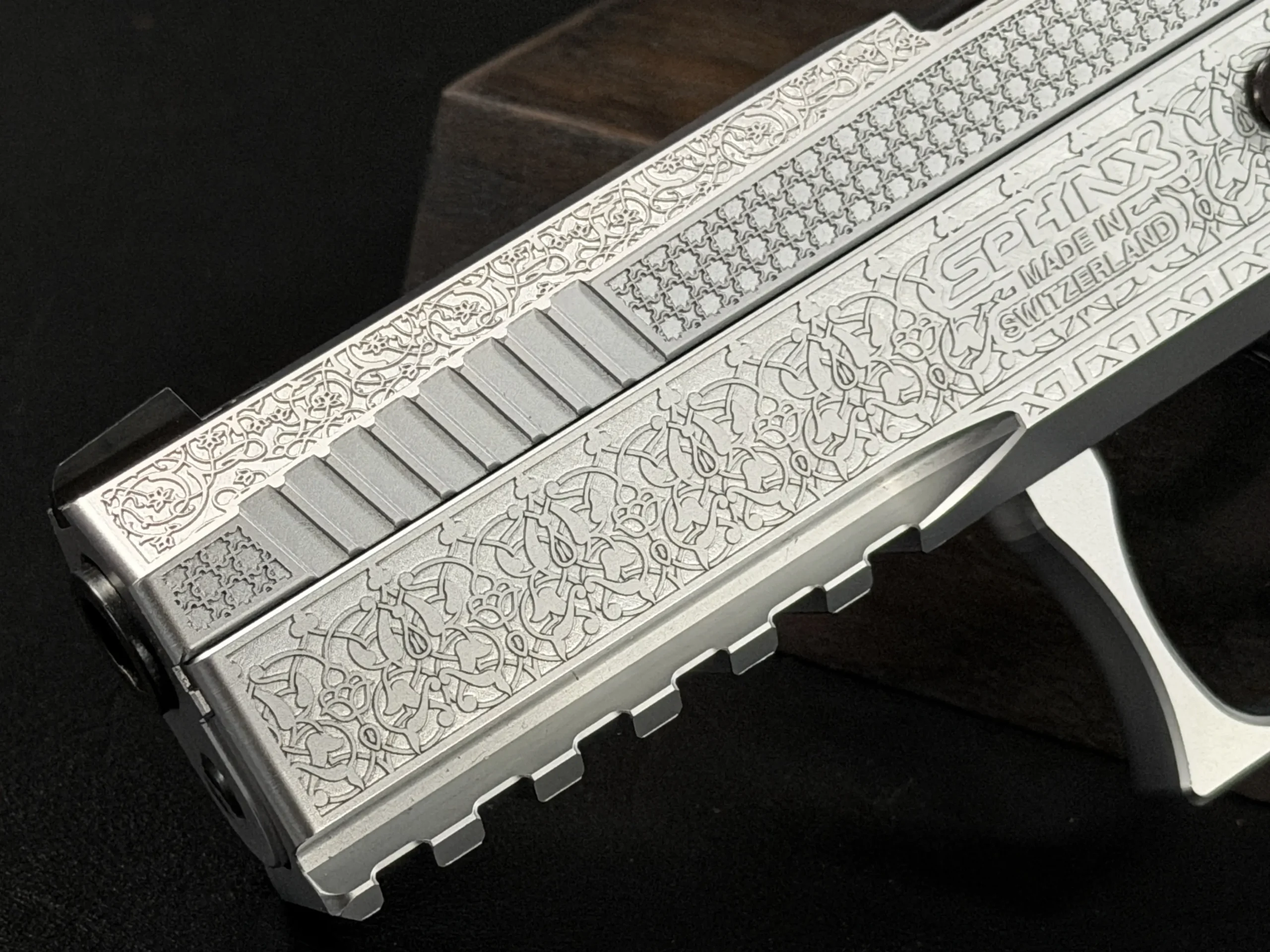 The side surfaces of the slide and frame are richly engraved with flowing Arabic ornamental motifs, executed with precision and restraint rather than excess. The engraving is architectural in nature—balanced, symmetrical, and deliberate, complementing the clean geometry of the SDP platform rather than overwhelming it. Along the top of the slide, the emblem of the Jordanian Intelligence Service is engraved as a clear mark of purpose and provenance.