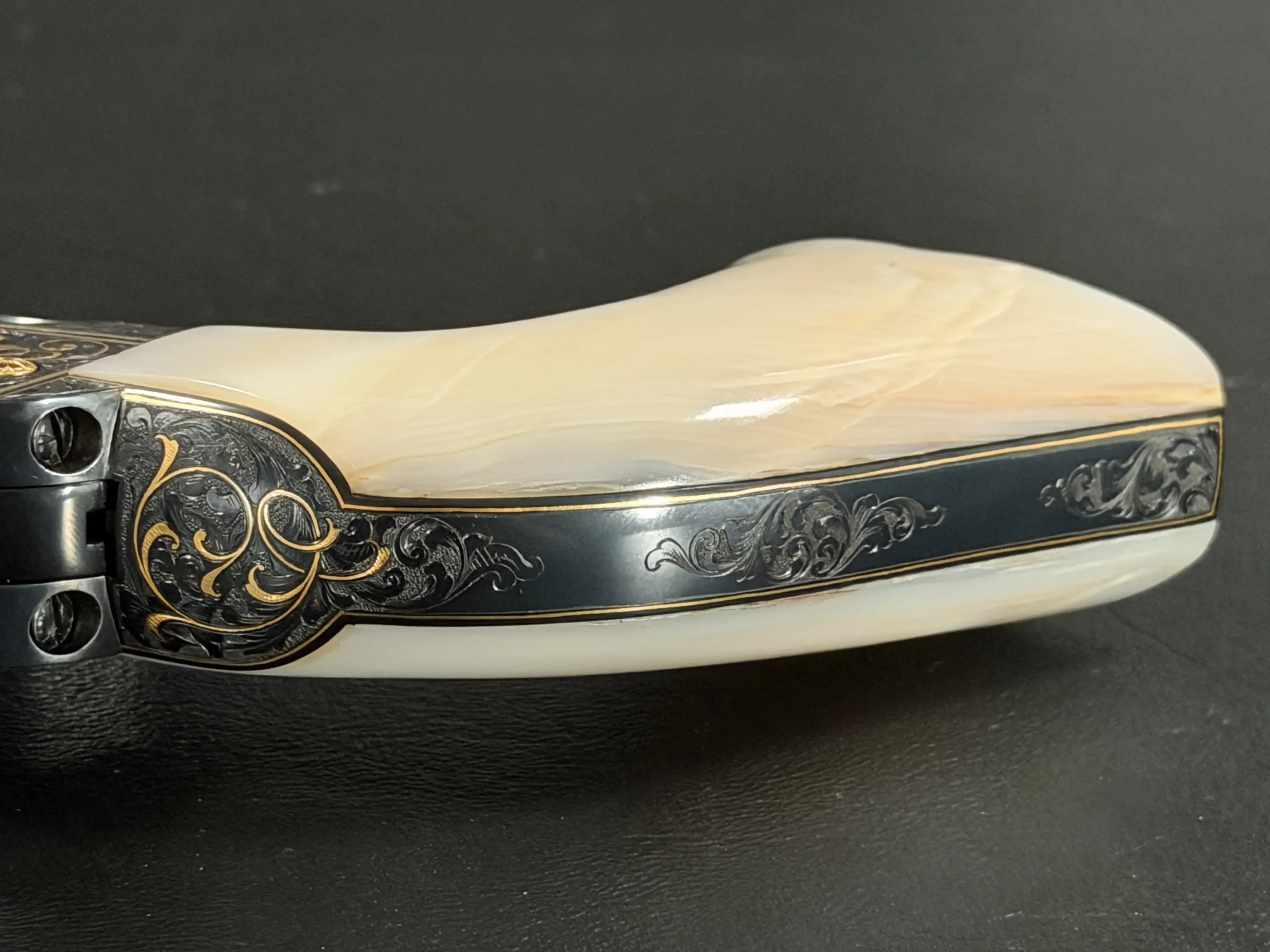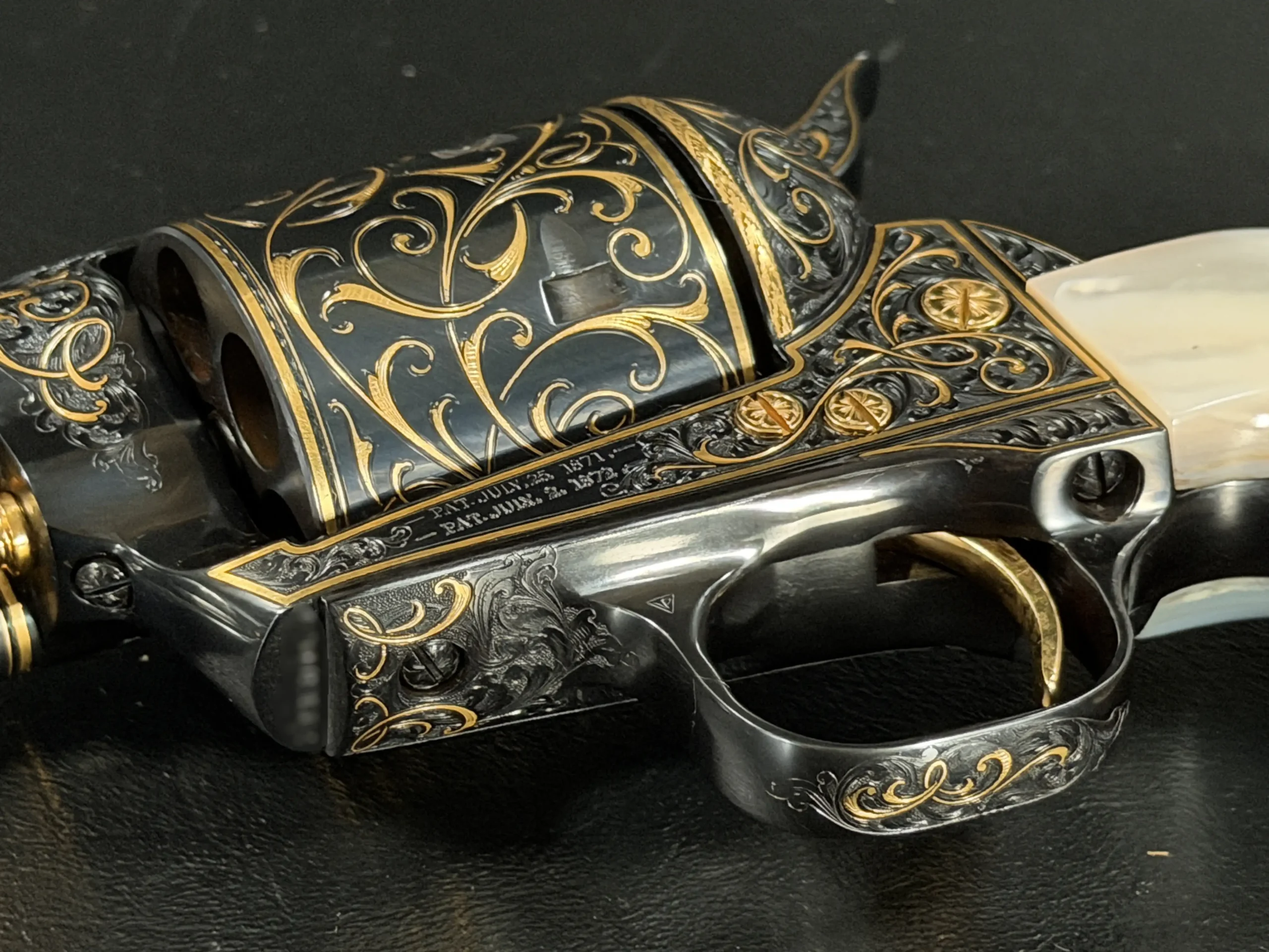 George Spring’s association with Colt spanned decades, and his work represents one of the last great eras of traditional American factory engraving. His scroll is unmistakable: confident, balanced, and deeply cut, with gold laid in so cleanly it appears to have been poured into the steel.