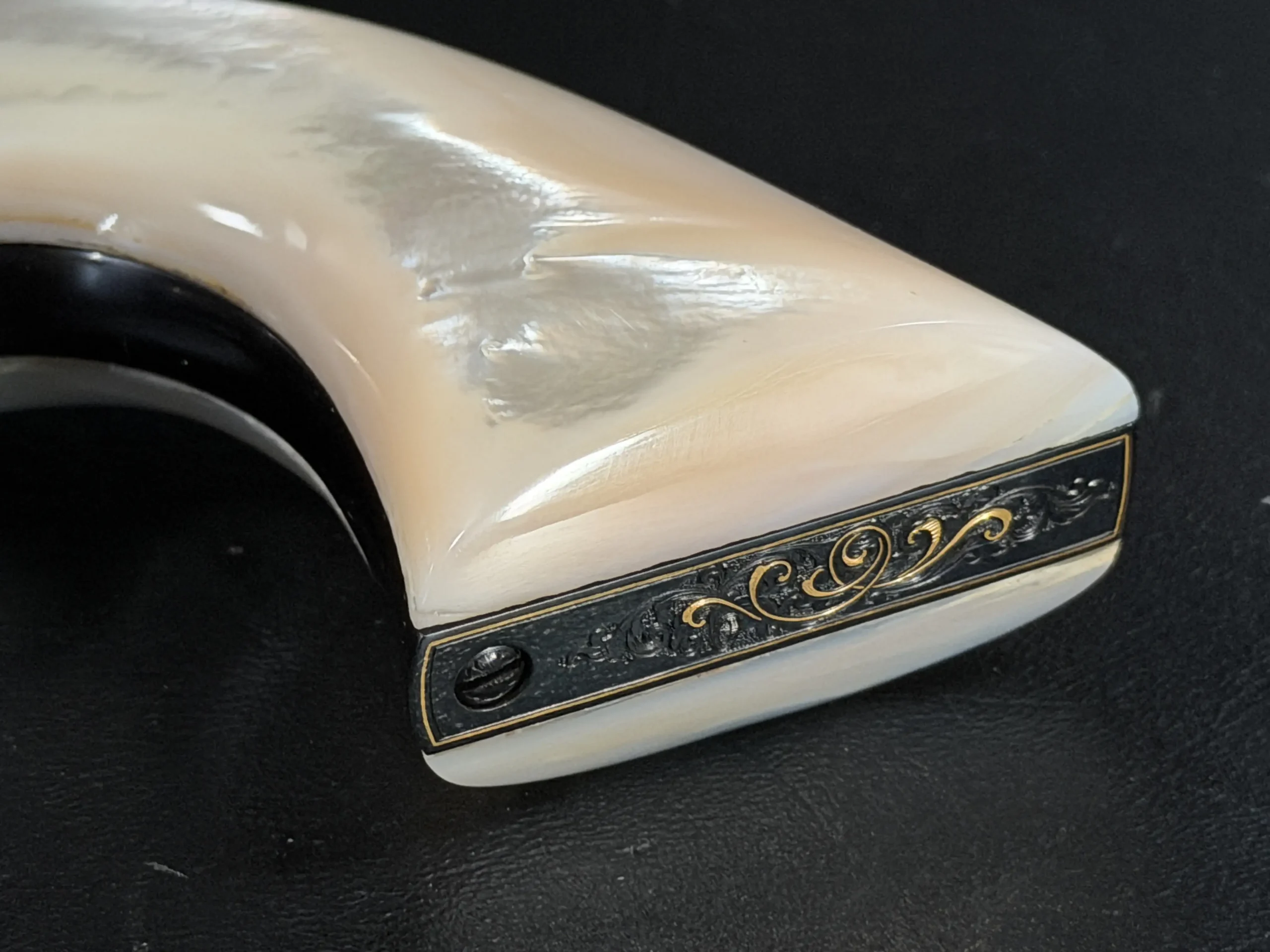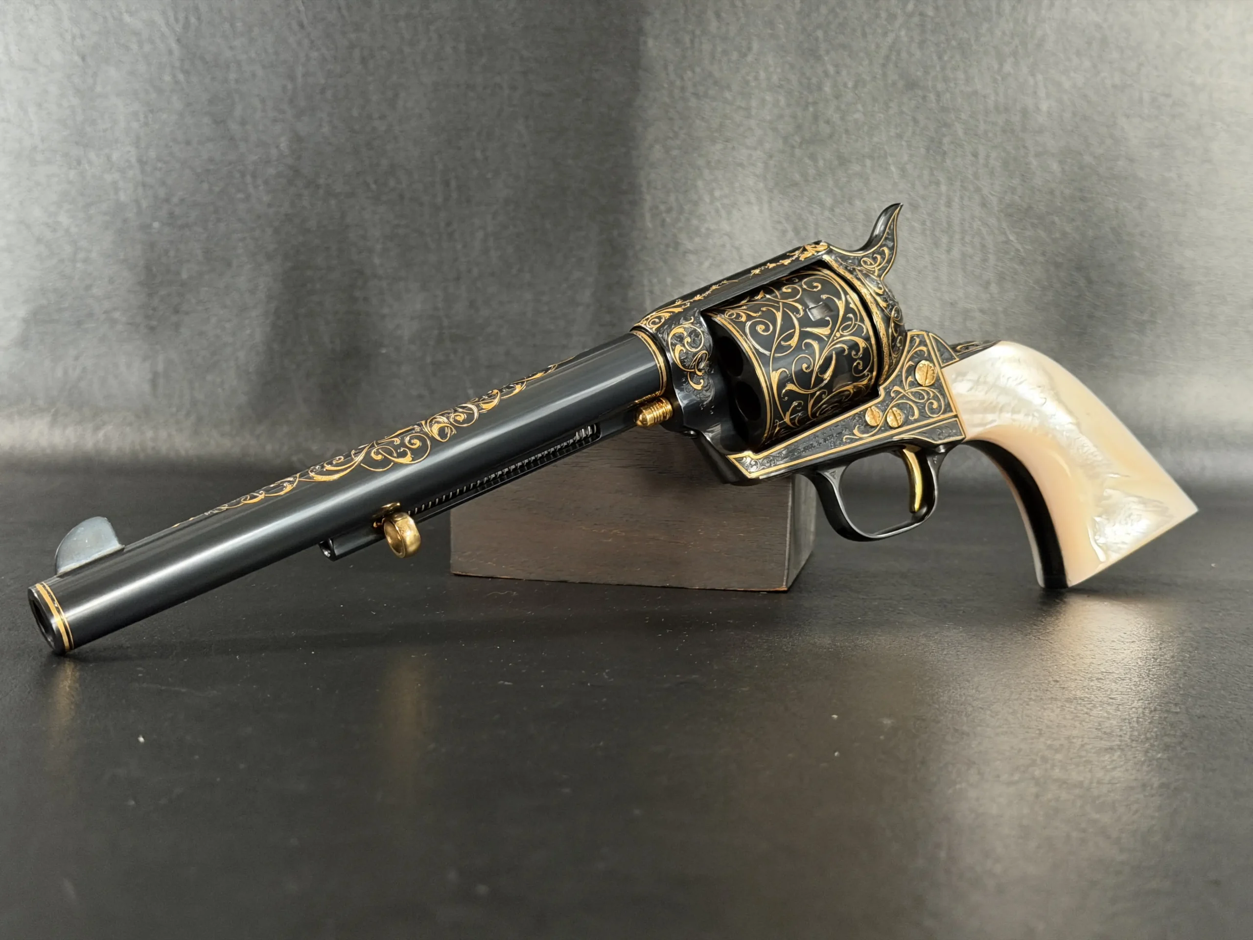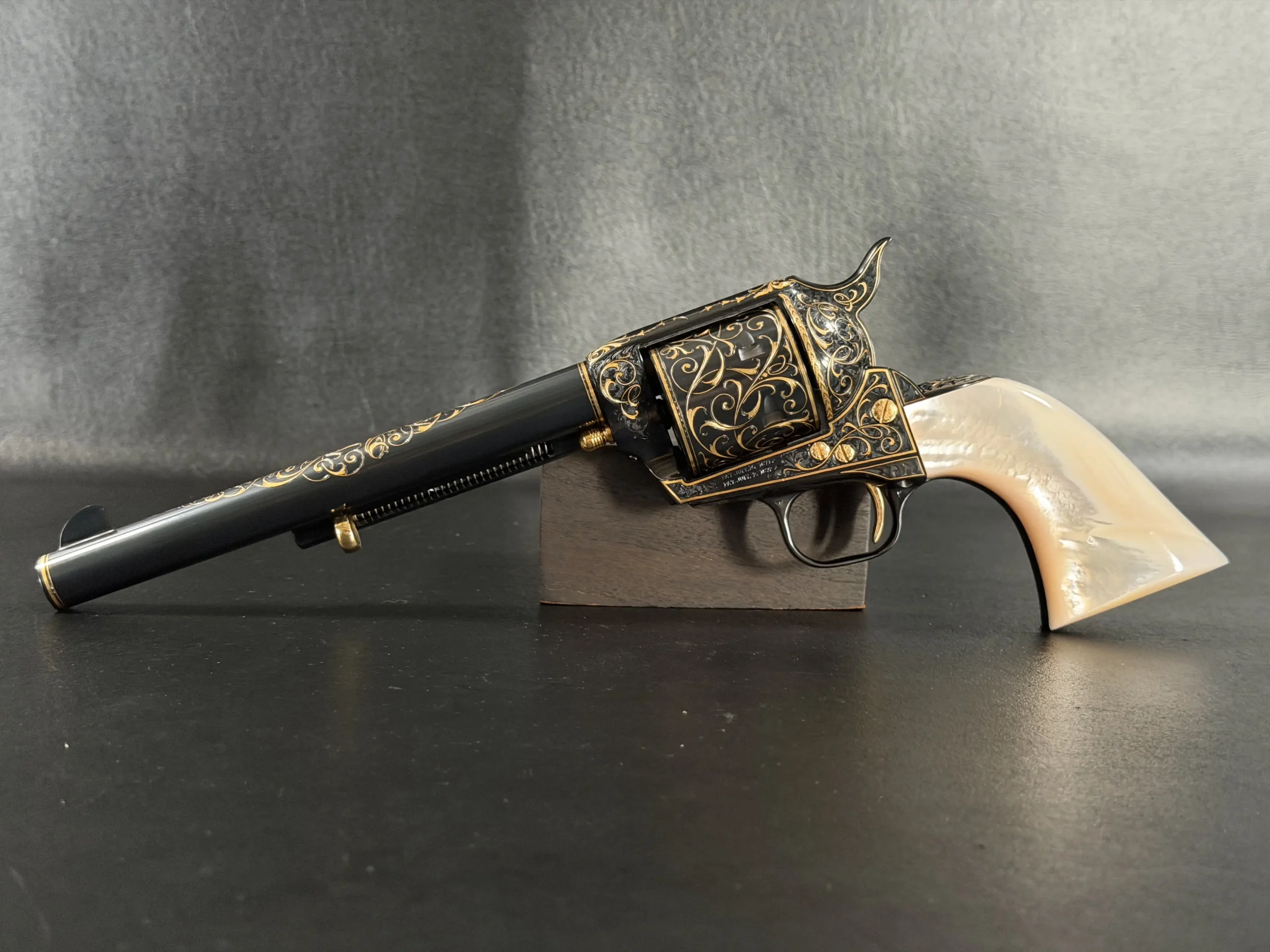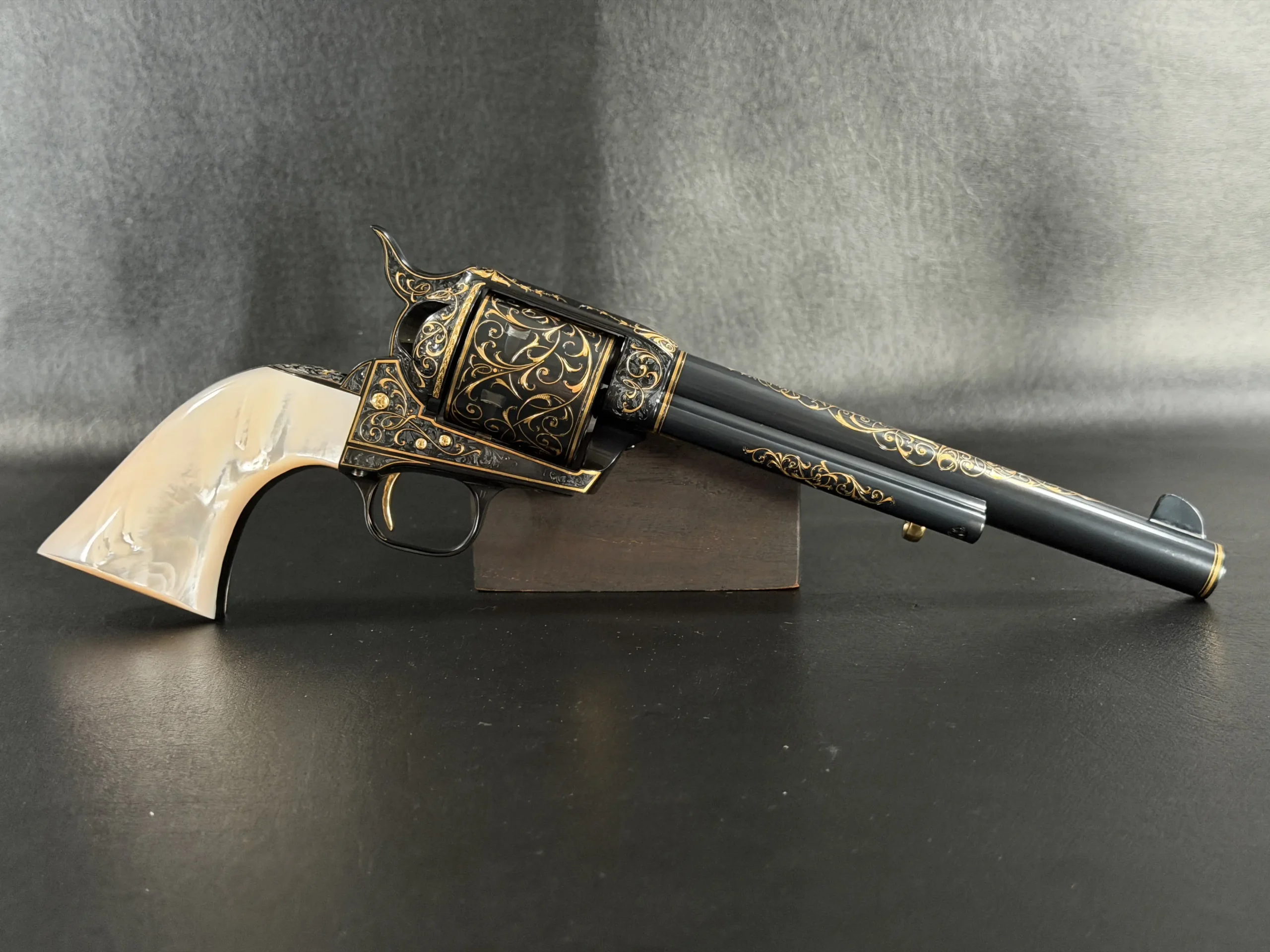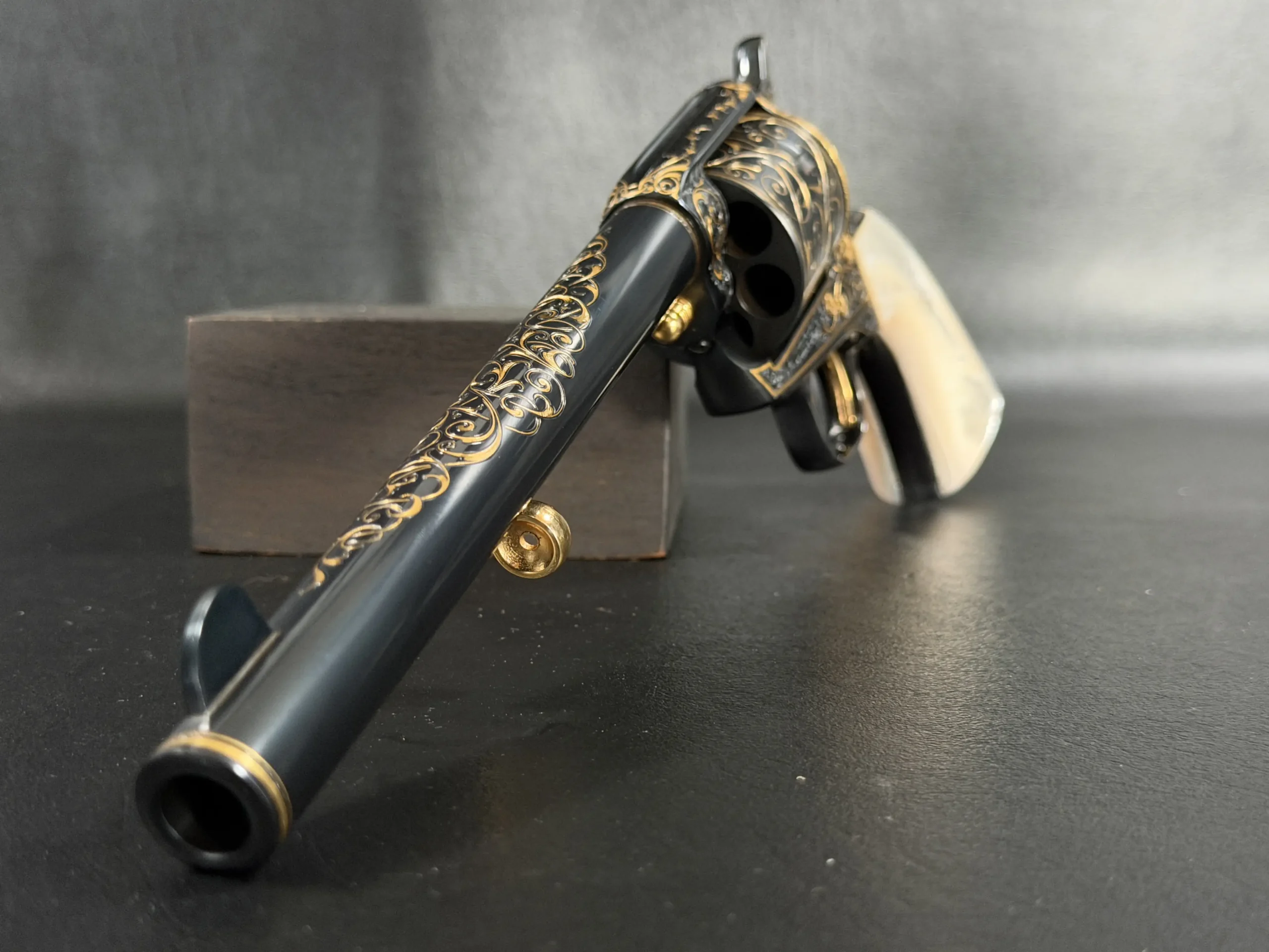 The revolver is fitted with a one-piece smooth Mother-of-Pearl grip, which perfectly complements the gold inlay and lends a refined elegance to the traditional SAA silhouette. Gold-finished screws and accents complete the presentation, reinforcing the cohesive artistic vision throughout.