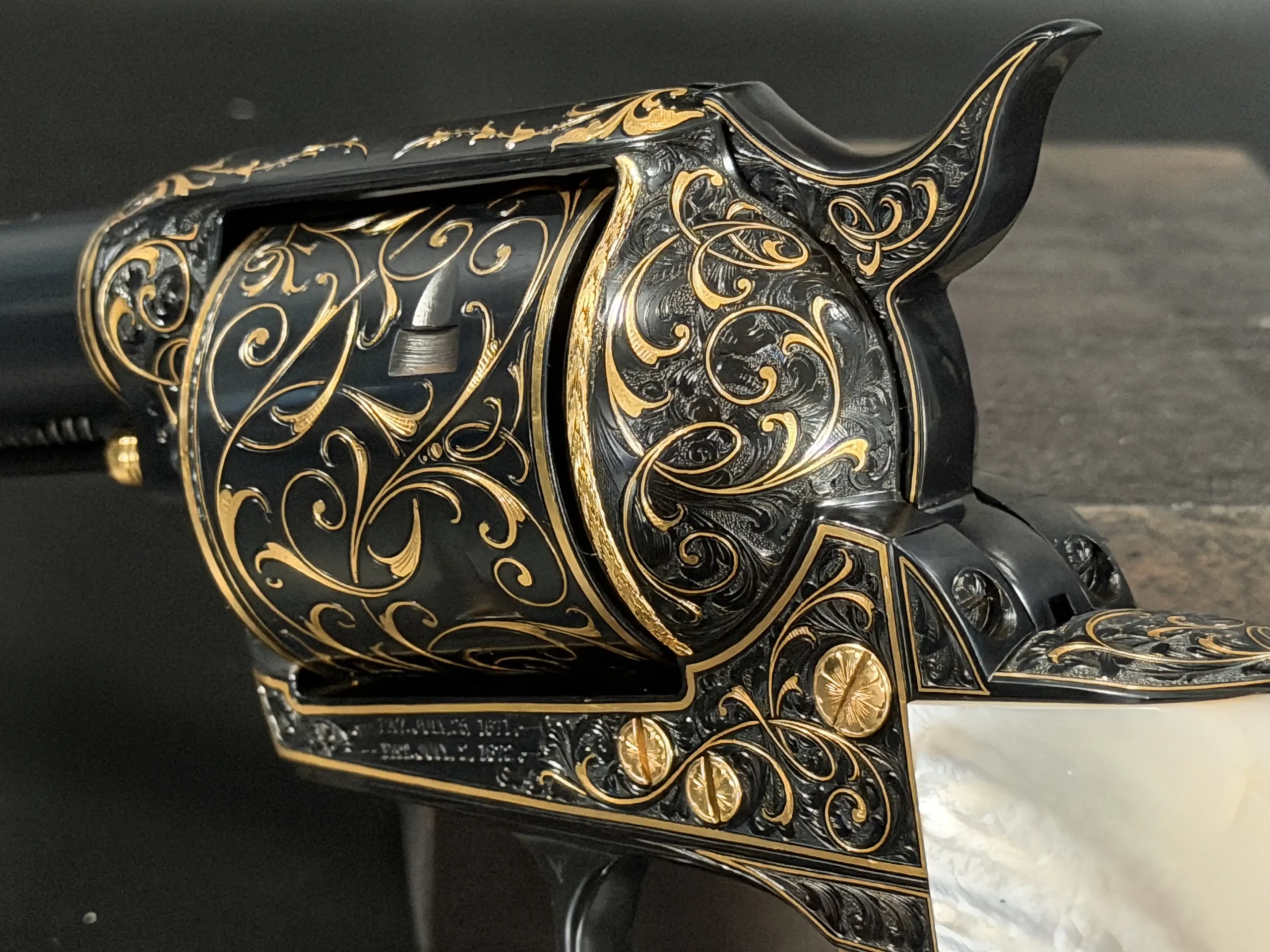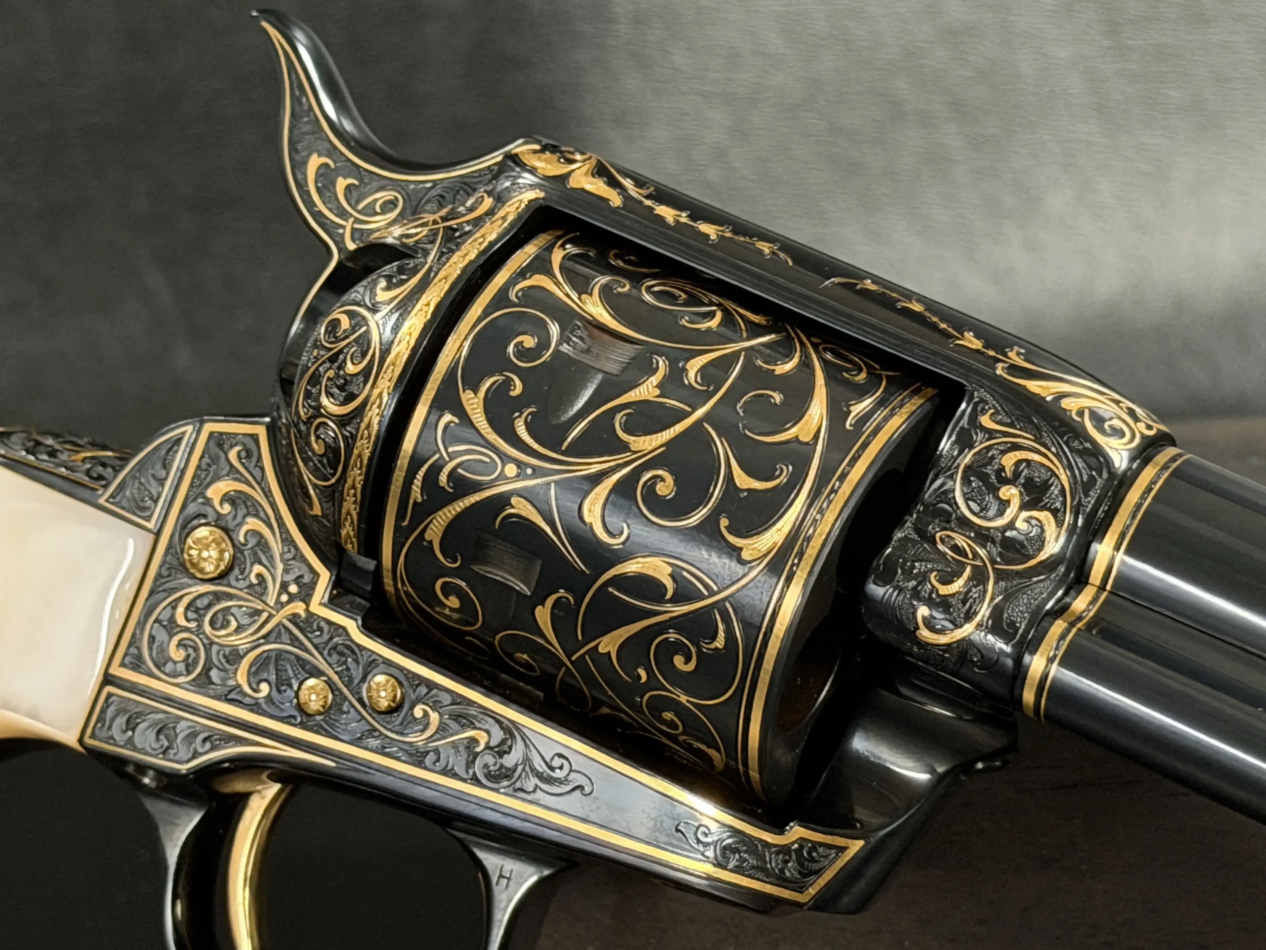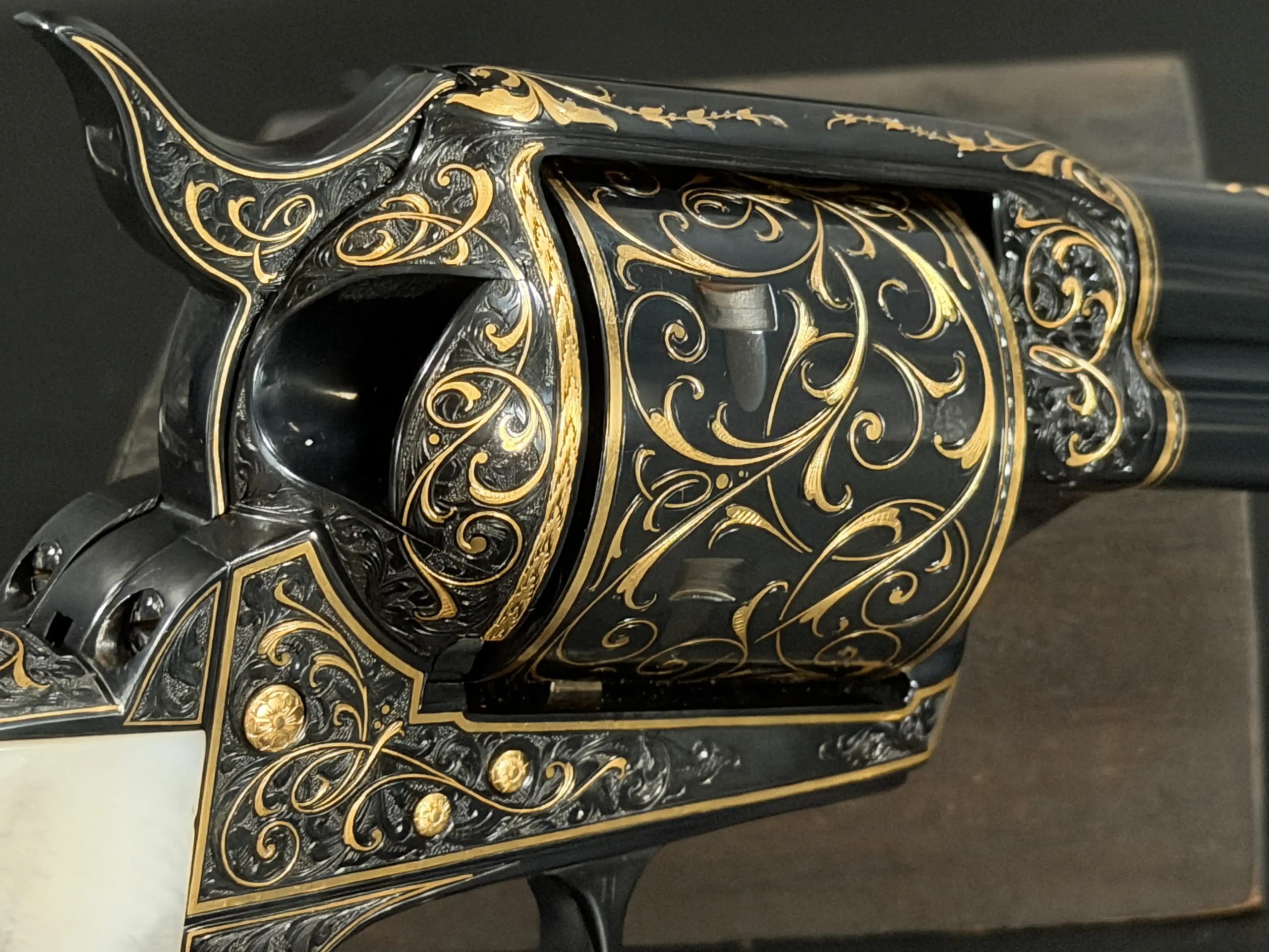 The result is a revolver that feels alive in the hand, light catching the raised gold, shadows settling into the deep scroll cuts, every angle revealing new layers of detail.