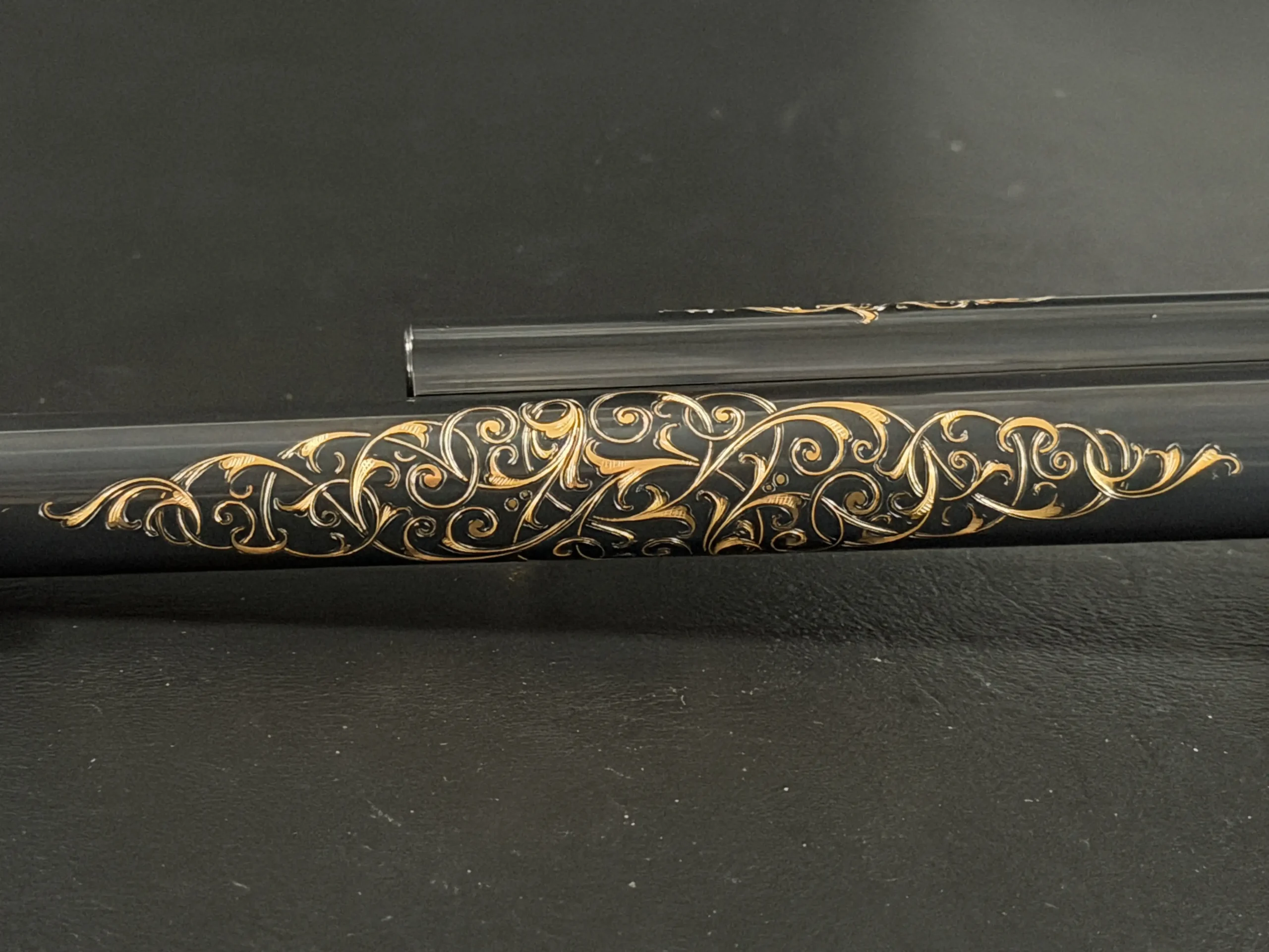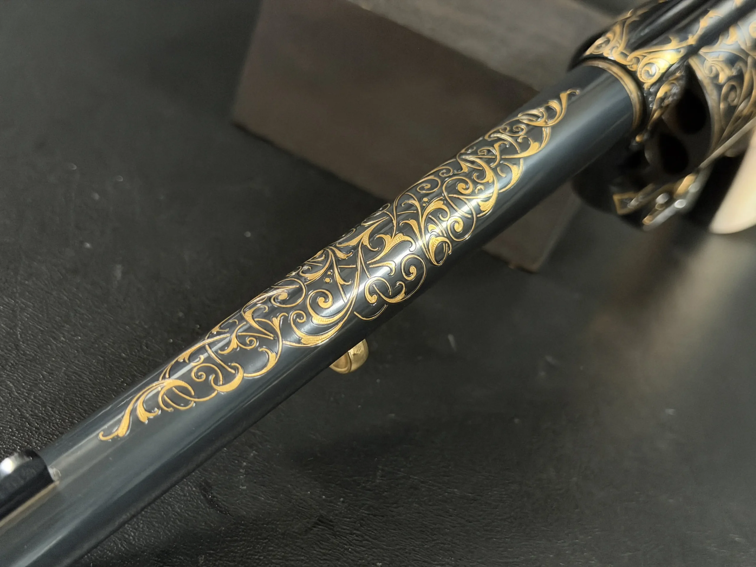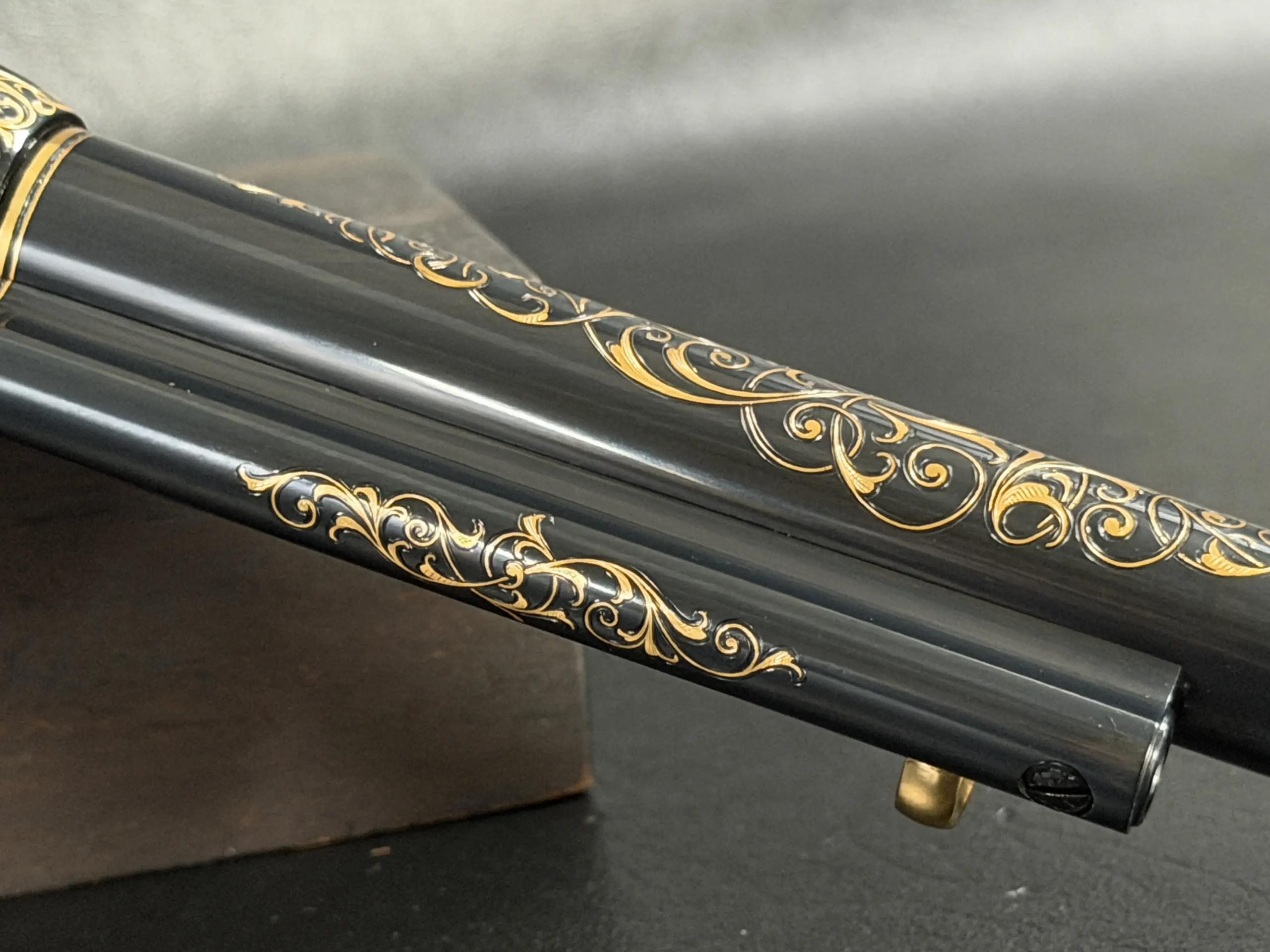 The result is a revolver that feels alive in the hand, light catching the raised gold, shadows settling into the deep scroll cuts, every angle revealing new layers of detail.