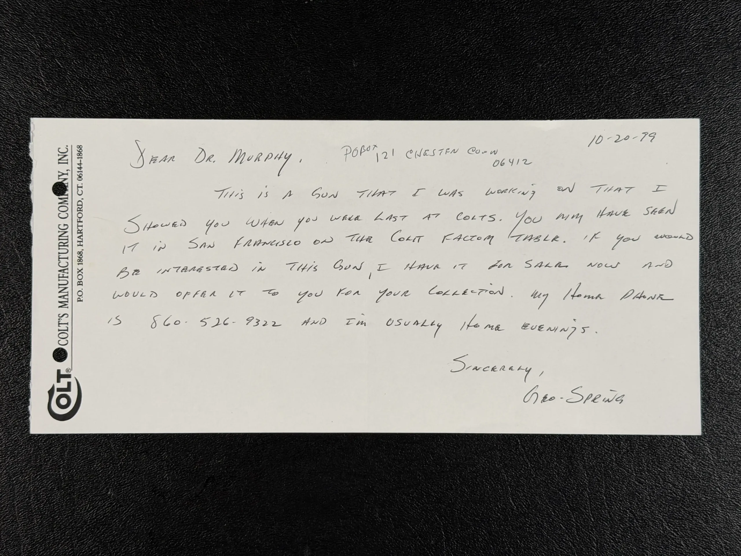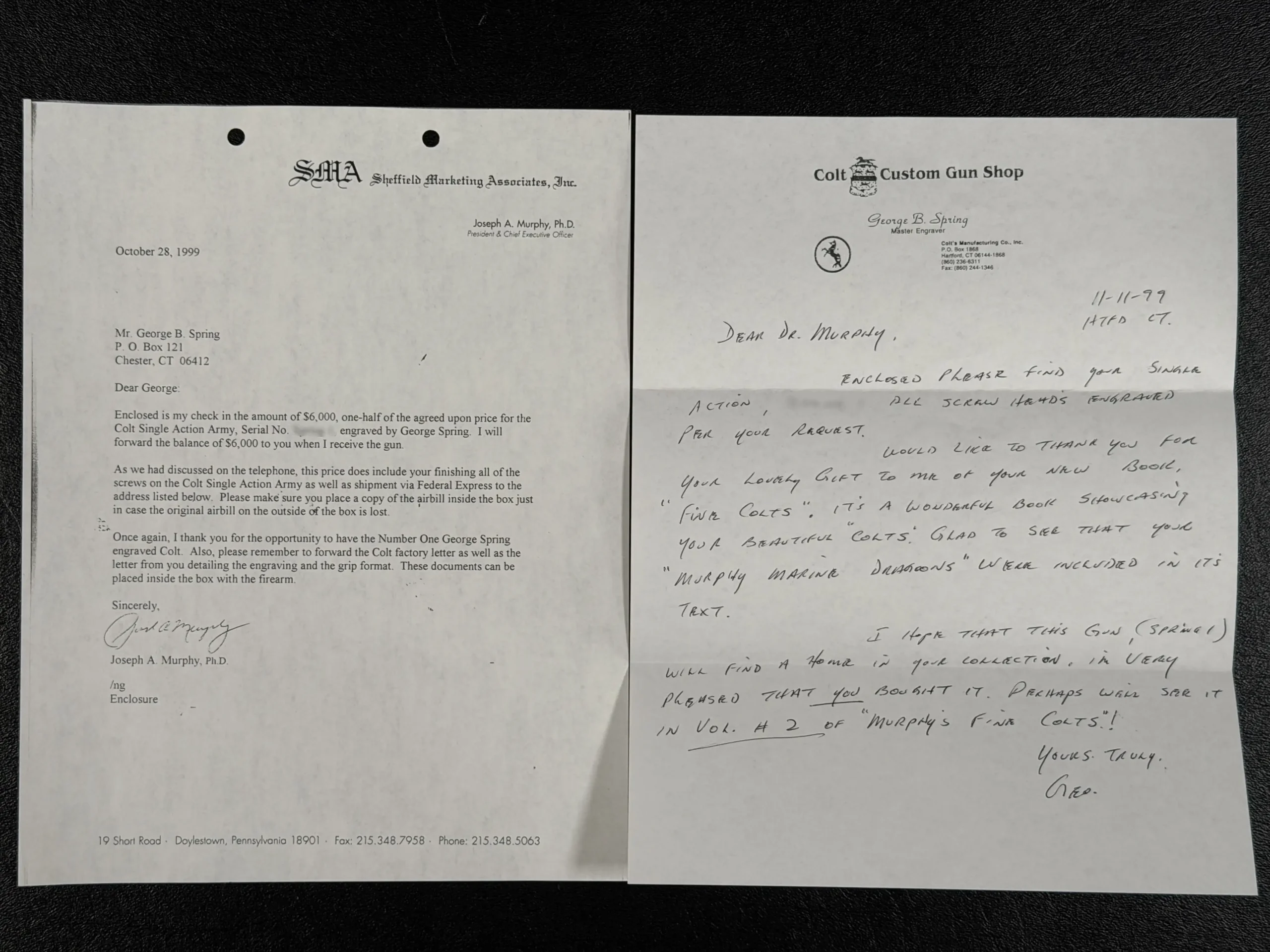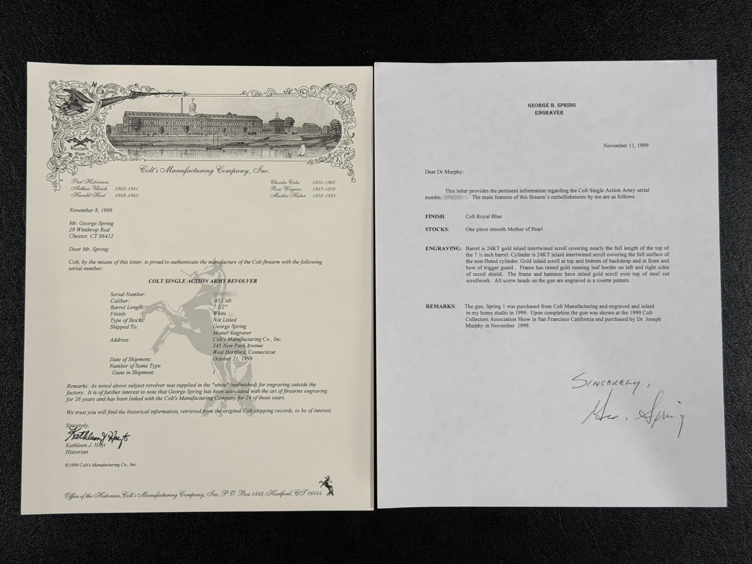According to the included letters, the revolver was engraved in Spring’s studio and later shown publicly before entering a distinguished collection. This level of documented provenance significantly elevates the revolver beyond decorative artistry; it becomes a traceable piece of Colt Custom Shop history.
