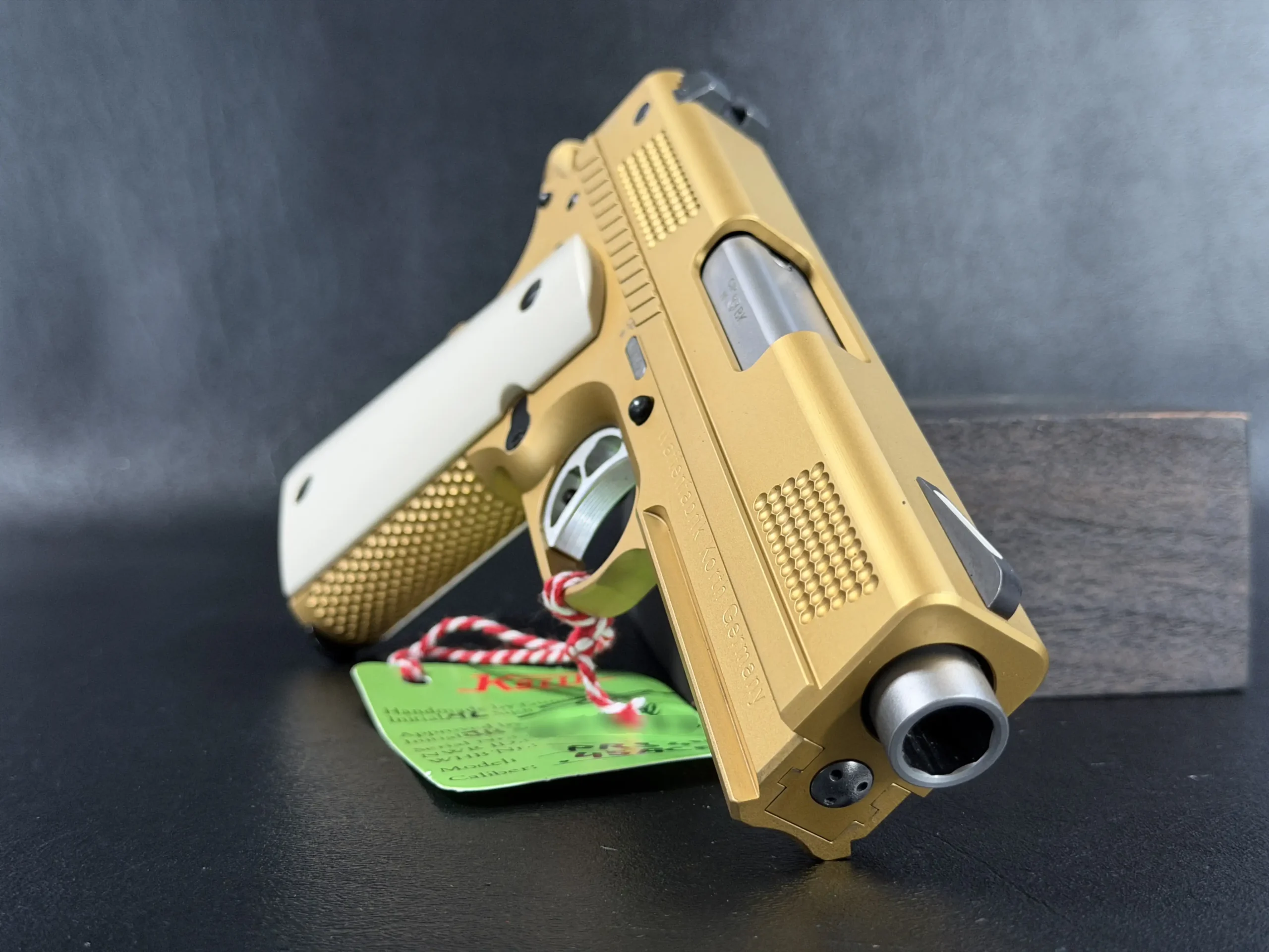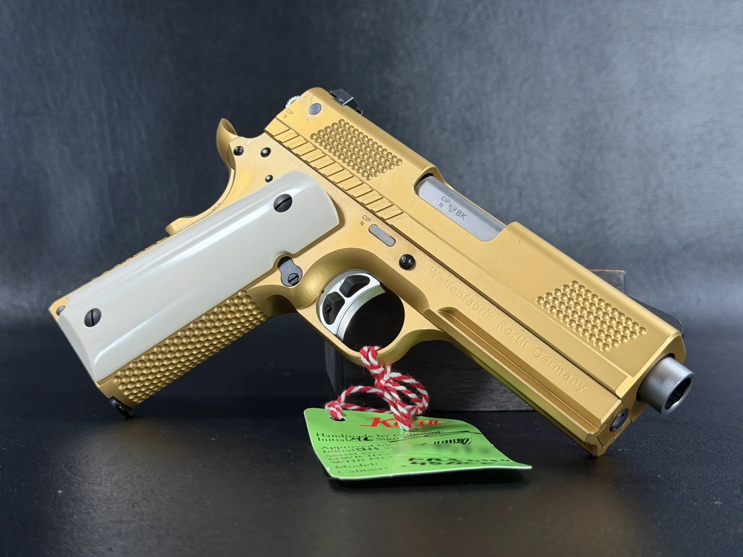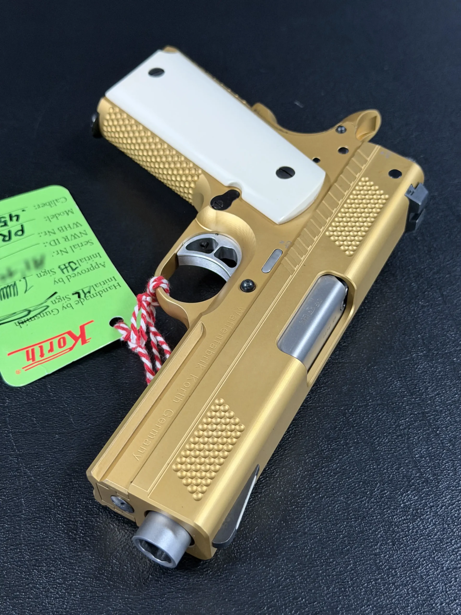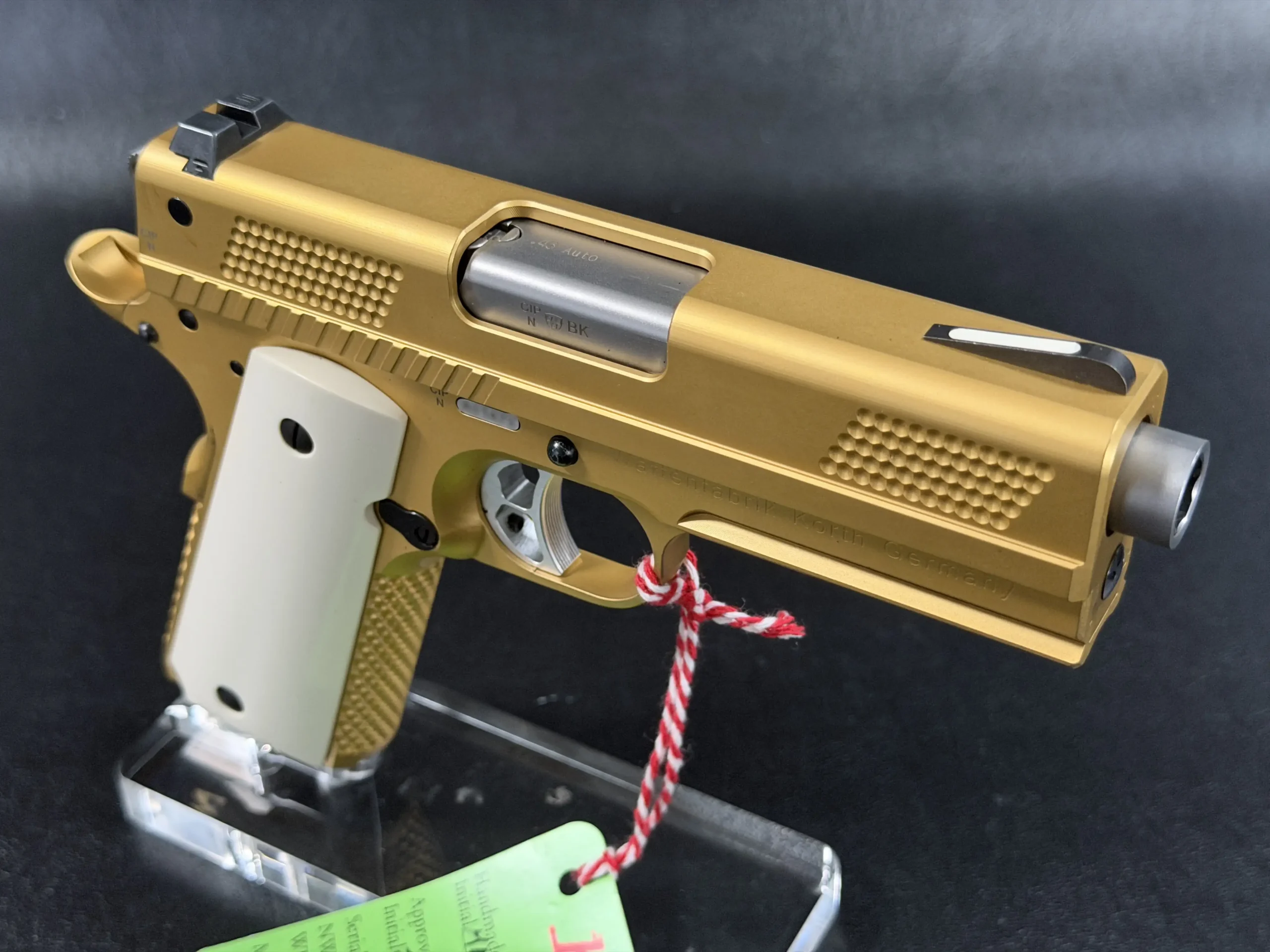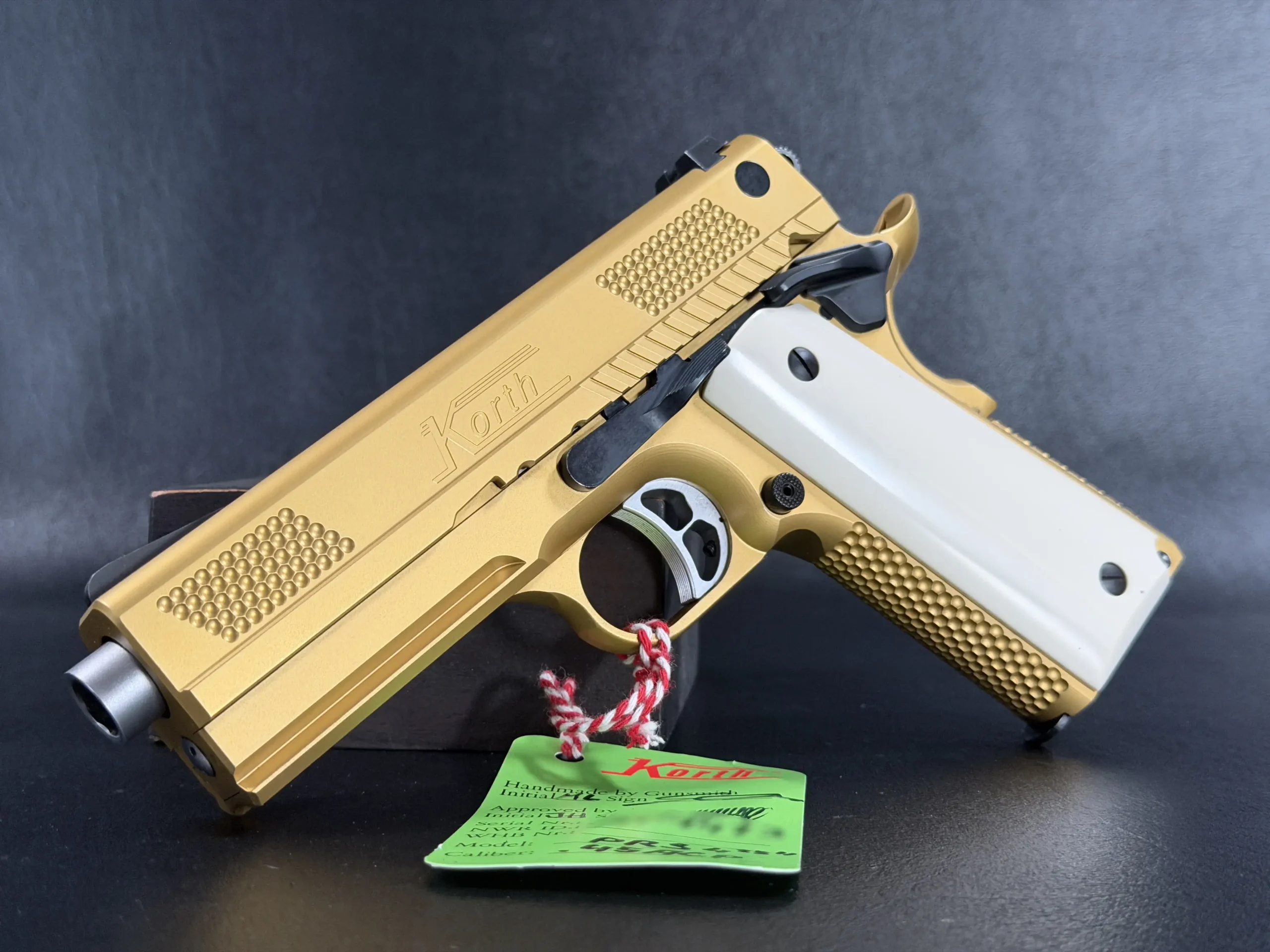 Fitted with white faux ivory grips, the contrast is striking but measured. The grips soften the visual weight of the gold finish while reinforcing the pistol’s classic lineage, an understated nod to traditional European sporting arms, executed in a thoroughly modern form. Every component is matched correctly, reinforcing the sense of cohesion and intentional build quality that defines Korth.