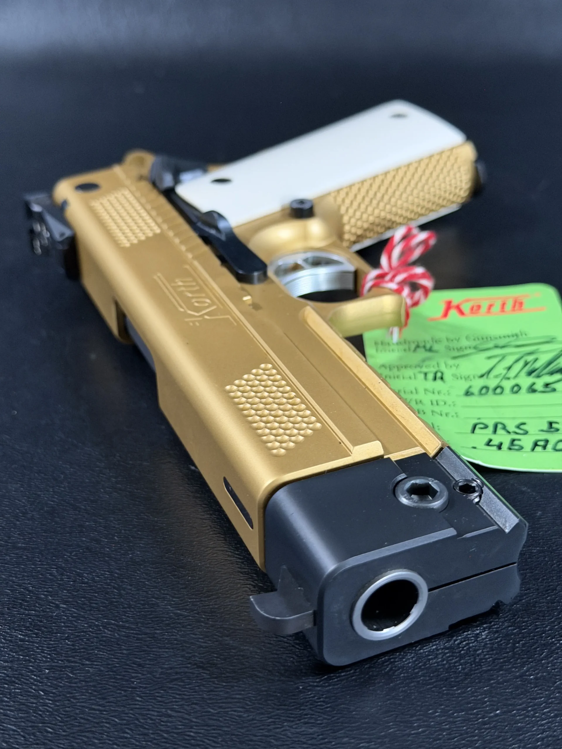 Chambered in .45 ACP, the PRS platform brings competition-bred refinement to a semi-automatic format that feels unmistakably Korth. The five-inch configuration offers a purposeful balance, long enough to emphasize accuracy and control, yet compact enough to retain an elegant profile. The black barrel weight provides a subtle but deliberate contrast, anchoring the gold finish while adding both functional stability and visual depth.