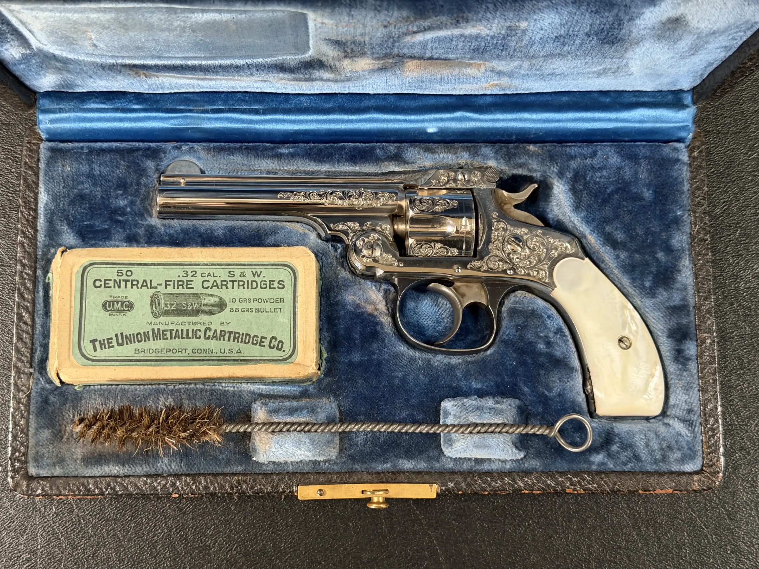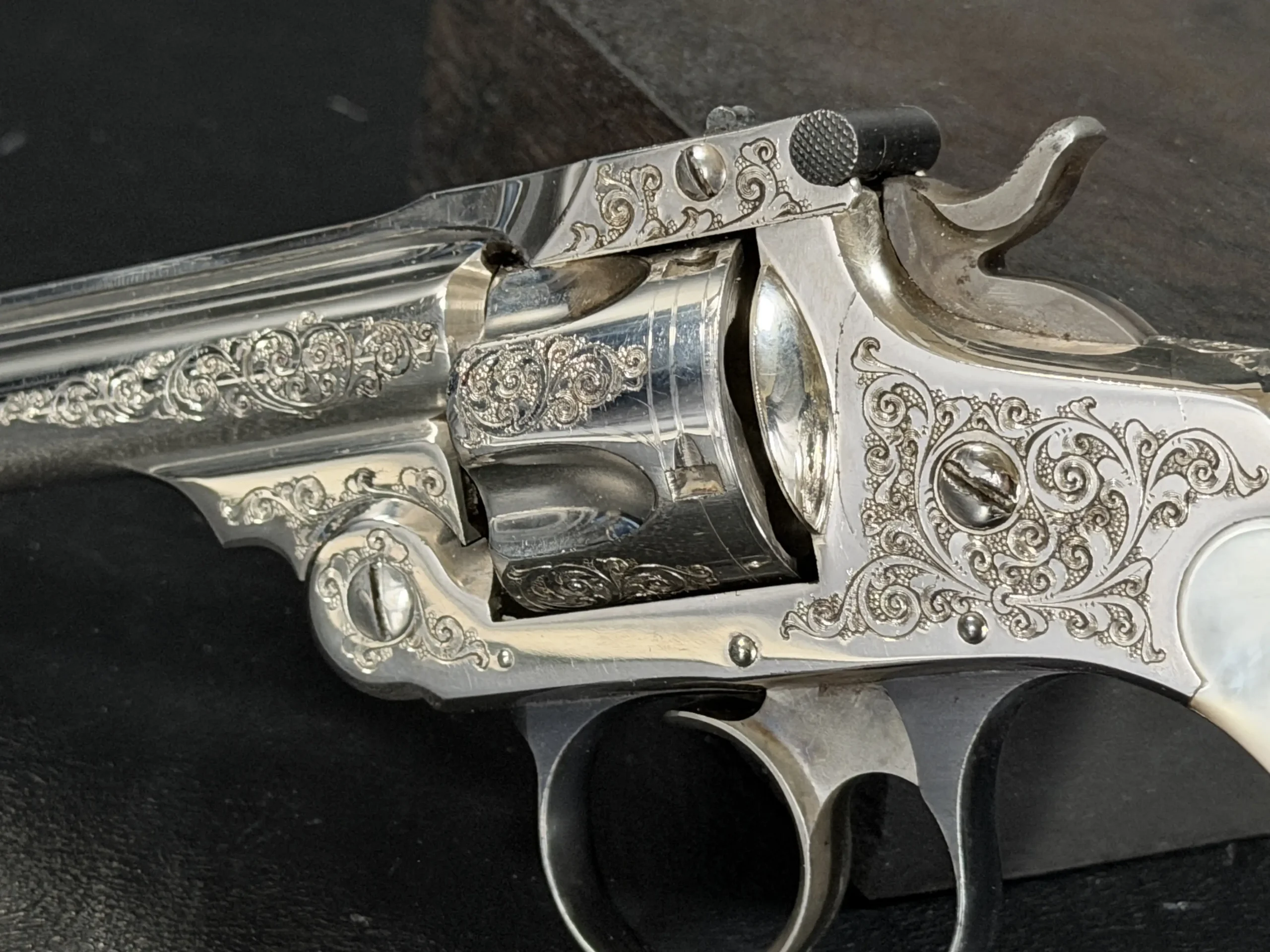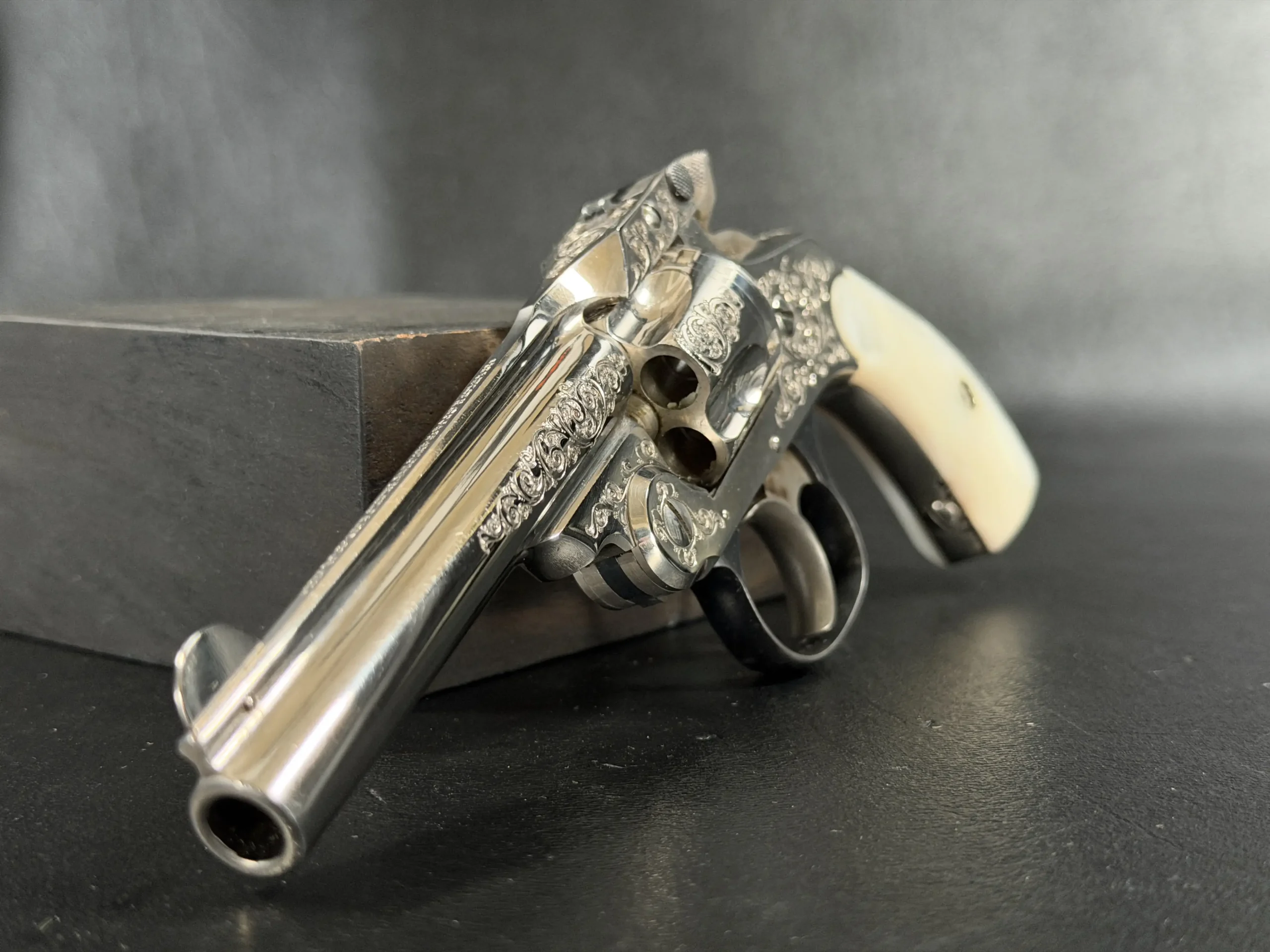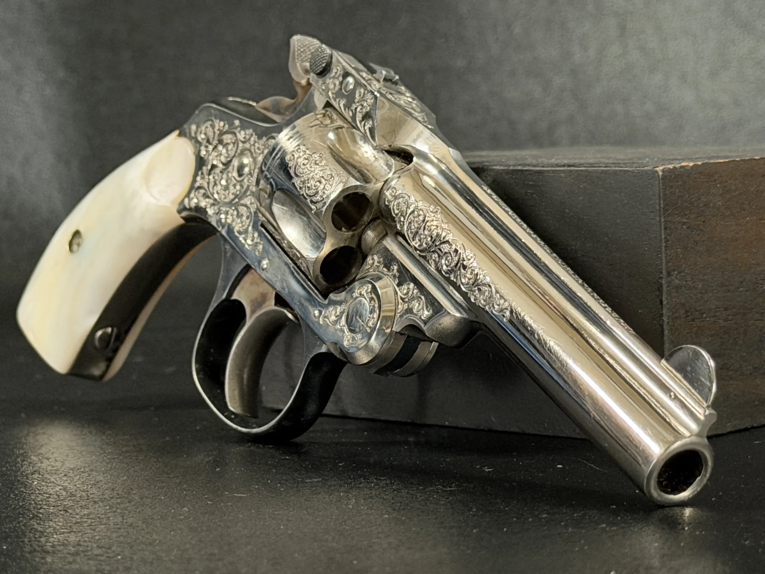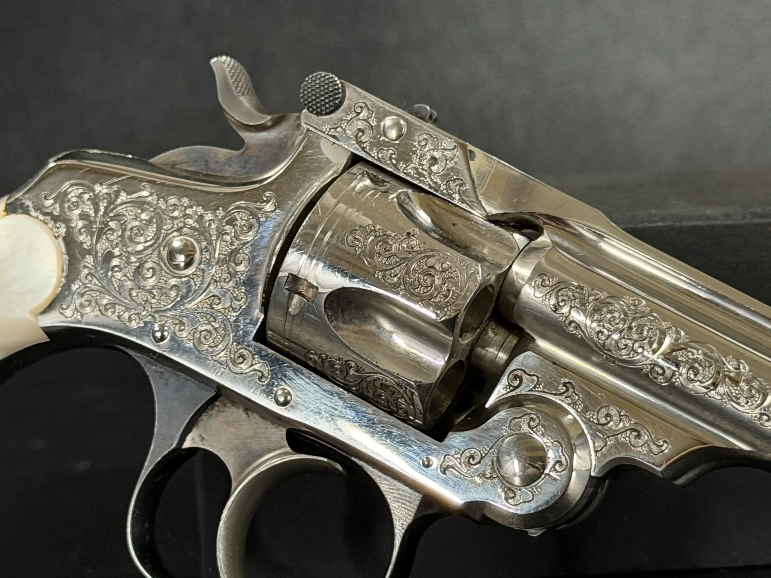 A factory-engraved Smith & Wesson .32 Double Action Fourth Model, attributed to the legendary Gustave Young, whose work remains among the most recognizable and sought-after in American firearms history. His signature style is unmistakable: tight, flowing scrollwork with a natural rhythm that seems almost alive across the revolver’s surface.