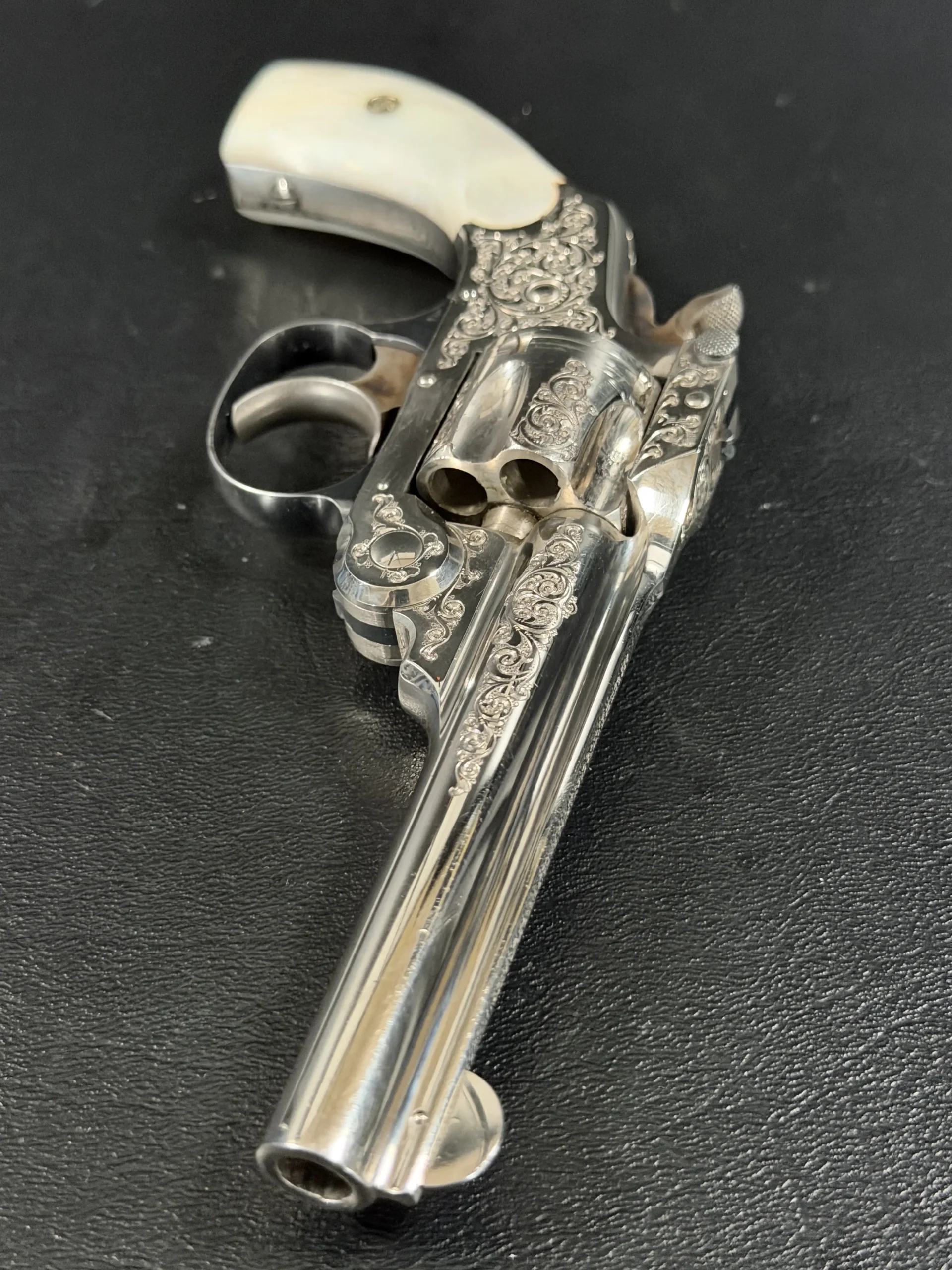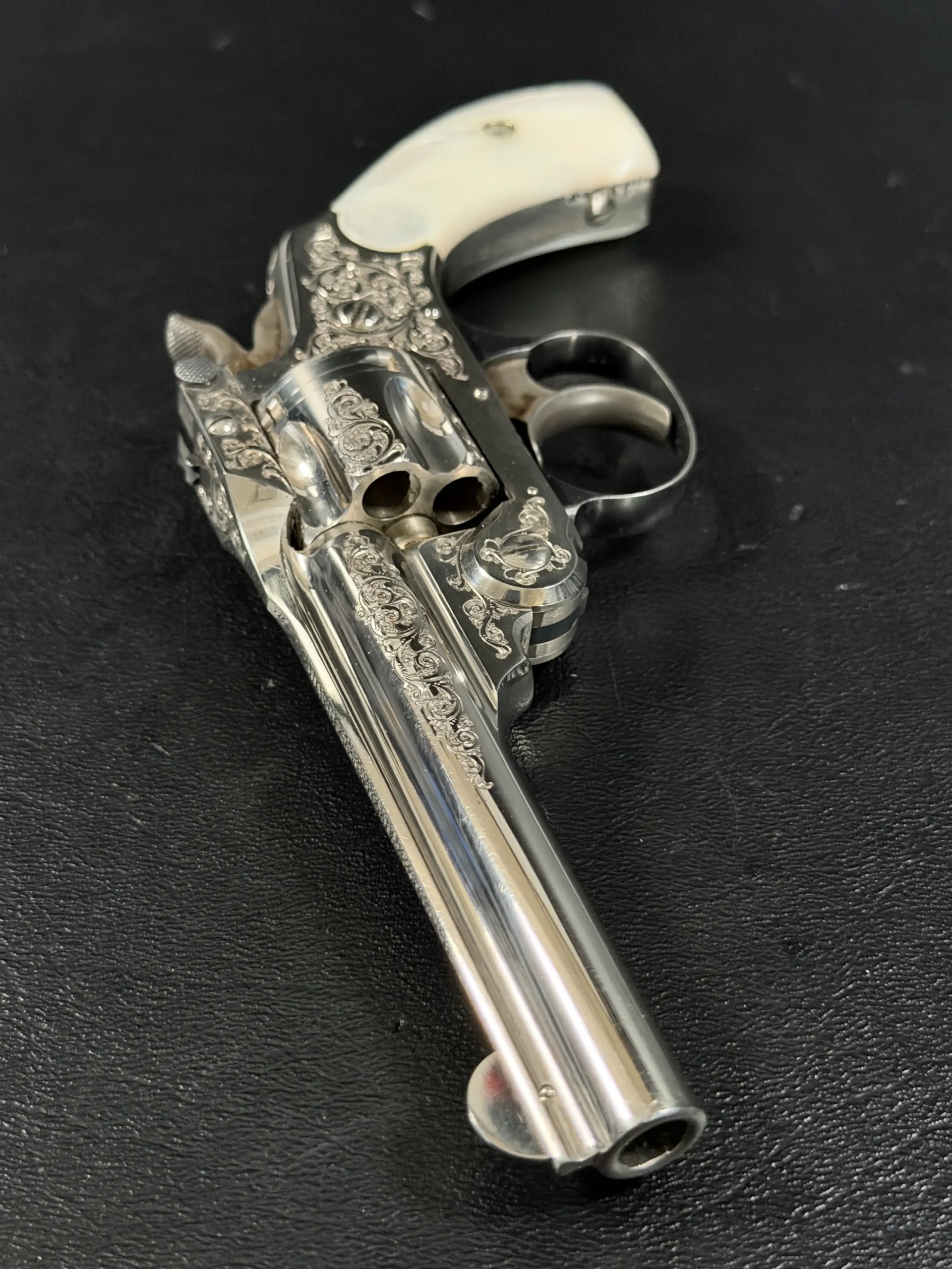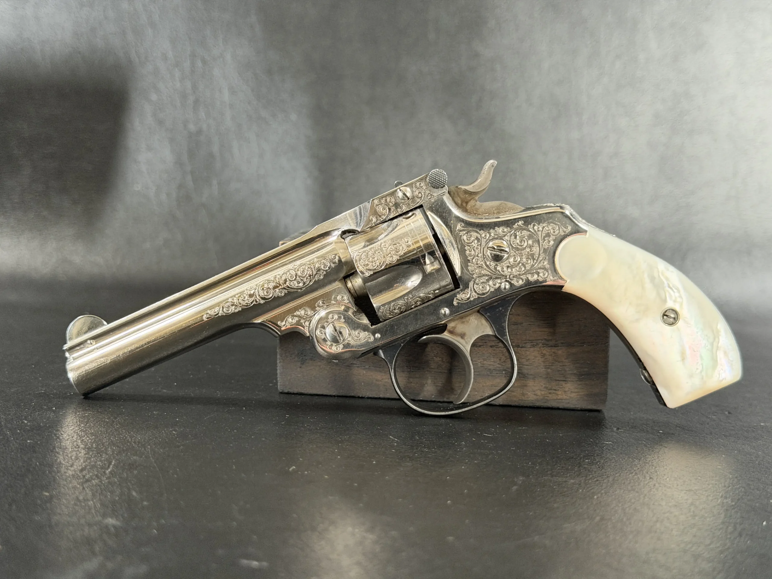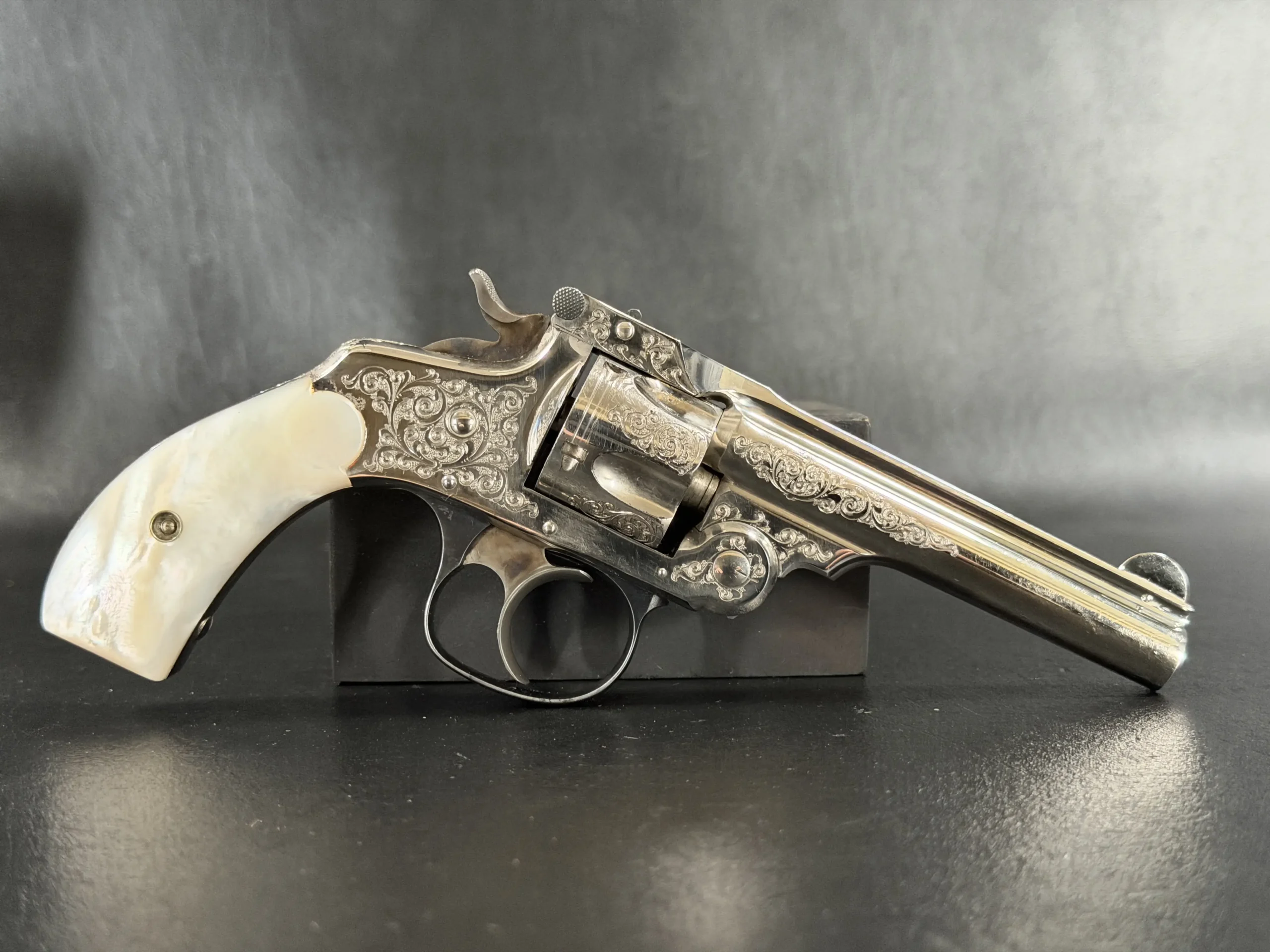 A factory-engraved Smith & Wesson .32 Double Action Fourth Model, attributed to the legendary Gustave Young, whose work remains among the most recognizable and sought-after in American firearms history. His signature style is unmistakable: tight, flowing scrollwork with a natural rhythm that seems almost alive across the revolver’s surface.