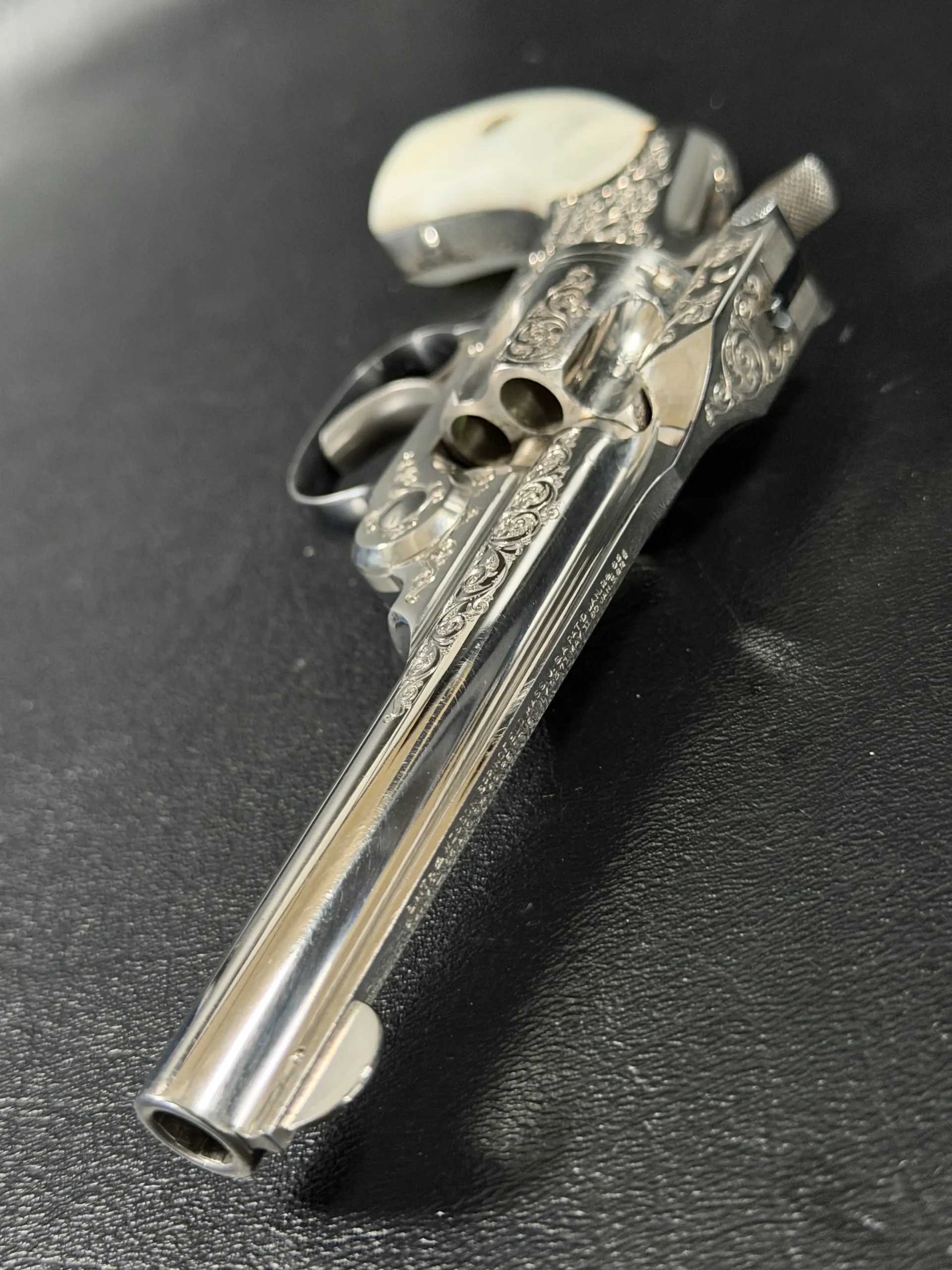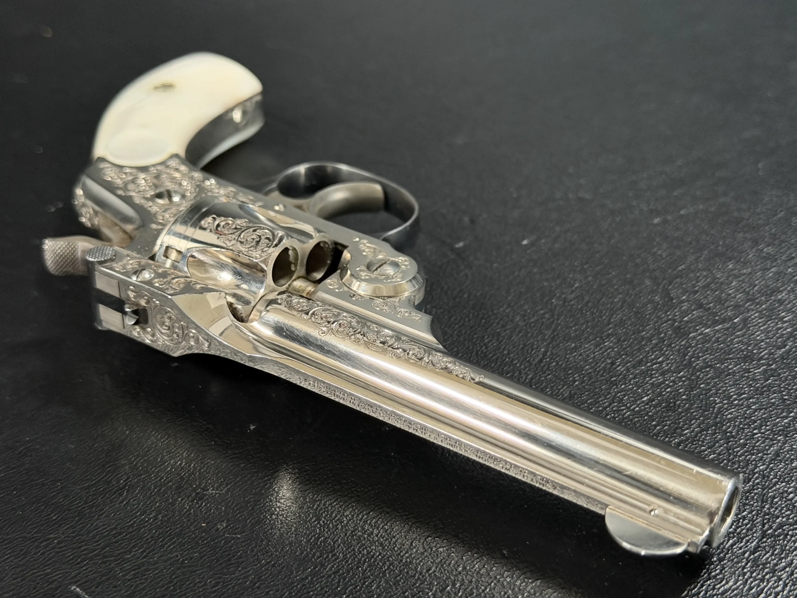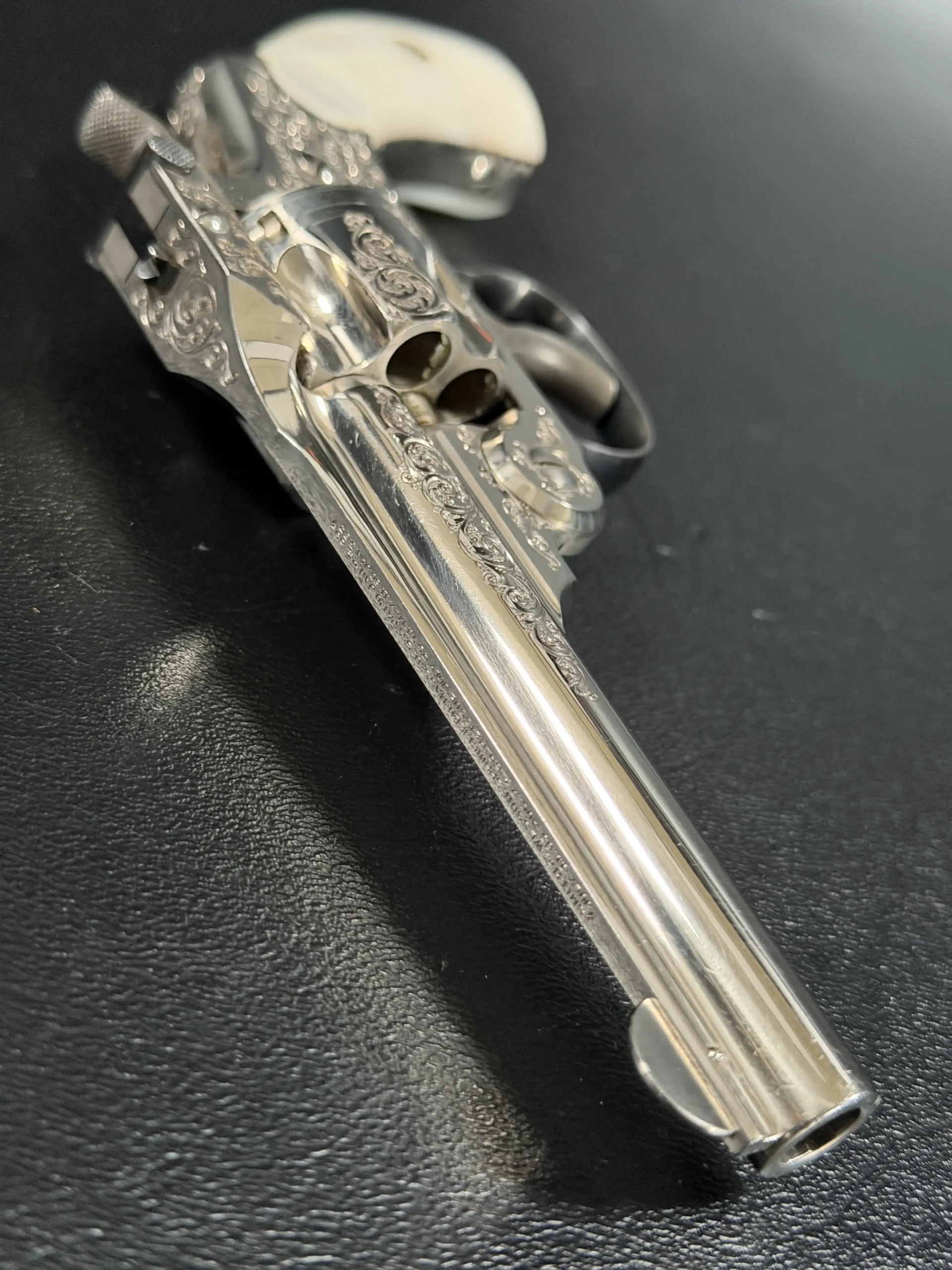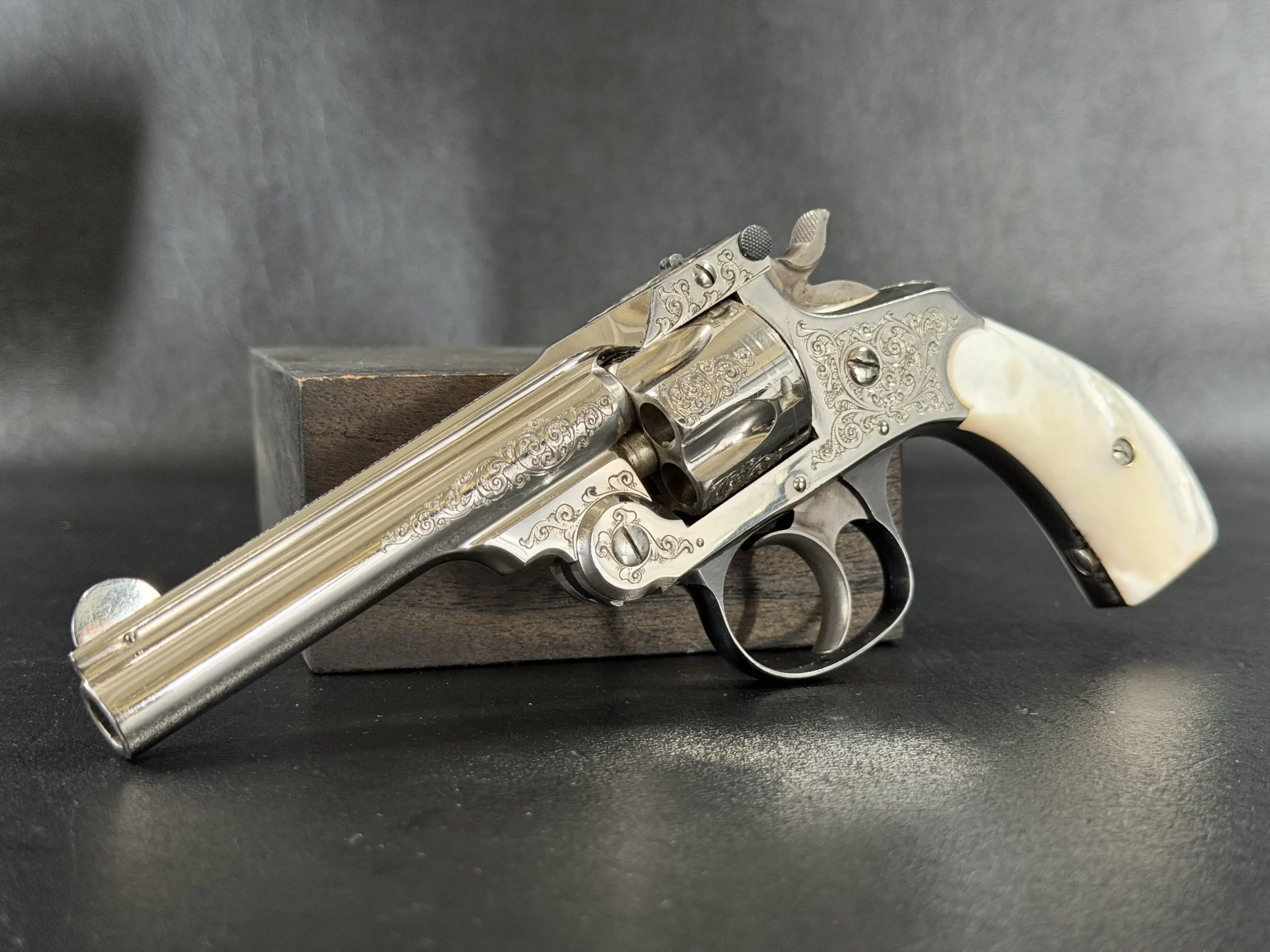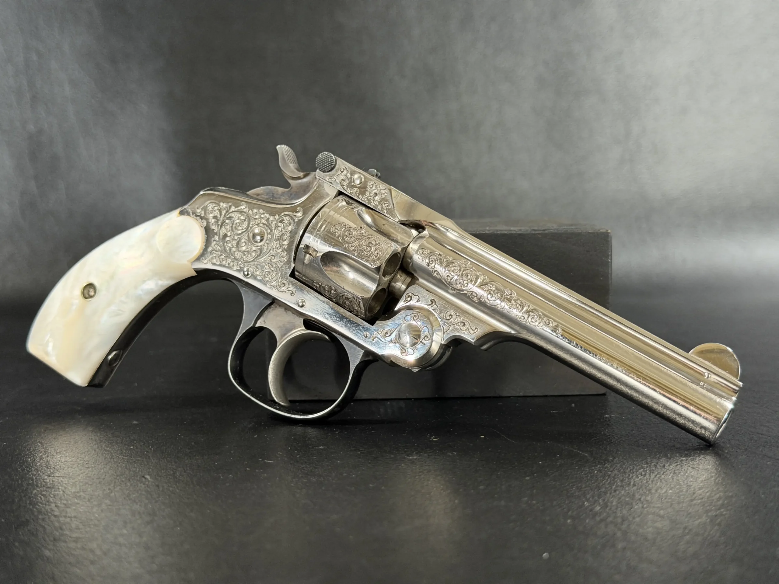 A factory-engraved Smith & Wesson .32 Double Action Fourth Model, attributed to the legendary Gustave Young, whose work remains among the most recognizable and sought-after in American firearms history. His signature style is unmistakable: tight, flowing scrollwork with a natural rhythm that seems almost alive across the revolver’s surface.